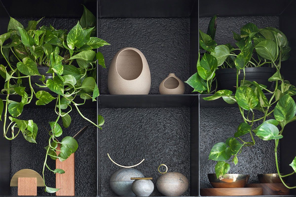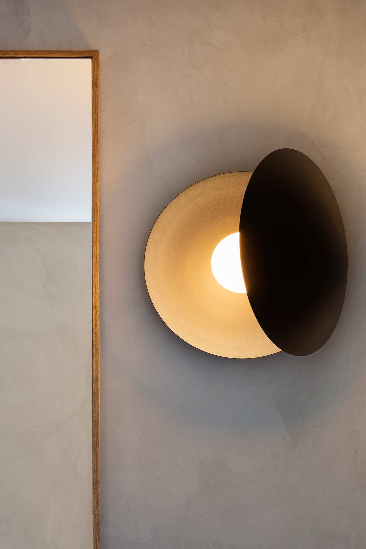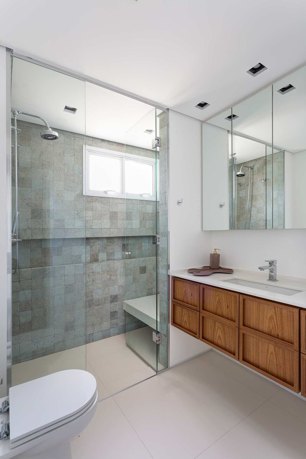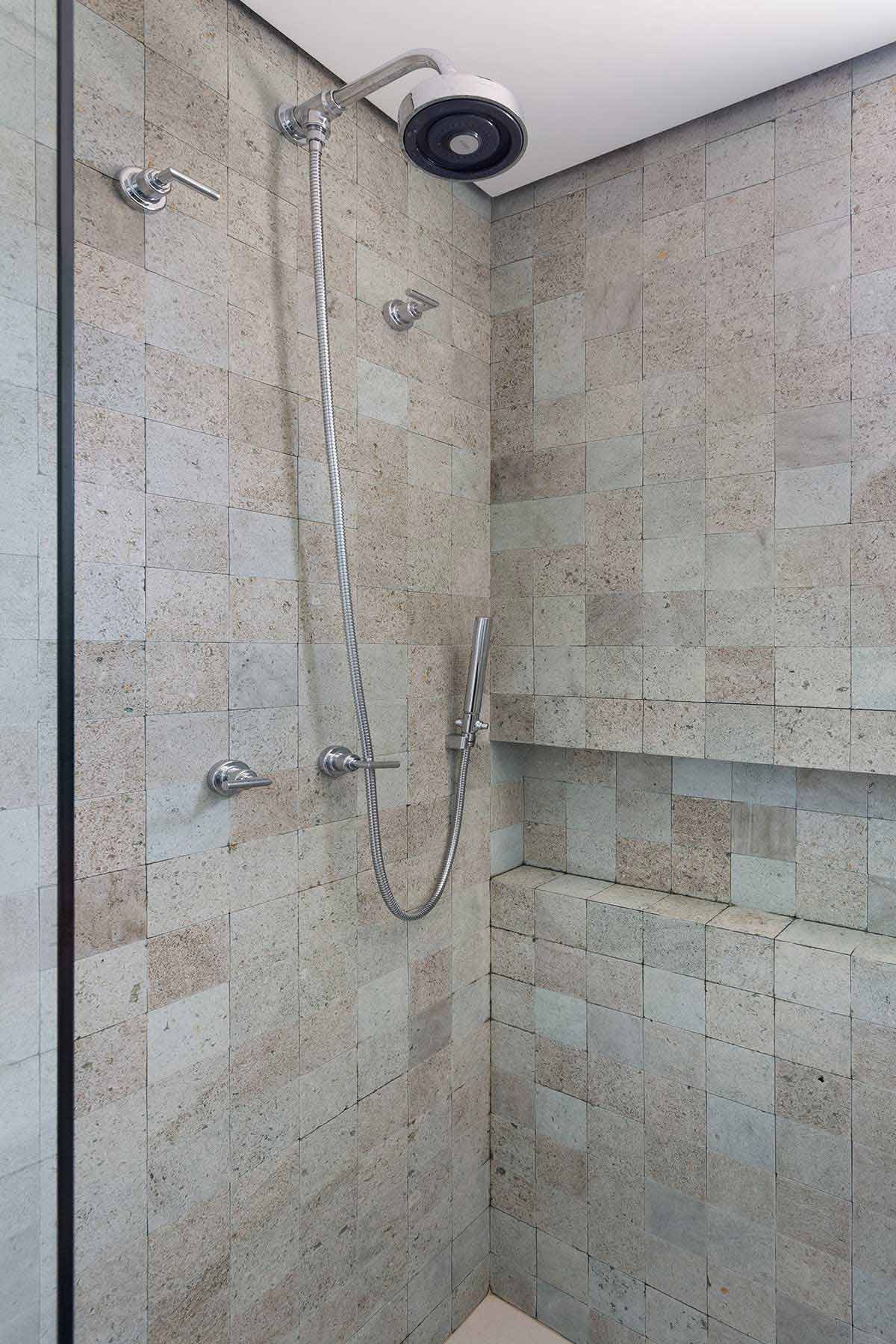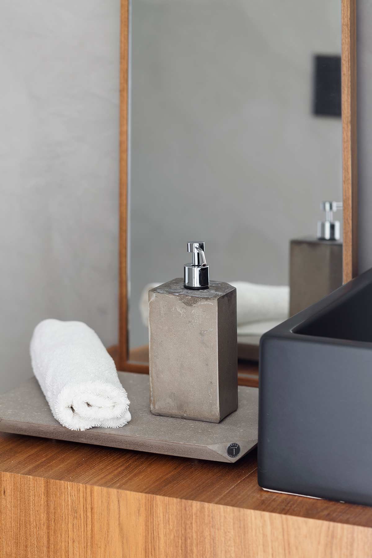 Na parte interna, o lavabo segue o estilo industrial, pelo uso do cimento queimado das paredes, louças e metais pretos e a luminária Ostra da 8e8 Design feita para a Itens, que conta com uma estrutura metálica e uma luz delicada. O quarto da suíte master recebeu uma paleta neutra, aquecida pelas texturas dos materiais presentes no mobiliário e objetos de decoração; e o banheiro, tornou-se o lugar de relaxamento dos clientes, através da utilização de materiais naturais, como a pedra vulcânica hijau nas paredes.