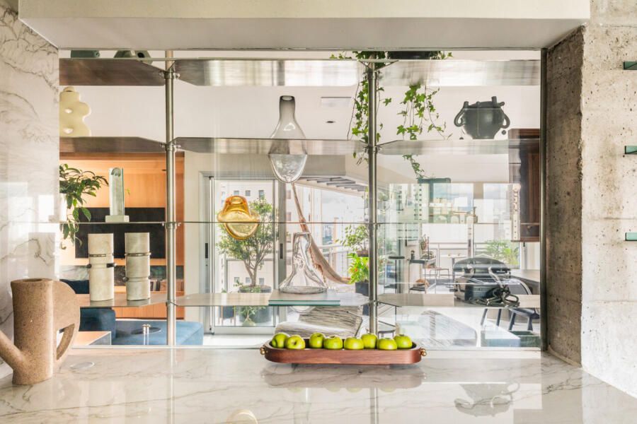 A área social foi totalmente integrada. Sala de estar, jantar e cozinha se conectam visualmente através de uma estante de aço inox, que atravessa todo o espaço e chega até a suíte master. Para garantir privacidade, sem perder a sensação de amplitude, o projeto apostou no uso de divisórias em vidro. Esse recurso permite a passagem de luz natural, além de proporcionar isolamento acústico e bloquear odores.