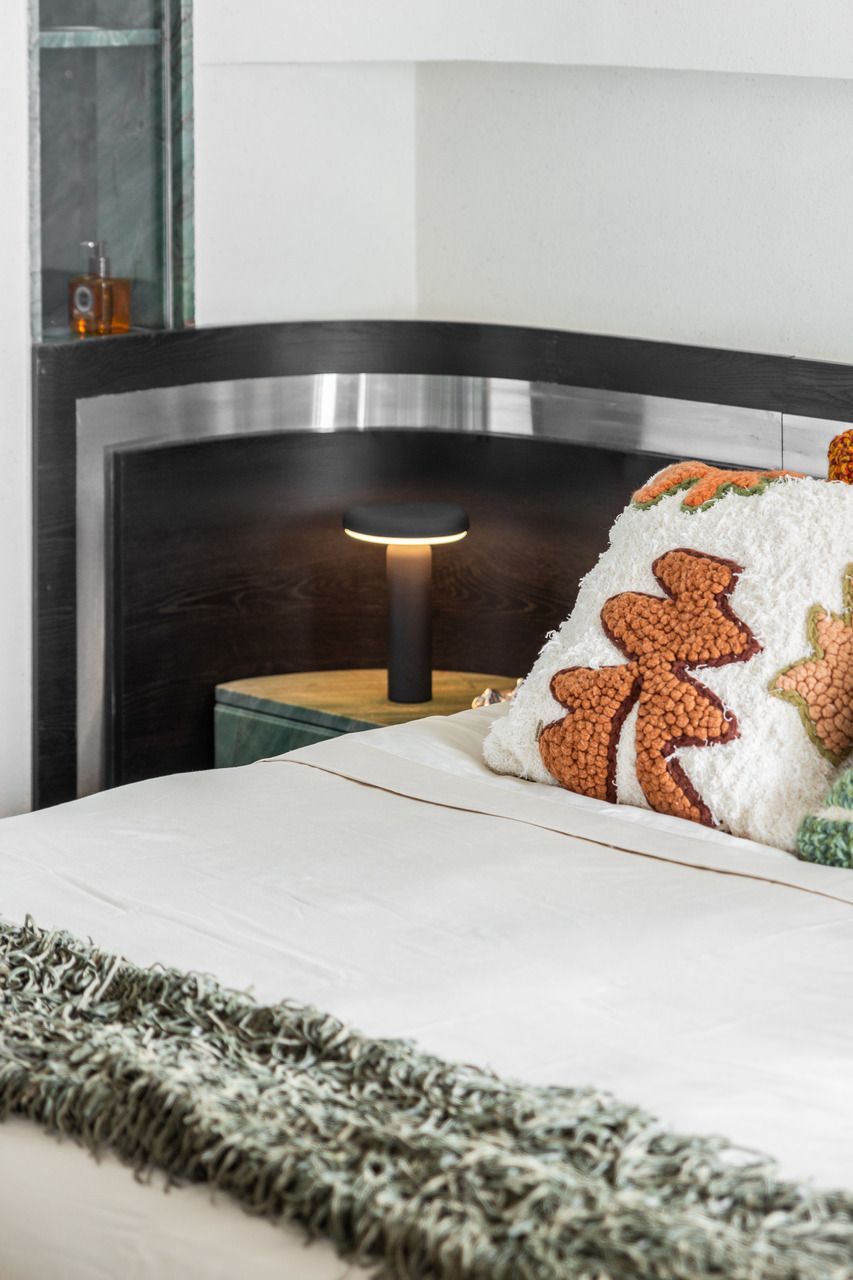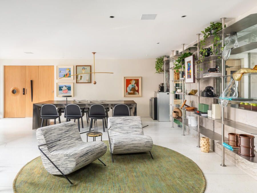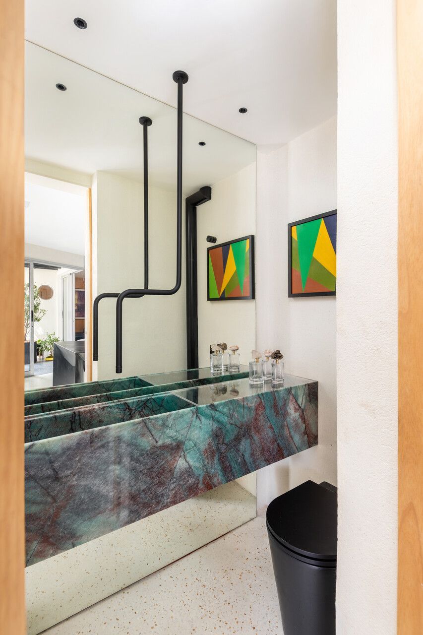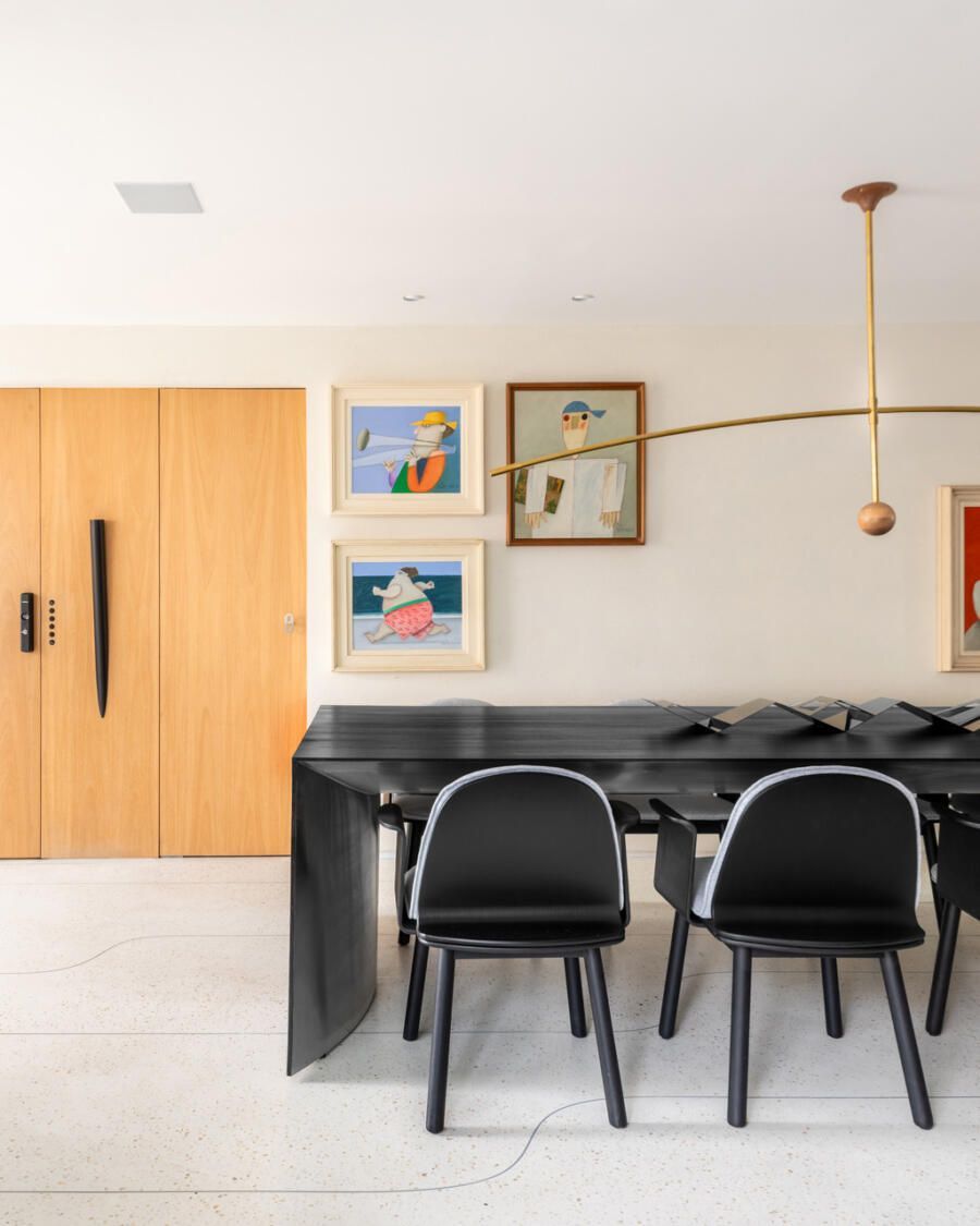 A personalização também foi um ponto forte. A mesa de jantar, batizada de Mesa Arcos, foi desenhada especialmente para o projeto. Com três metros de extensão e apenas dois apoios, ela combina madeira ebanizada na parte externa e aço inox escovado na parte interna. Outro elemento exclusivo foi a bica de teto criada para o lavabo, que trouxe um toque de originalidade e inovação ao espaço.