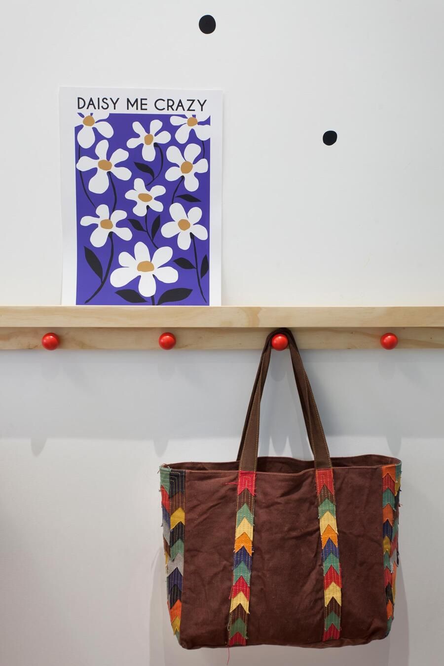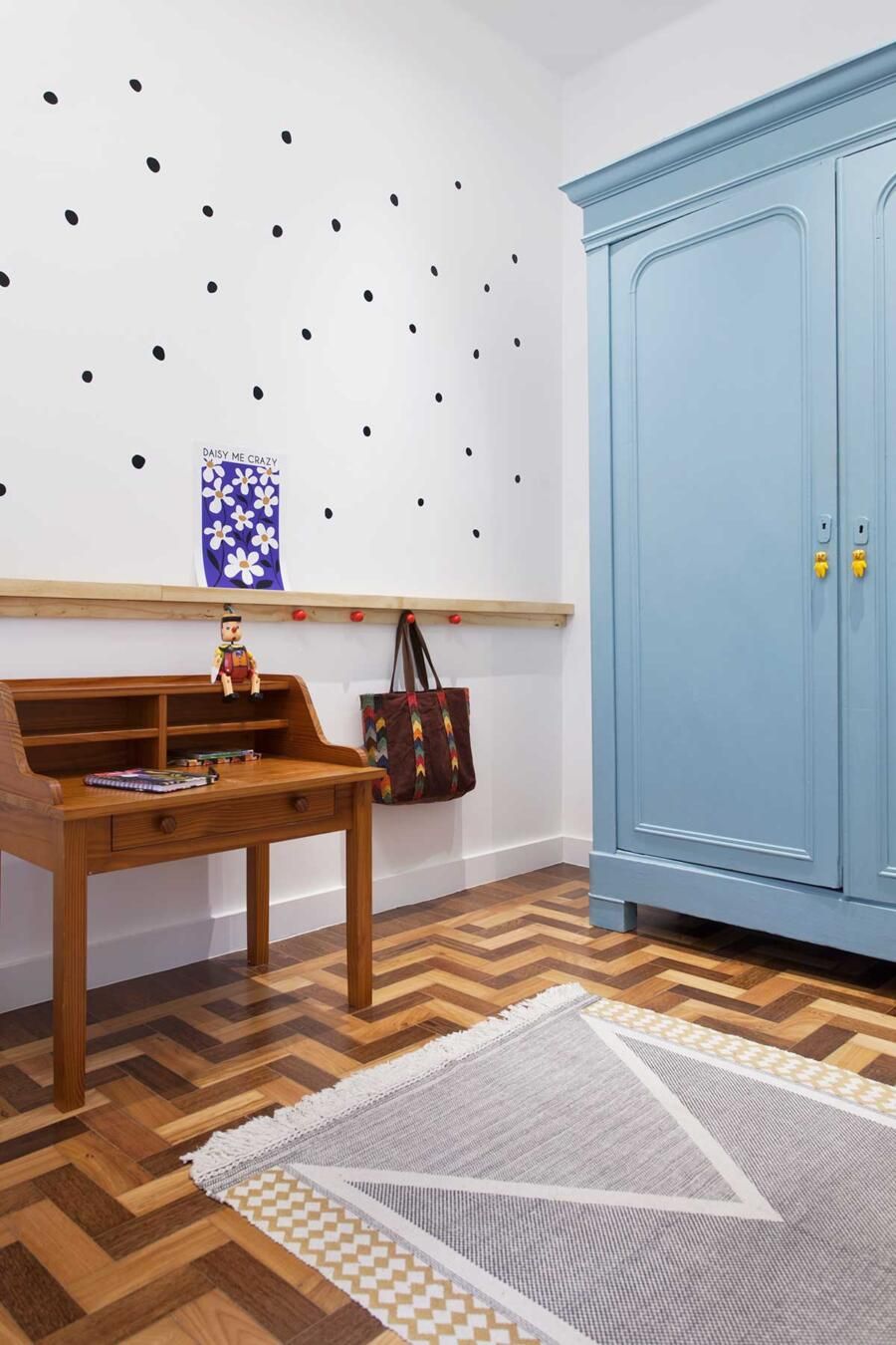 Na parede, foi instalada uma régua de madeira criando uma estante de livros com ganchos para as mochilas e bolsas. Soluções simples e encantadoras.