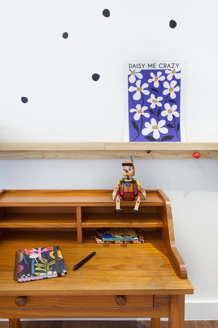 Detalhes simples e que se tornaram charmosos podemos observar no quarto infantil, como por exemplo, a escrivaninha. A mesma que é herança de família e estava sem uso, teve seus pés cortados e se tornou uma escrivaninha repleta de memória afetiva. Super criativo e linda!