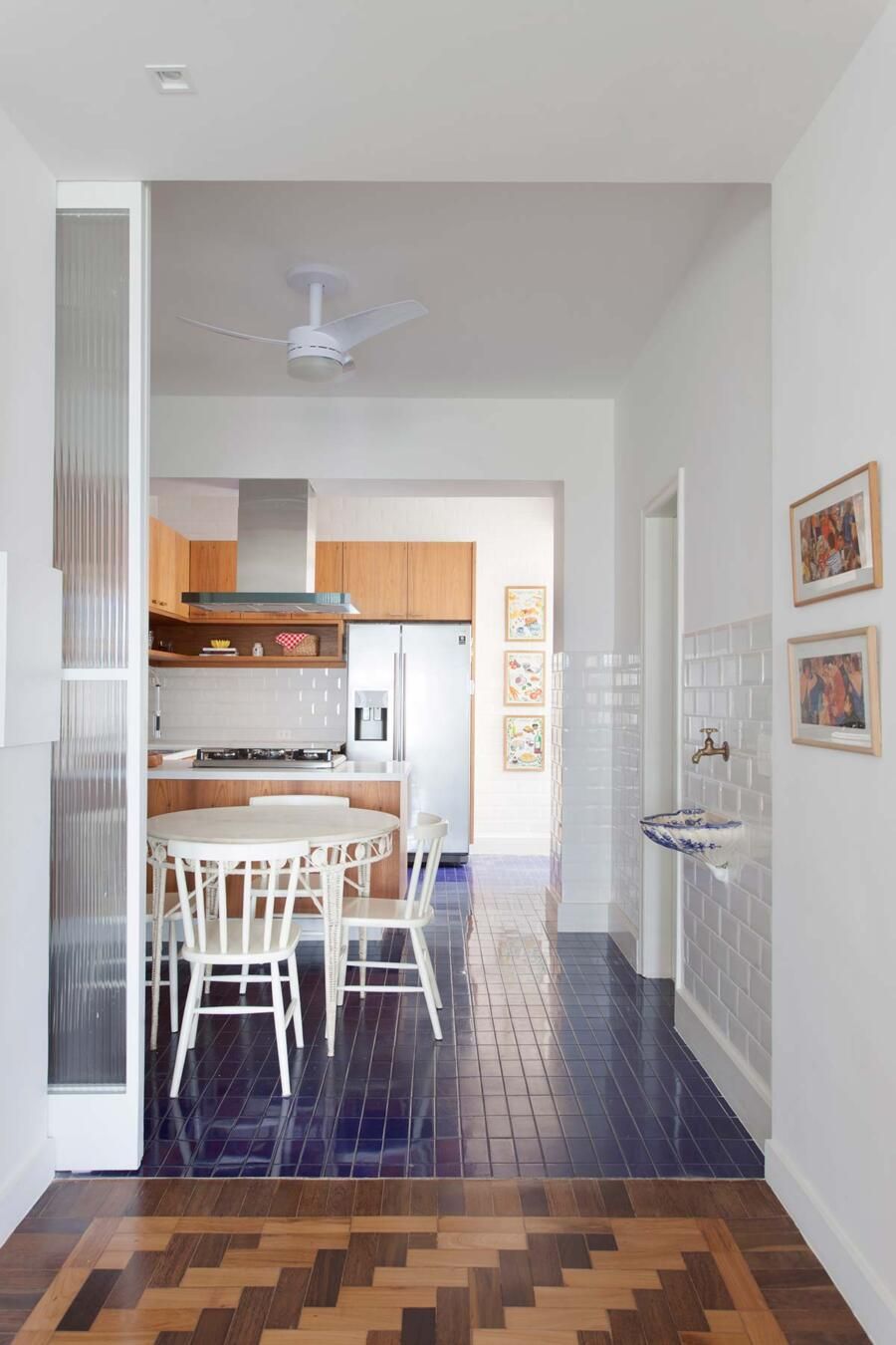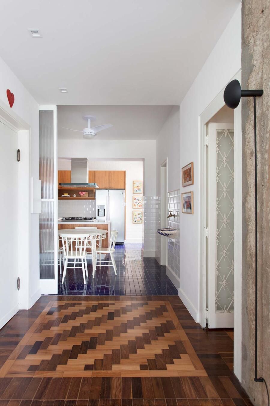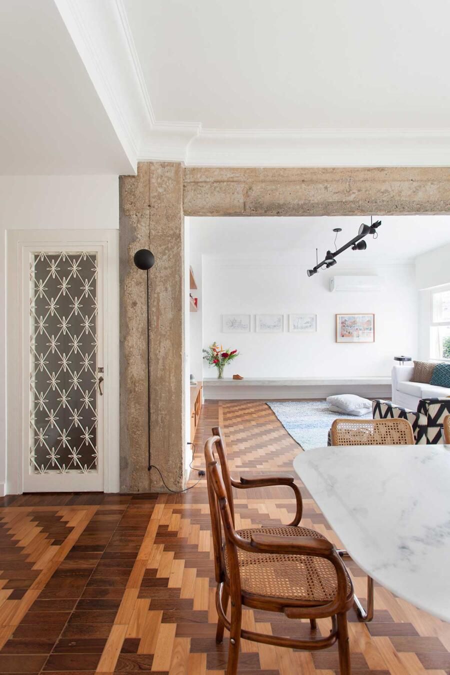“O destaque deste lindo apê são suas características originais que foram restaurados, tais como: revestimentos e esquadrias existentes que apresentavam potenciais estéticos e funcionais, porém estavam pouco valorizados.”