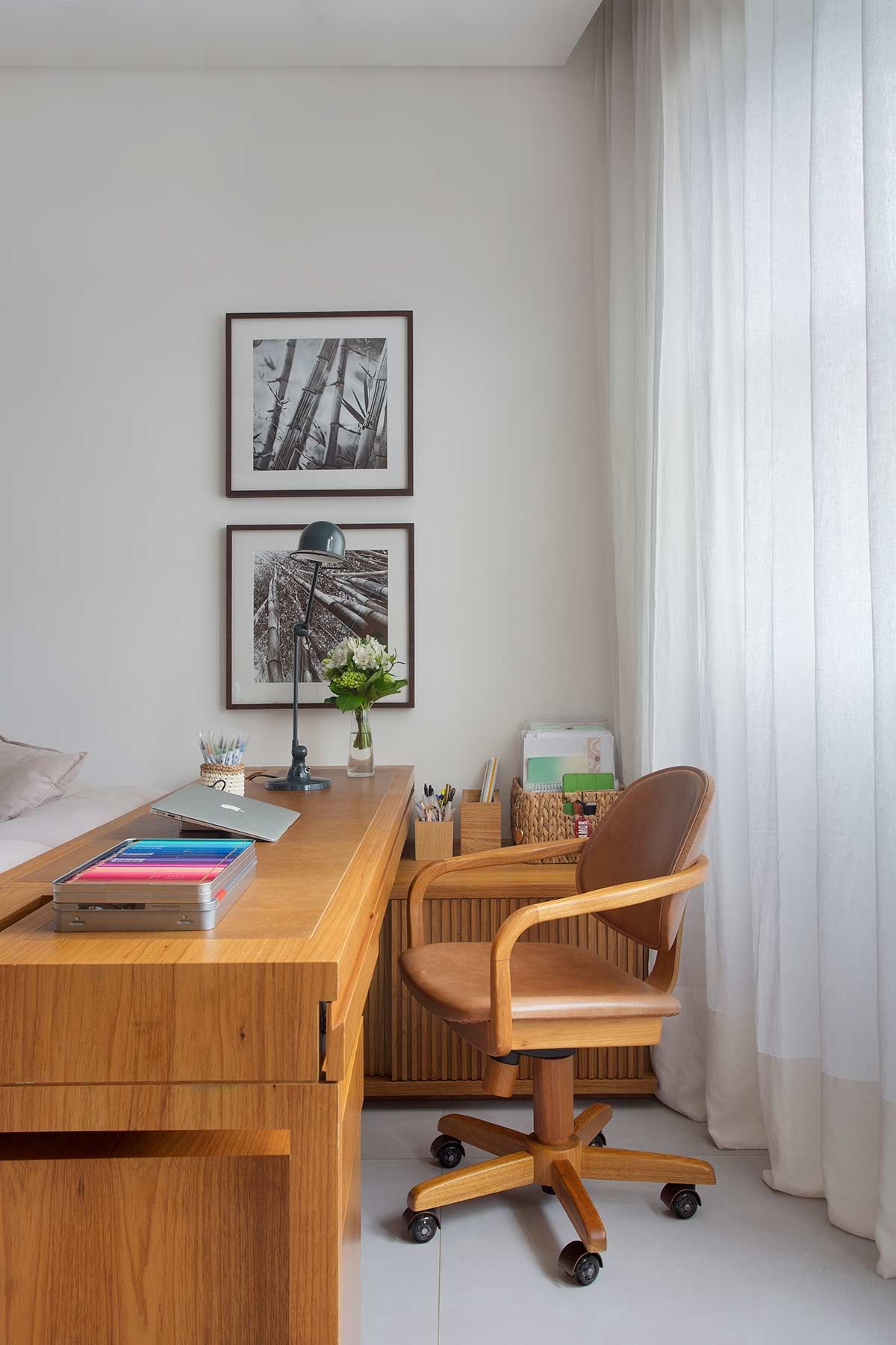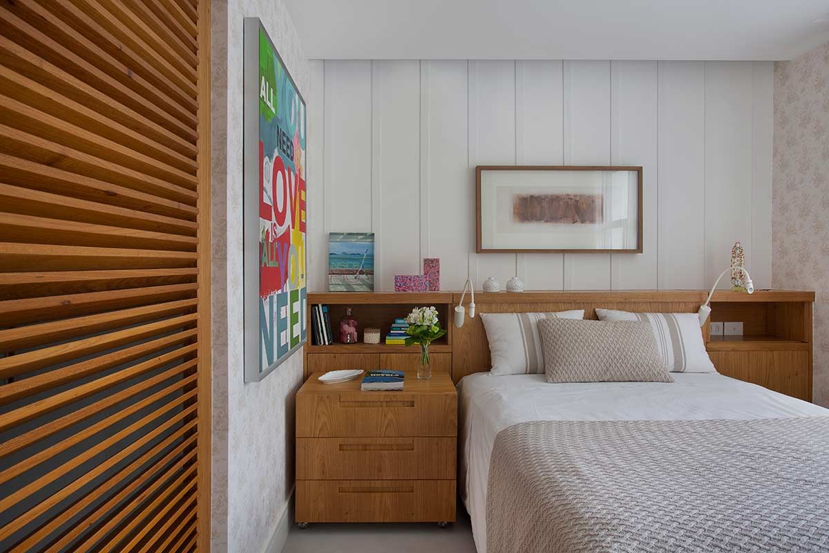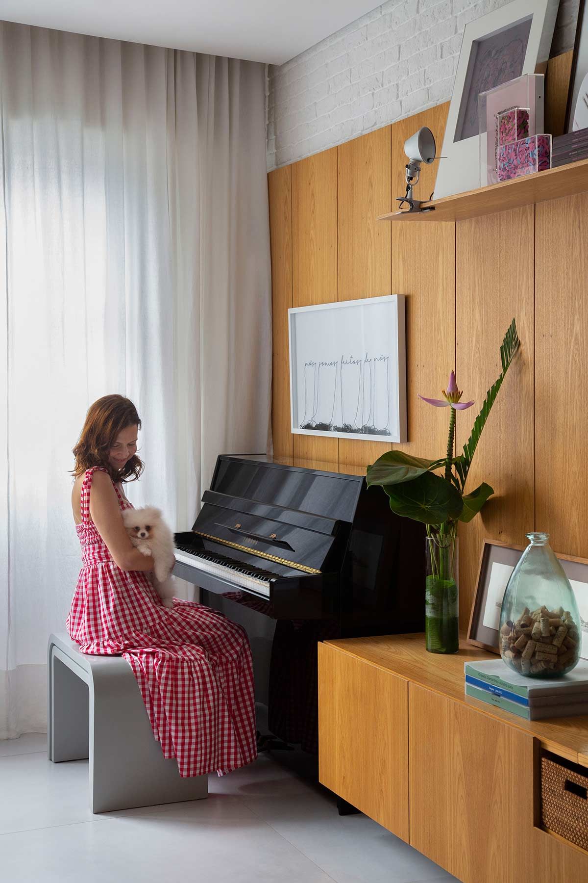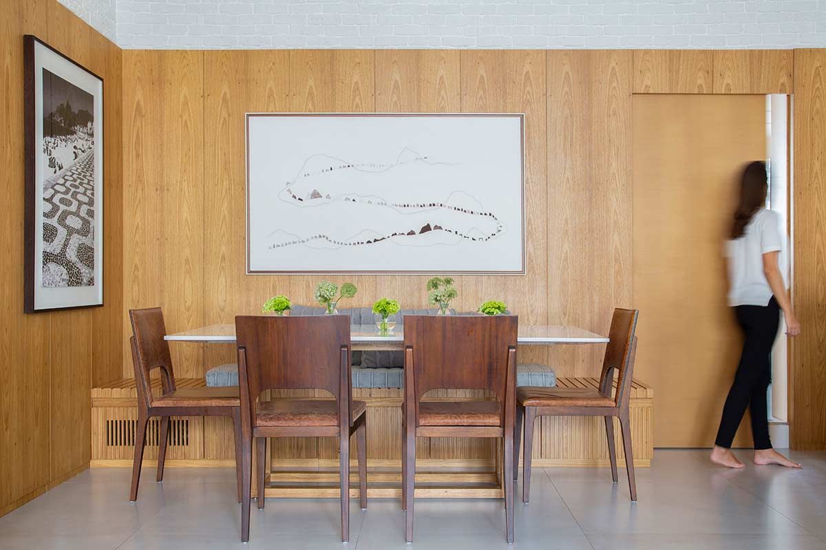A cliente na faixa dos 50 anos vive com suas filhas neste apartamento no Leblon e é amiga de muitos anos das arquitetas do Brise Arquitetura, responsáveis por essa reforma. Como o imóvel era antigo, o escopo do projeto incluiu pedidos que imprimisse a personalidade da moradora, como uma suíte para ela e cada filha; closet espaçoso; sala e cozinha integrada para receber; e um espaço multiuso com direito a escritório e piano – instrumento que ela adora e que serviu como base do desenho de toda a marcenaria da área social.
