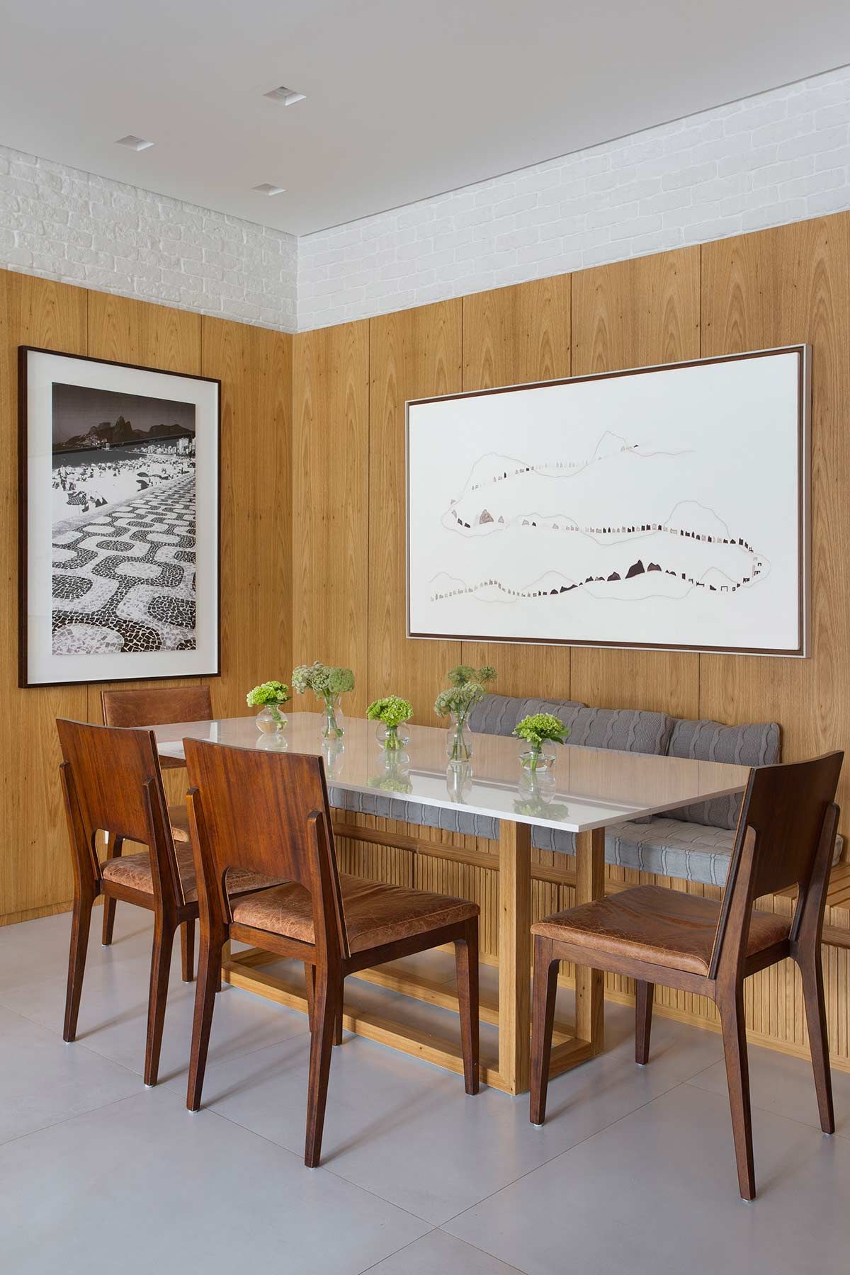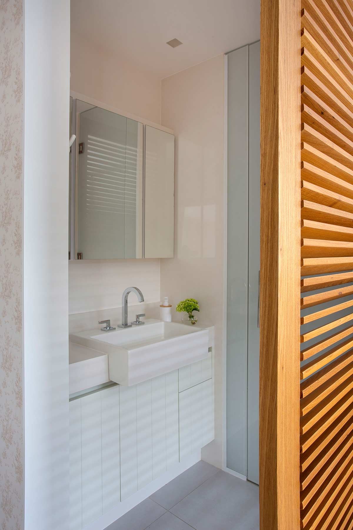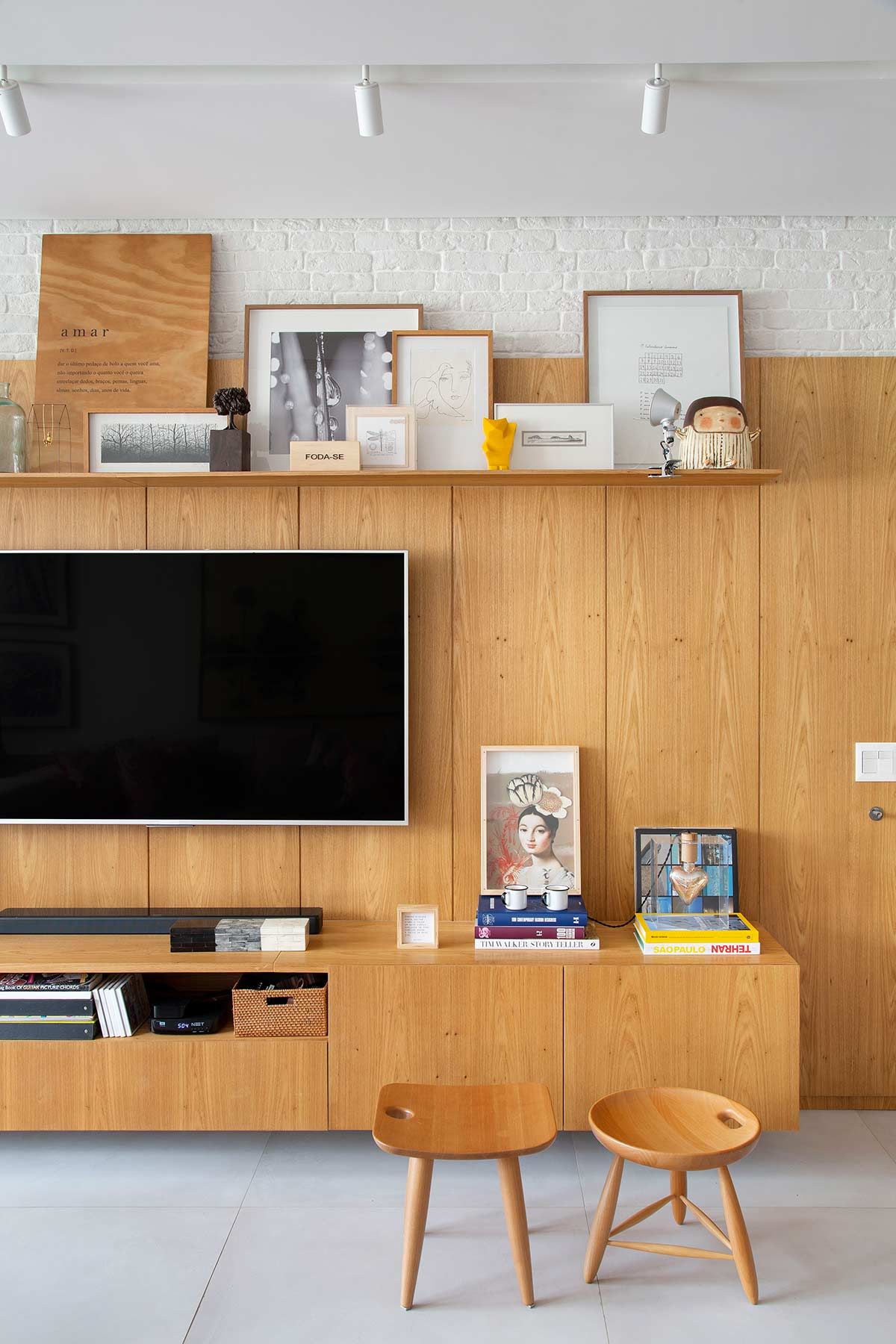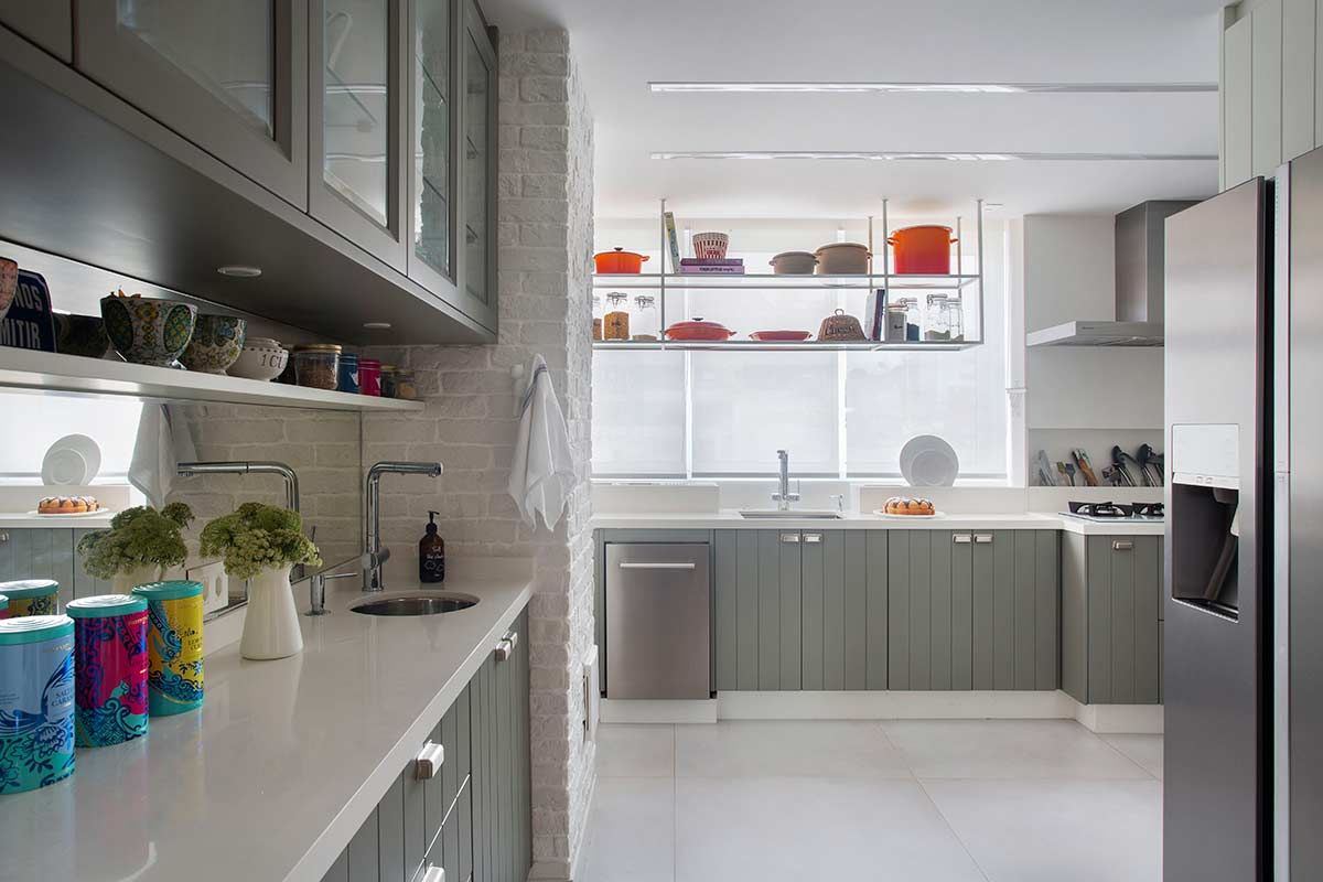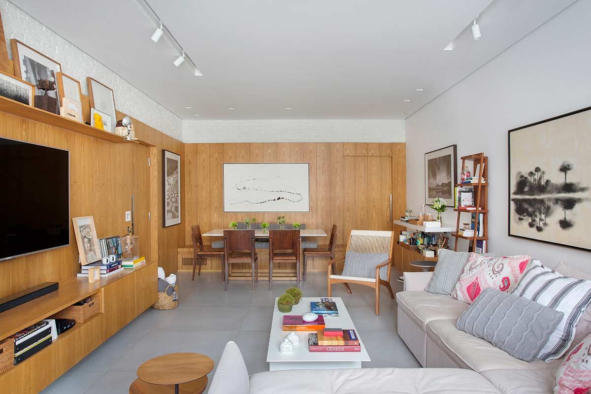 A cozinha agora é o coração do apê, com armários na cor fendi que abrigam os muitos acessórios de cozinha da moradora e uso do mesmo revestimento do estar, um tijolinho a vista branco. Por se tratar de um imóvel compacto, optou-se por um porcelanato cinza no piso de todos os cômodos, criando uma unidade estética e sensação de amplitude. Na sala, um lambri de carvalho em formato de L abriga a TV, prateleira, o banco da mesa de jantar e camufla a porta de correr que dá acesso à cozinha. Praticamente toda a decoração é nova e a cliente participou ativamente de todas as escolhas, que foram inspiradas em seu gosto para deixar o lar exatamente com a cara e jeito dela.