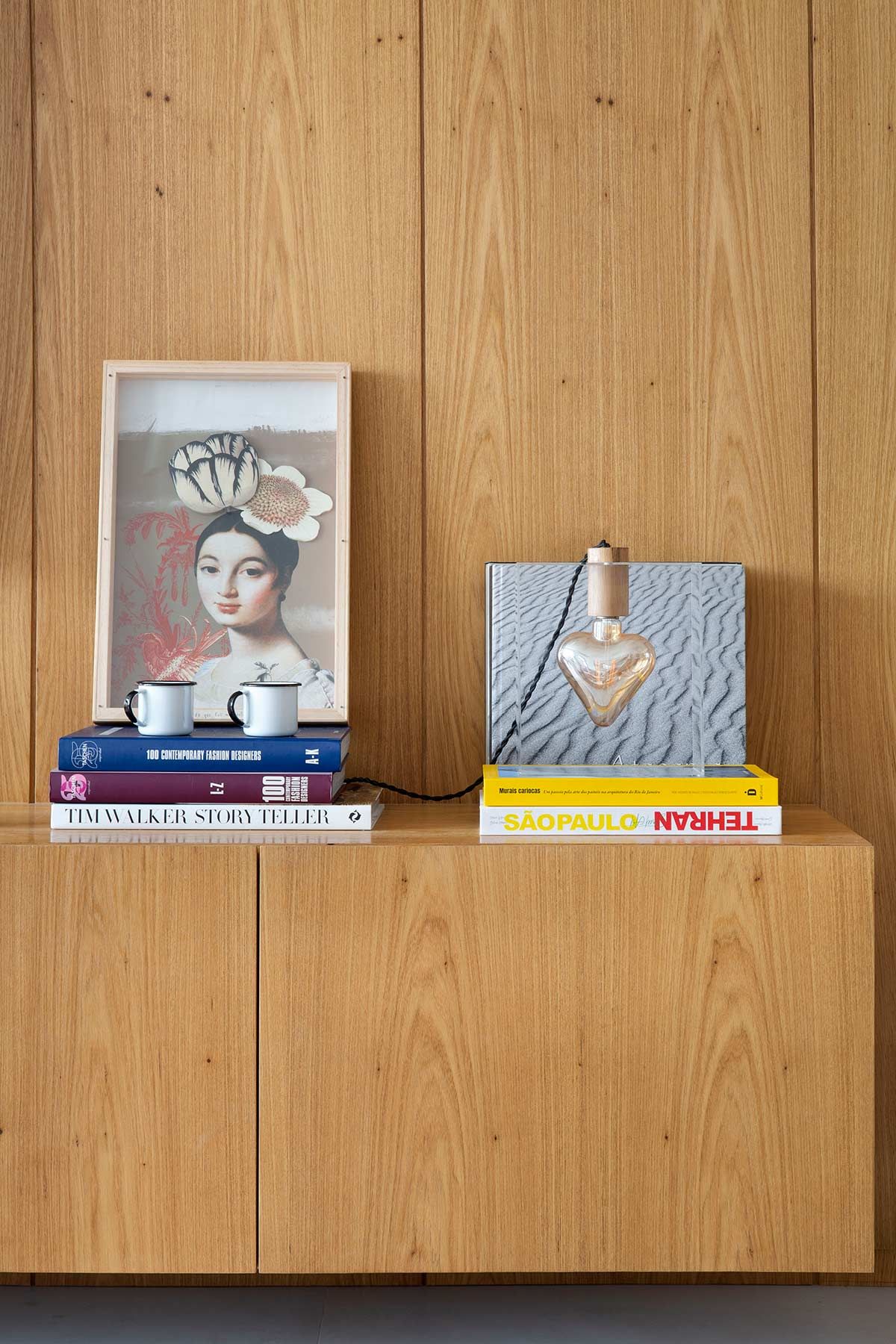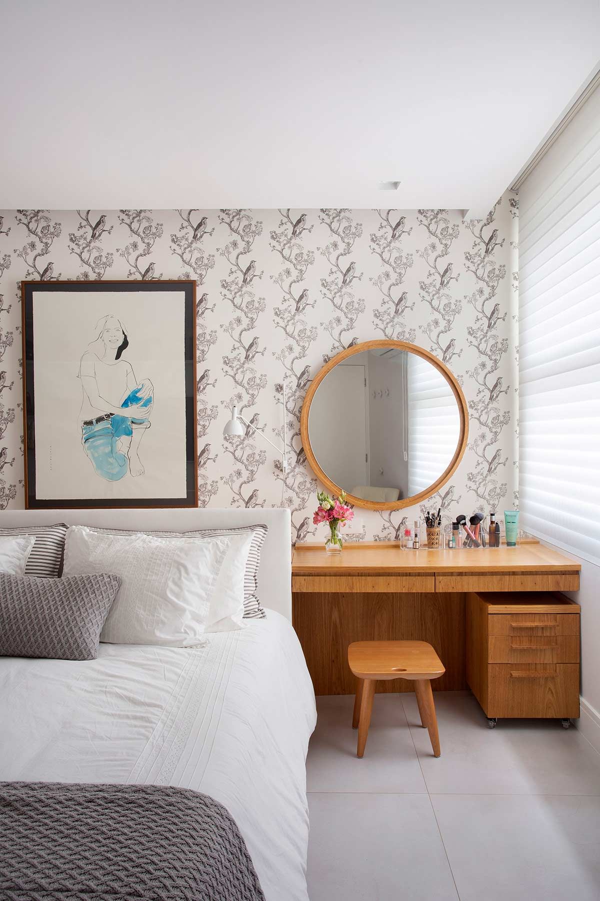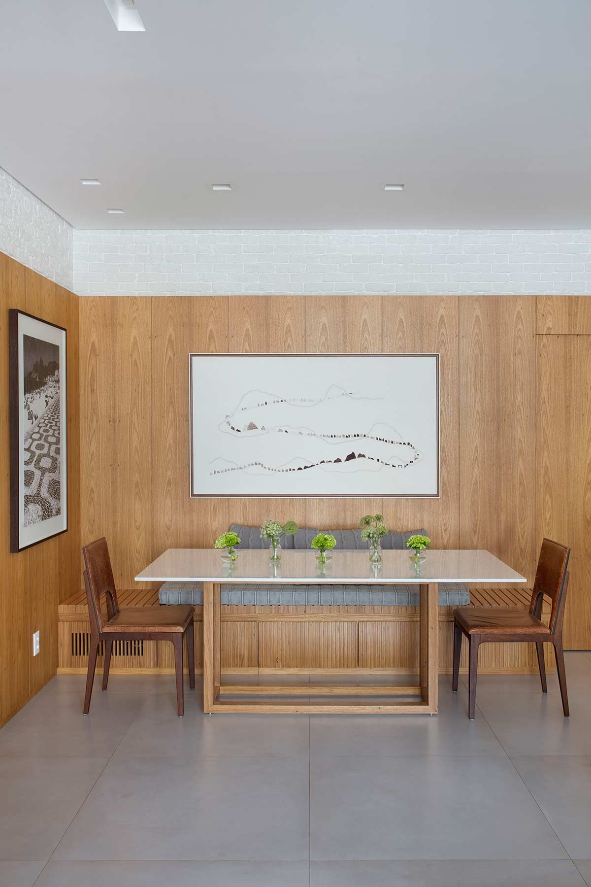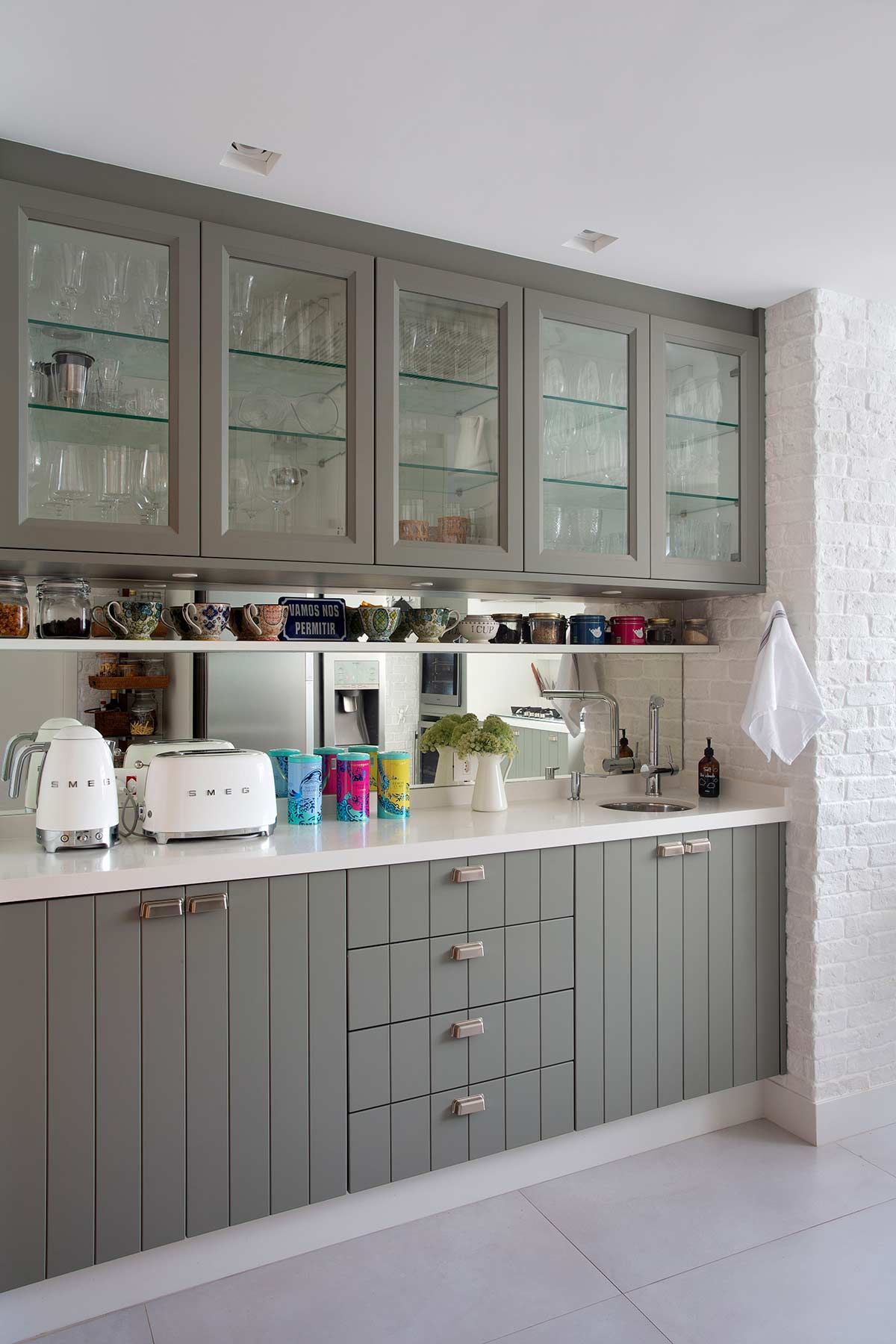 A cozinha agora é o coração do apê, com armários na cor fendi que abrigam os muitos acessórios de cozinha da moradora e uso do mesmo revestimento do estar, um tijolinho a vista branco. Por se tratar de um imóvel compacto, optou-se por um porcelanato cinza no piso de todos os cômodos, criando uma unidade estética e sensação de amplitude. Na sala, um lambri de carvalho em formato de L abriga a TV, prateleira, o banco da mesa de jantar e camufla a porta de correr que dá acesso à cozinha. Praticamente toda a decoração é nova e a cliente participou ativamente de todas as escolhas, que foram inspiradas em seu gosto para deixar o lar exatamente com a cara e jeito dela.