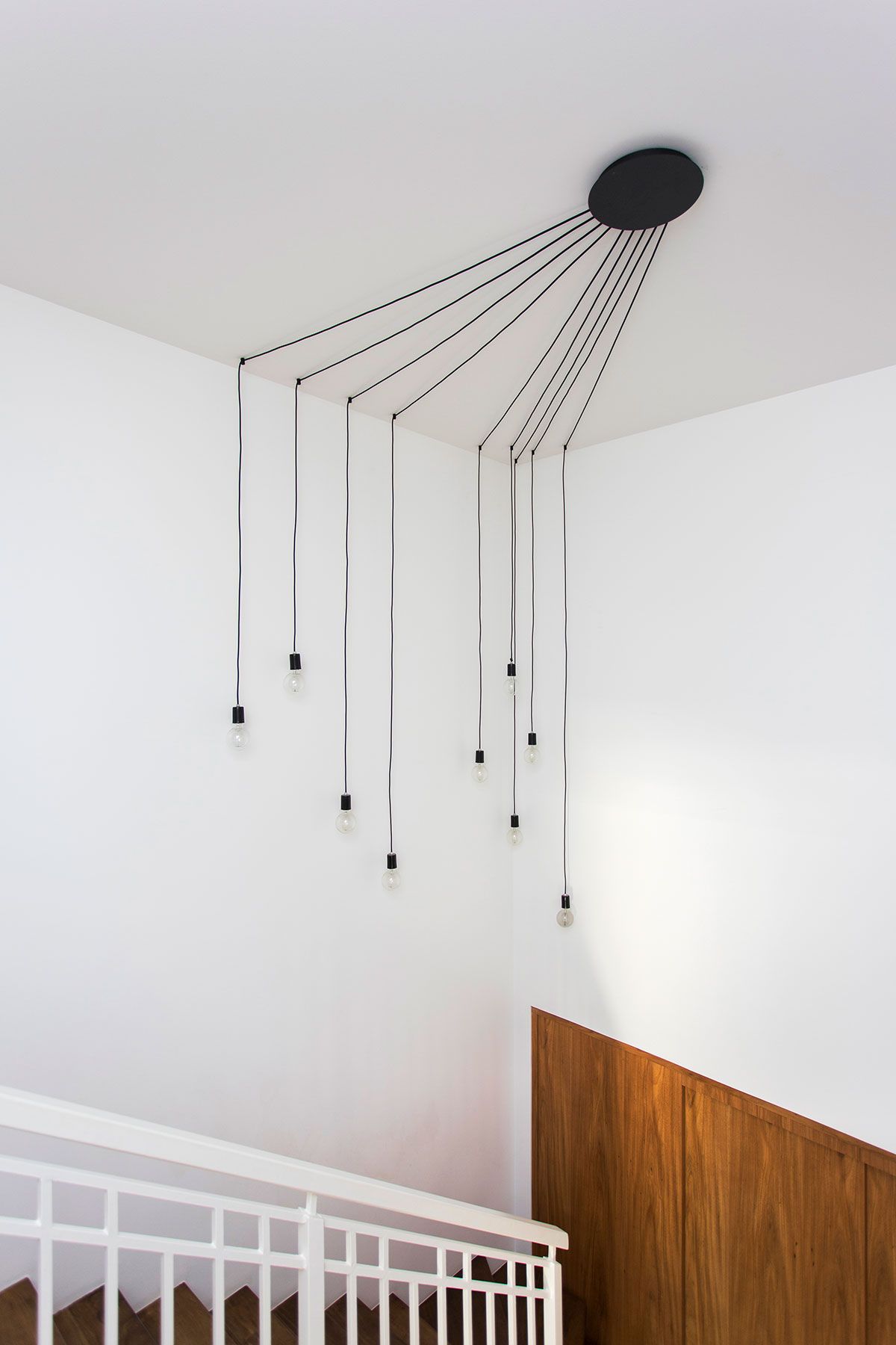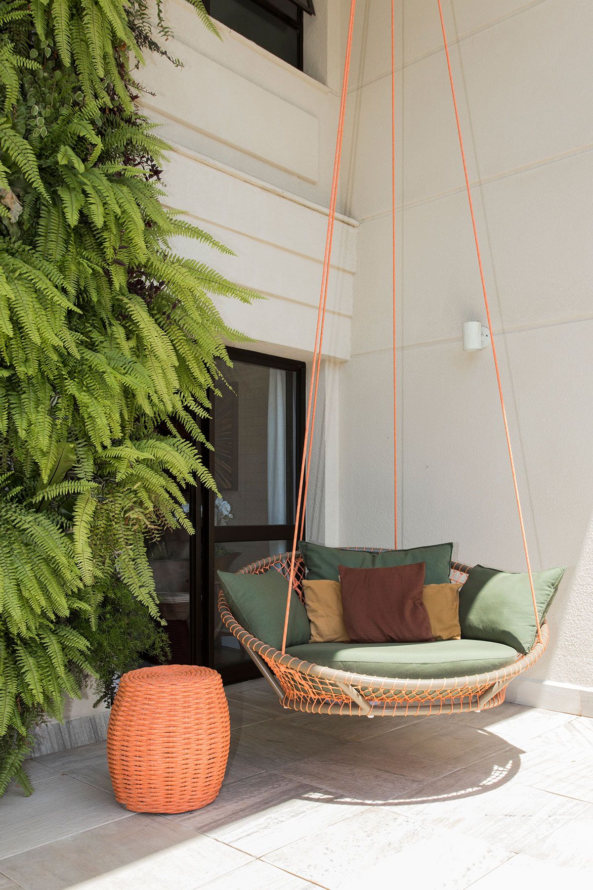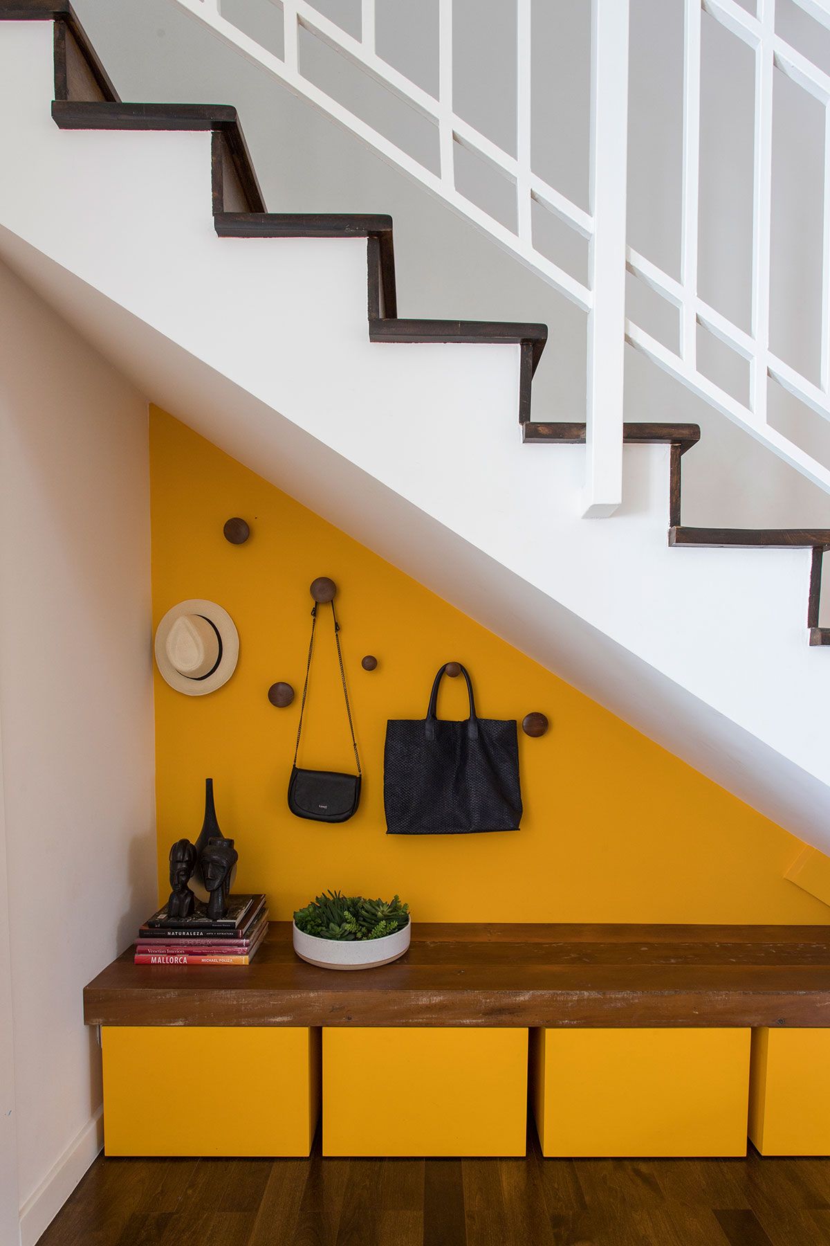 O espaço embaixo da escada foi criado com um cantinho de “boas vindas” da casa, levando ainda um ponto de cor ao décor. O quarto multiuso é outro espaço especial, como a moradora é praticante de yoga, nele tem um local para a prática com as Kuruntas (cordas).