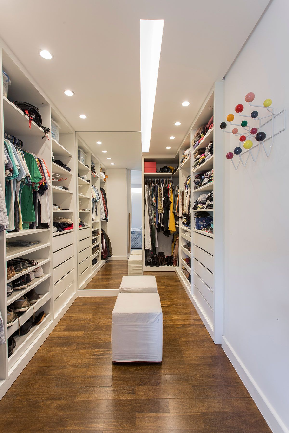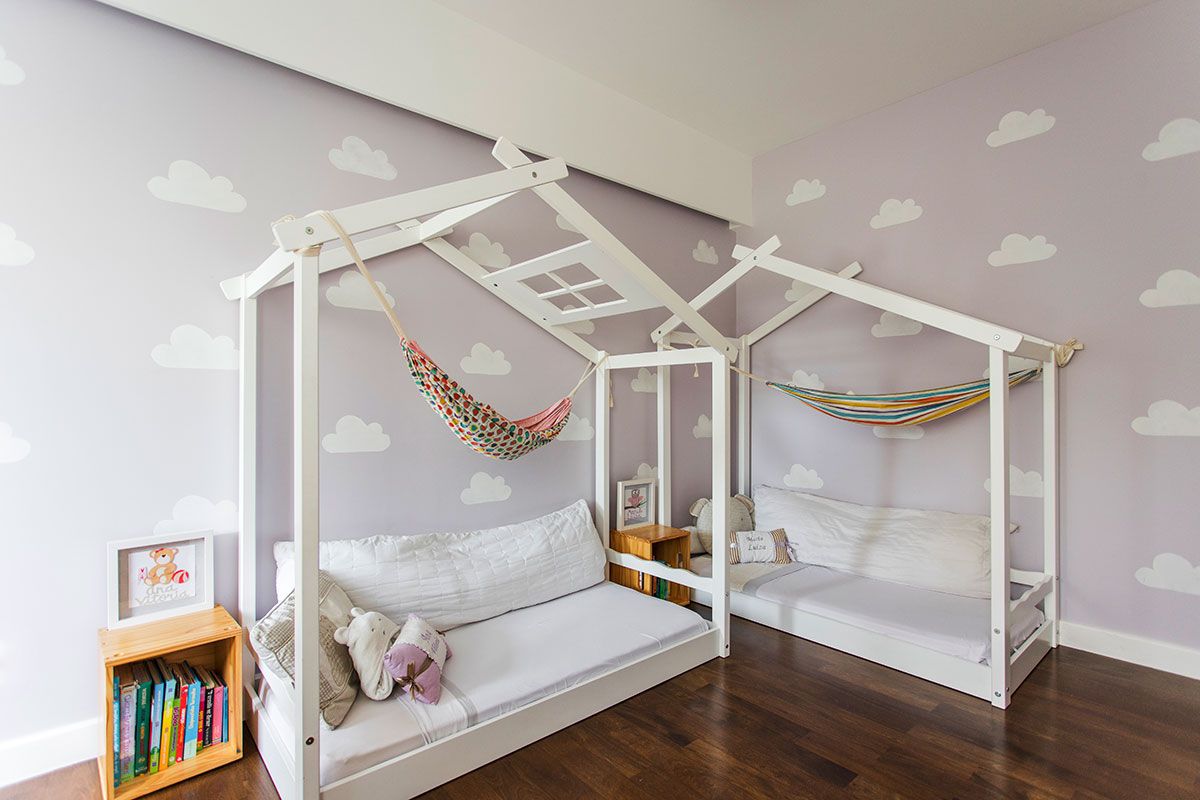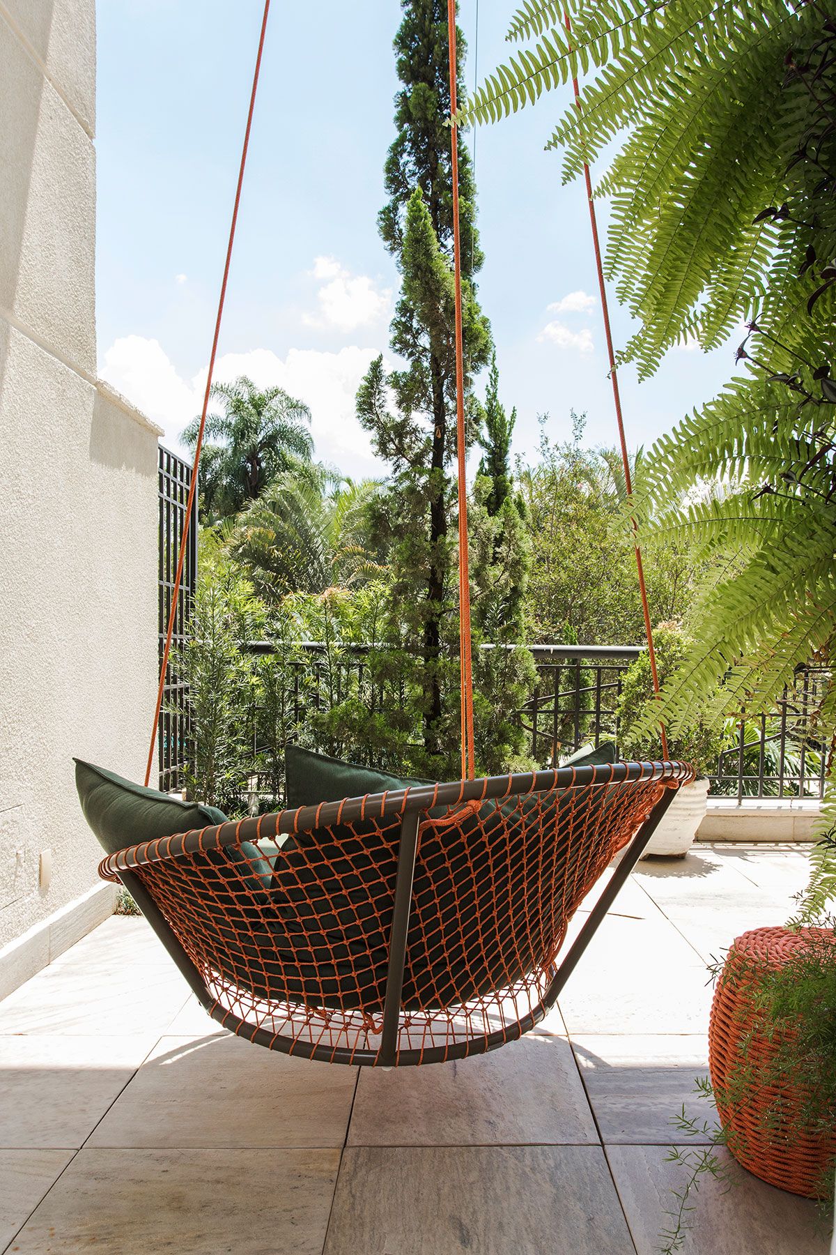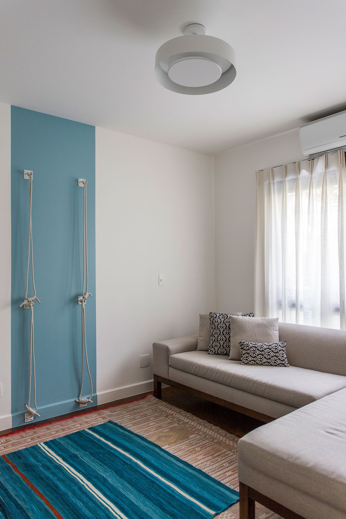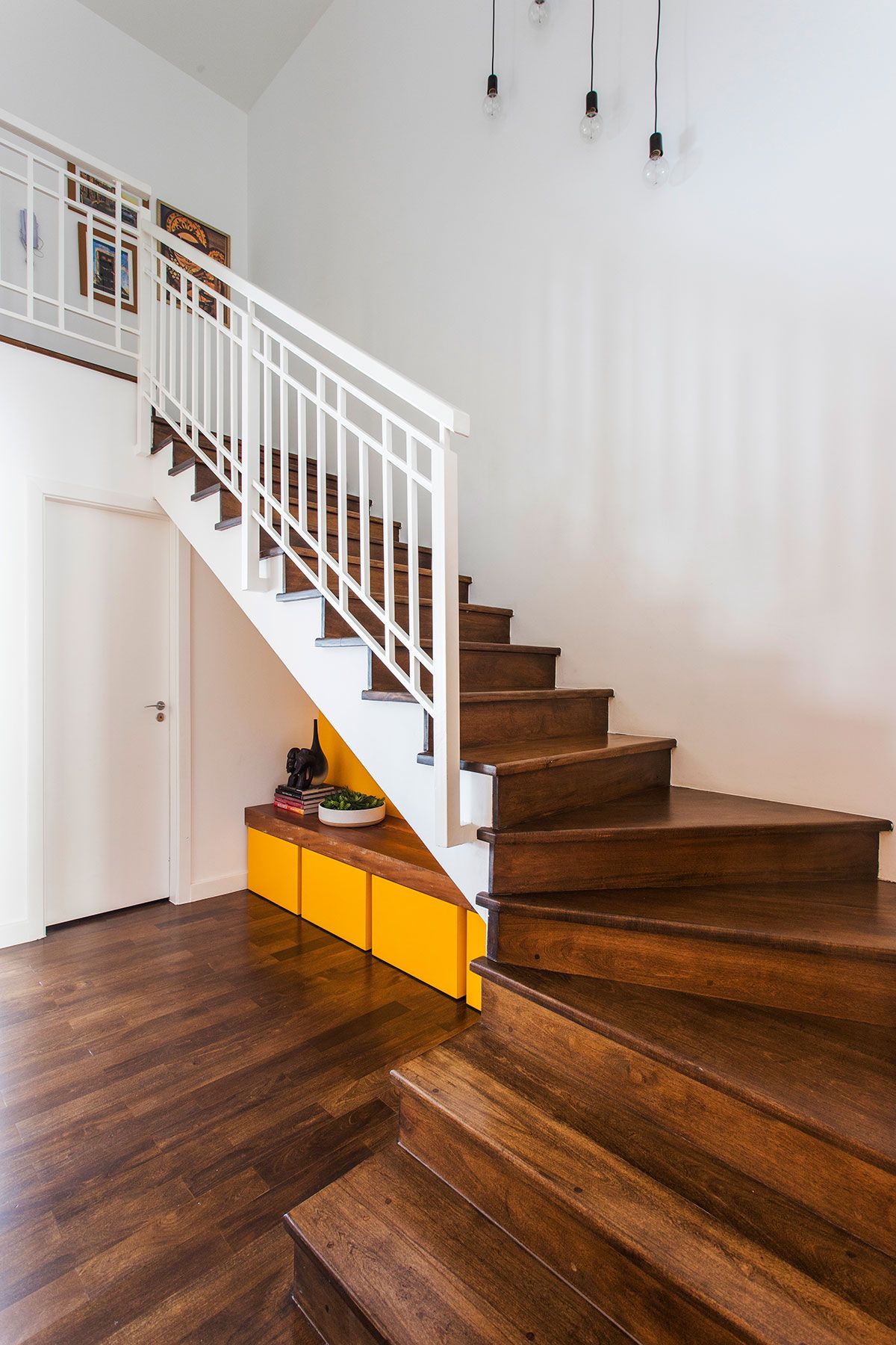 O espaço embaixo da escada foi criado com um cantinho de “boas vindas” da casa, levando ainda um ponto de cor ao décor. O quarto multiuso é outro espaço especial, como a moradora é praticante de yoga, nele tem um local para a prática com as Kuruntas (cordas).