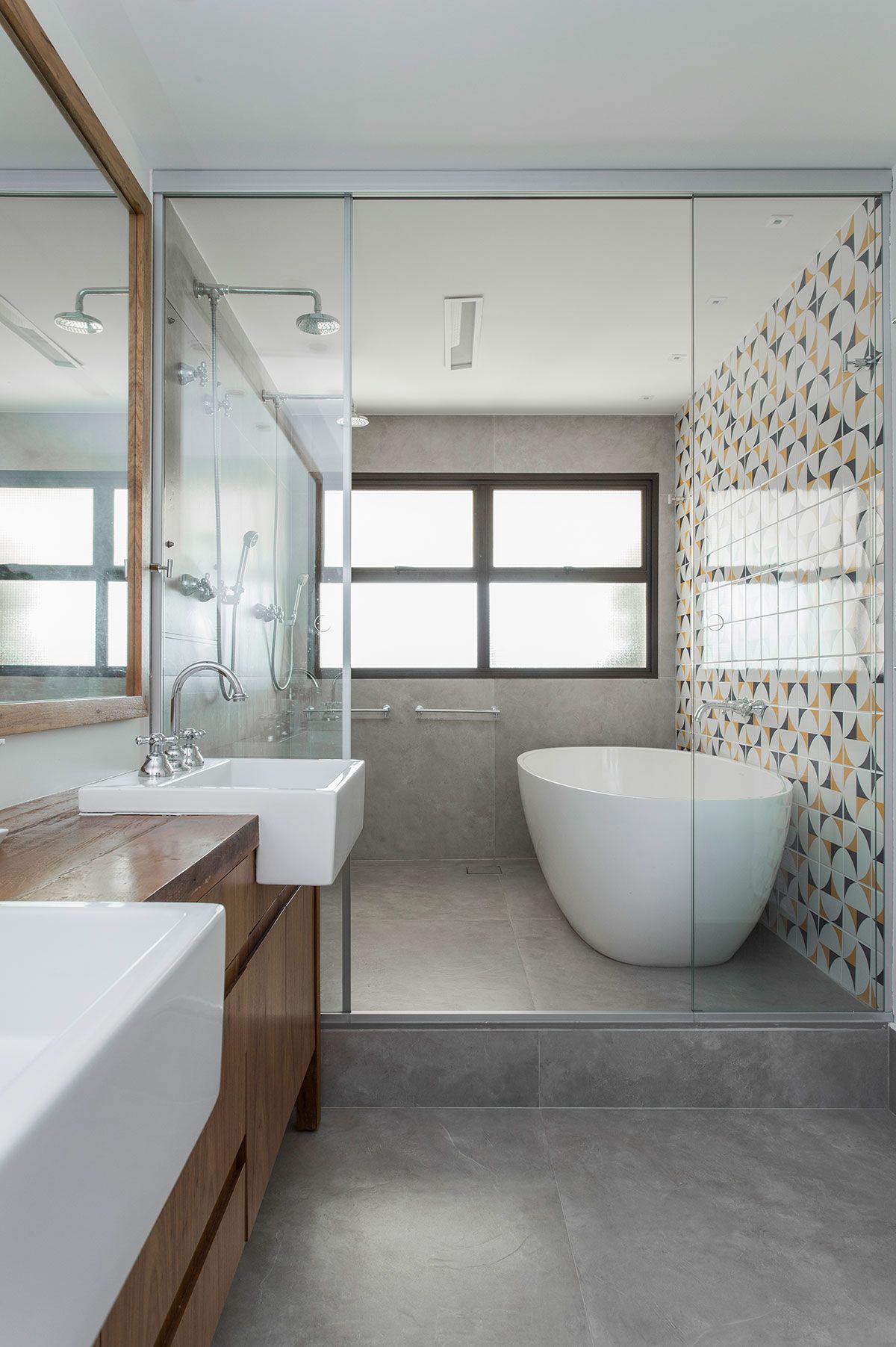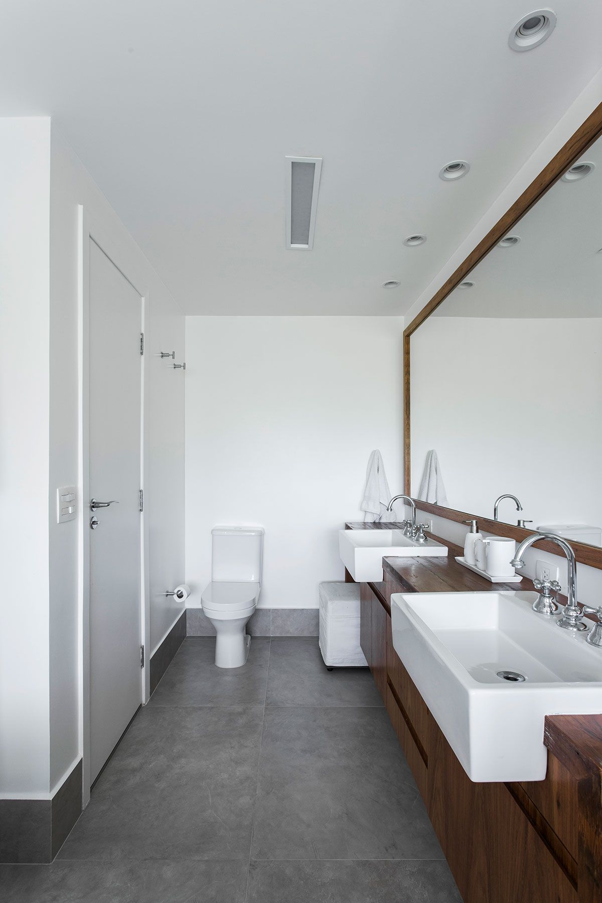 Para a integração total do projeto era importante ter o mesmo piso em toda a área social e precisávamos de mais material para complementar os locais onde removemos alvenarias e readequamos ambientes. Embora tenha sido difícil de achar e mais caro que outros materiais, foi a decisão tomada por ser mais sustentável.