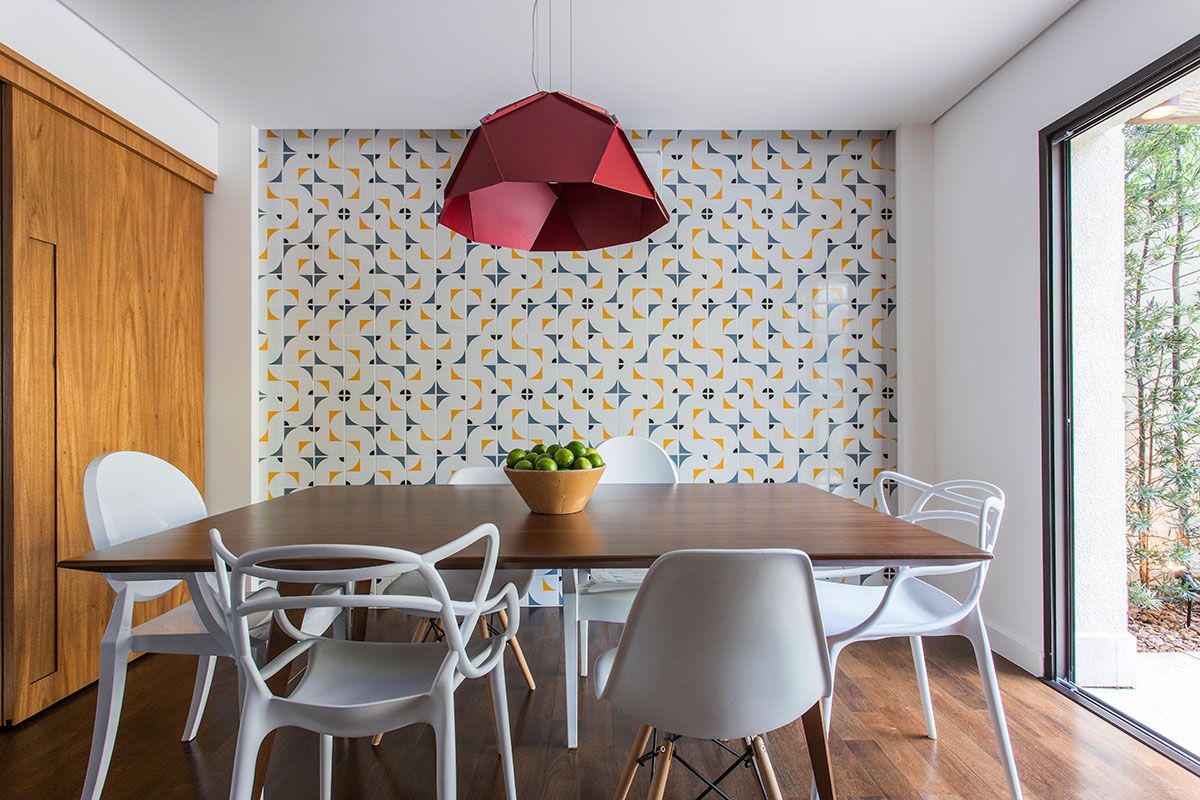 Um dos grandes desafios do escritório foi resolver o piso do térreo que é de taco de madeira maciça. O material estava em ótimo estado, mas a cor não agradava a proprietária. Por isso, foi aplicada uma camada de tingimento para agrada-la e uniformizar a cor da parte antiga com a nova.