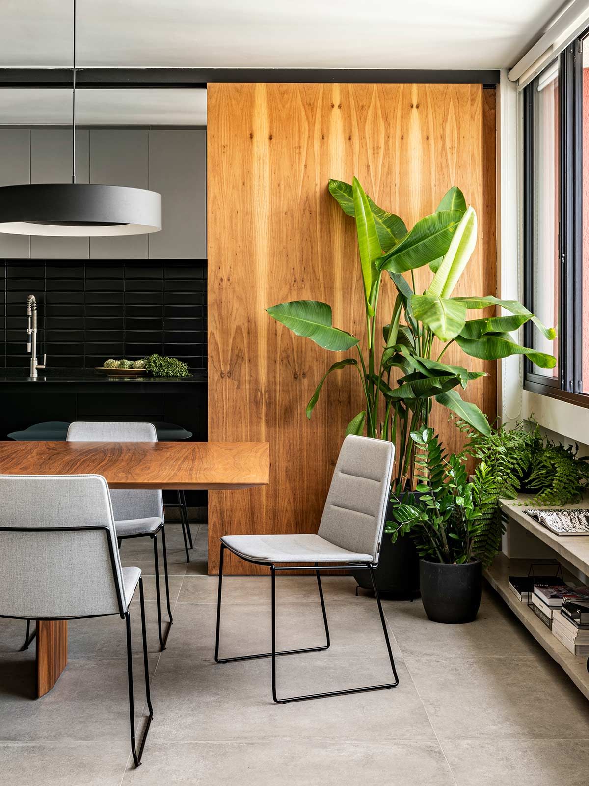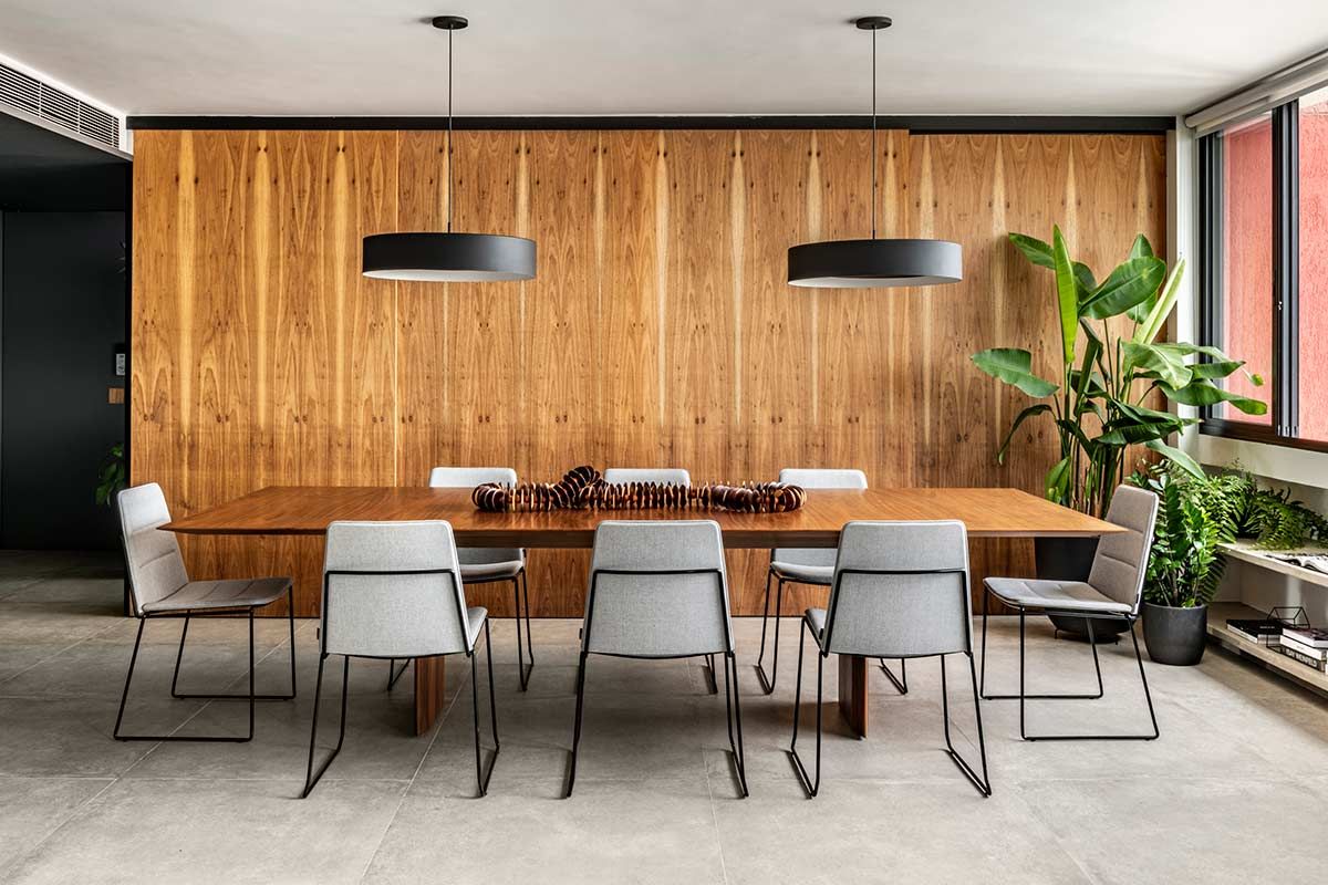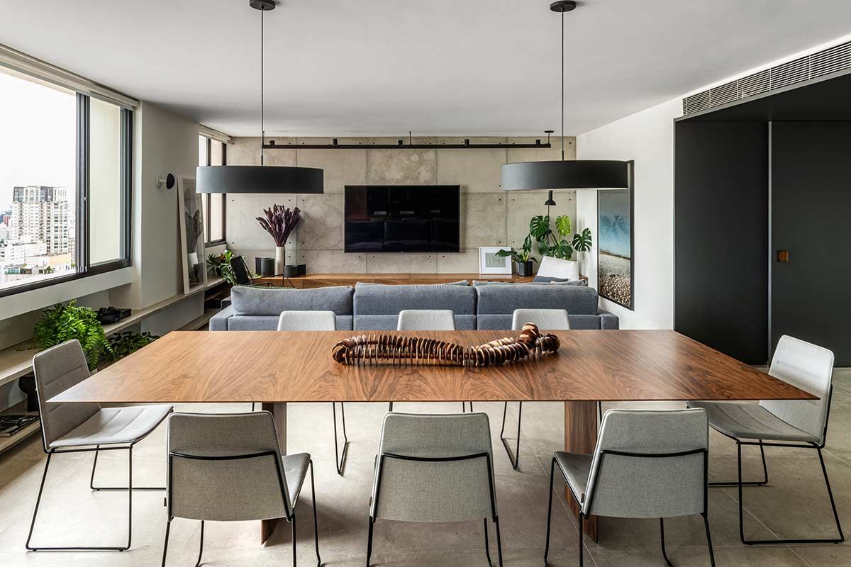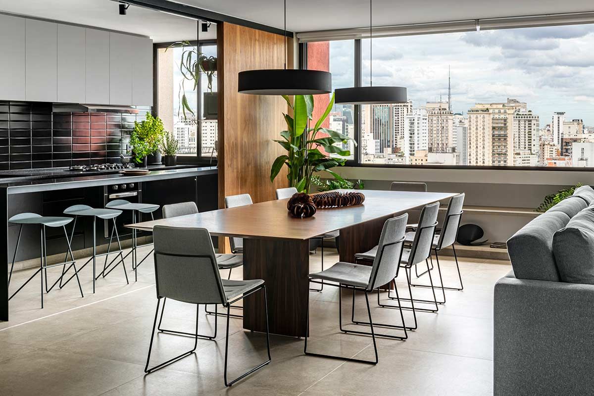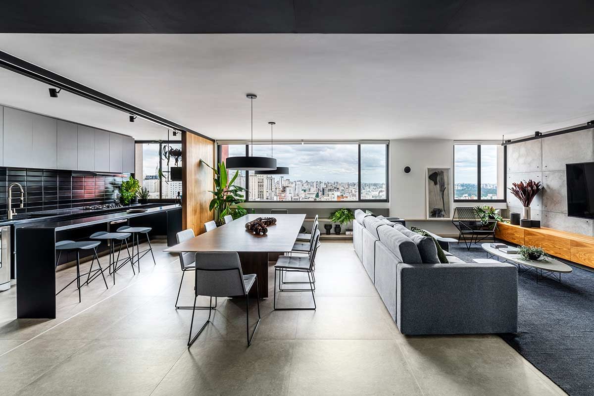 Como não era possível embutir na laje, o encanamento da nova cozinha passou pelos nichos originais existentes embaixo das janelas, onde criou-se um banco de concreto que esconde a tubulação e ainda serve como assento extra. A união dos cômodos ampliou a parte social do apê em tons de cinza e preto, mas a cozinha pode ainda ser isolada através de um grande painel de madeira freijó, a depender do uso.