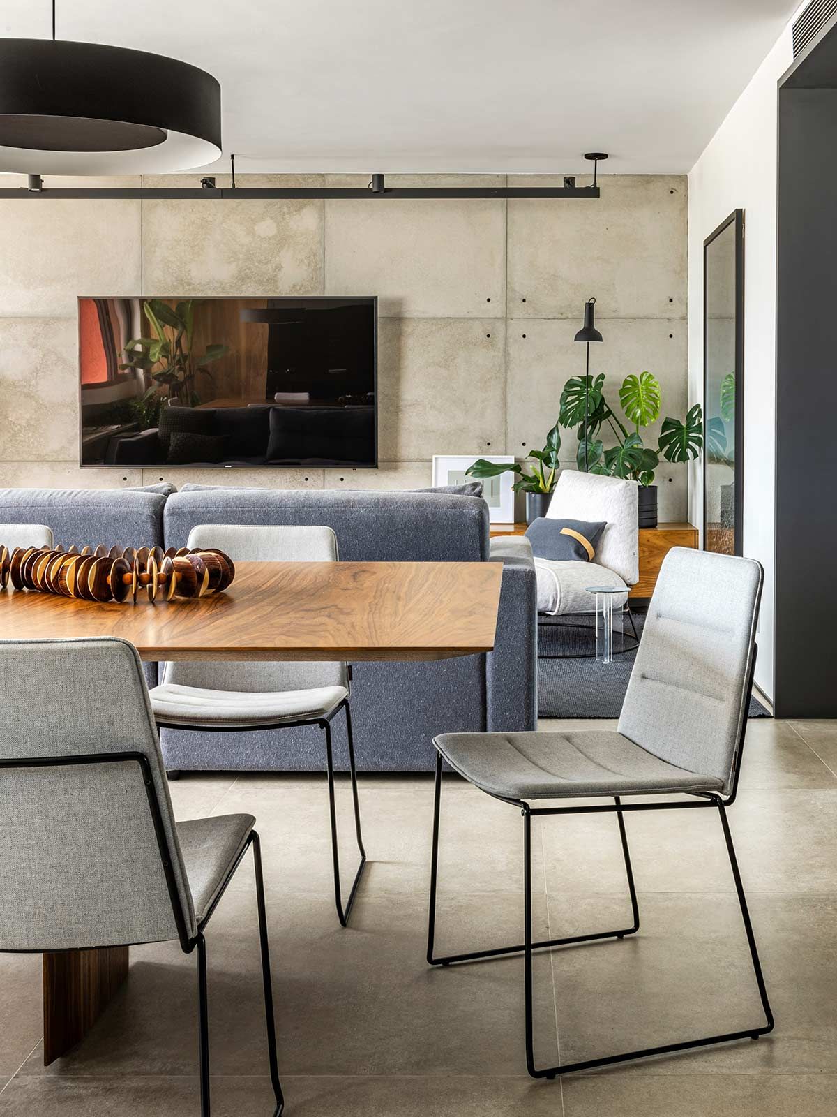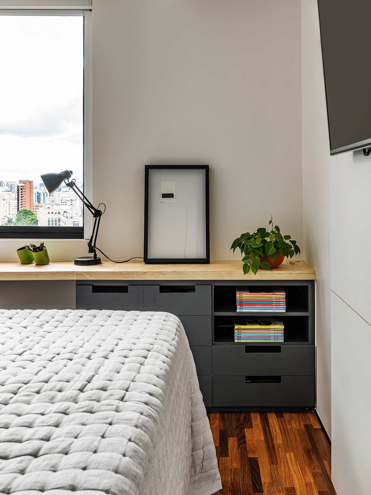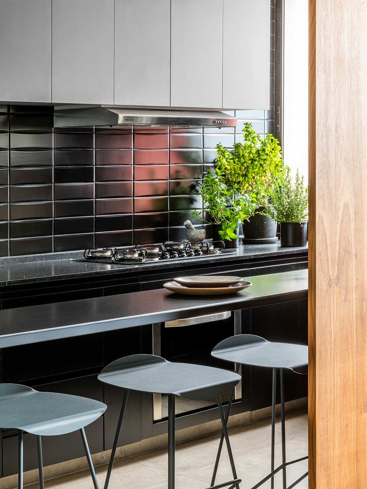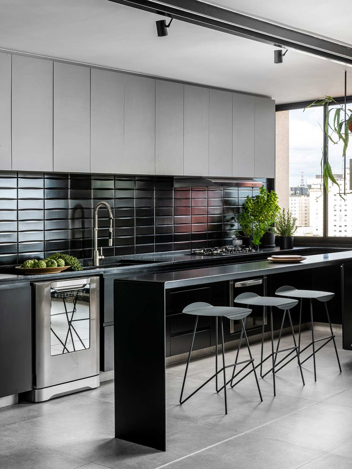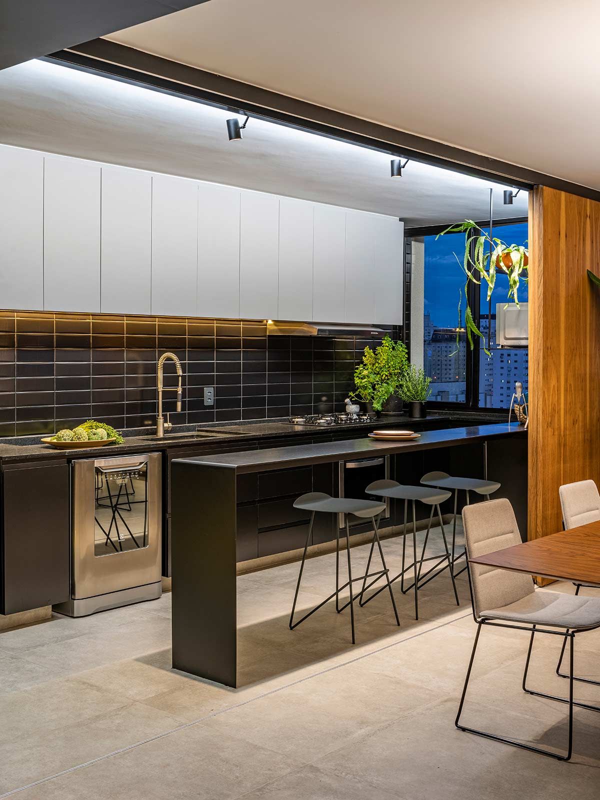 Como não era possível embutir na laje, o encanamento da nova cozinha passou pelos nichos originais existentes embaixo das janelas, onde criou-se um banco de concreto que esconde a tubulação e ainda serve como assento extra. A união dos cômodos ampliou a parte social do apê em tons de cinza e preto, mas a cozinha pode ainda ser isolada através de um grande painel de madeira freijó, a depender do uso.