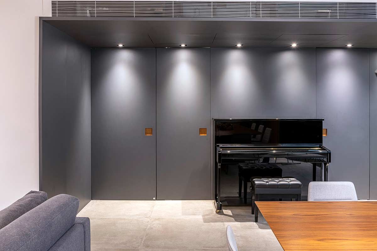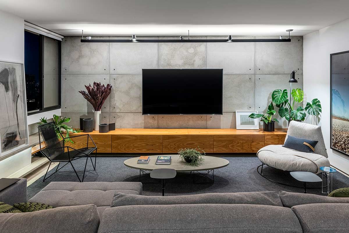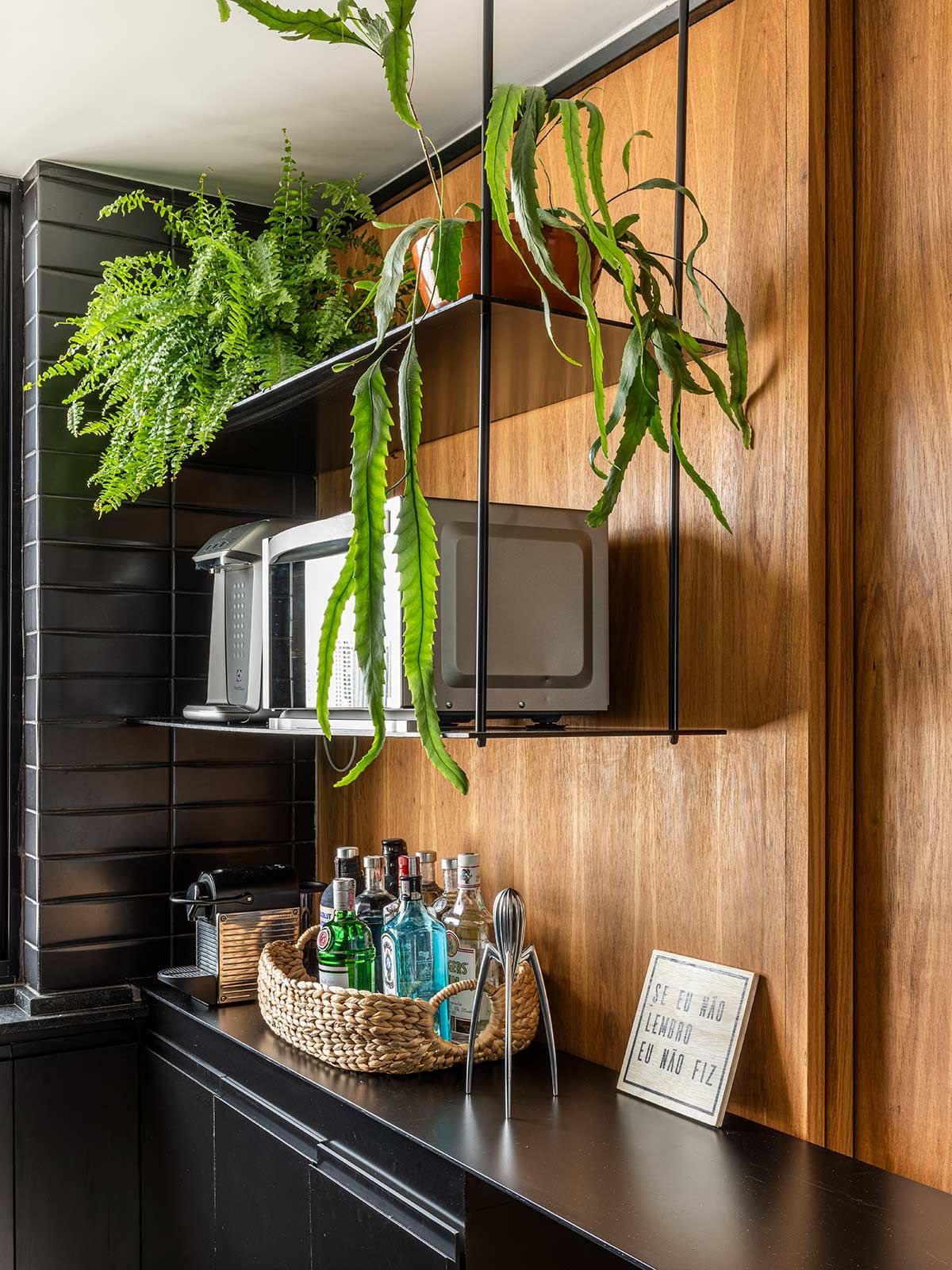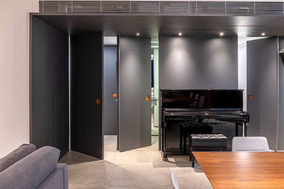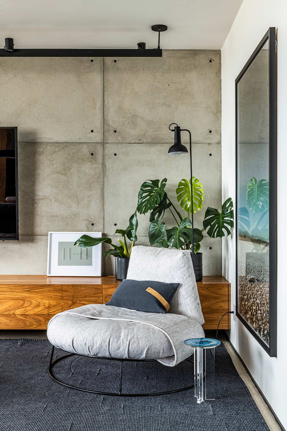 Como não era possível embutir na laje, o encanamento da nova cozinha passou pelos nichos originais existentes embaixo das janelas, onde criou-se um banco de concreto que esconde a tubulação e ainda serve como assento extra. A união dos cômodos ampliou a parte social do apê em tons de cinza e preto, mas a cozinha pode ainda ser isolada através de um grande painel de madeira freijó, a depender do uso.