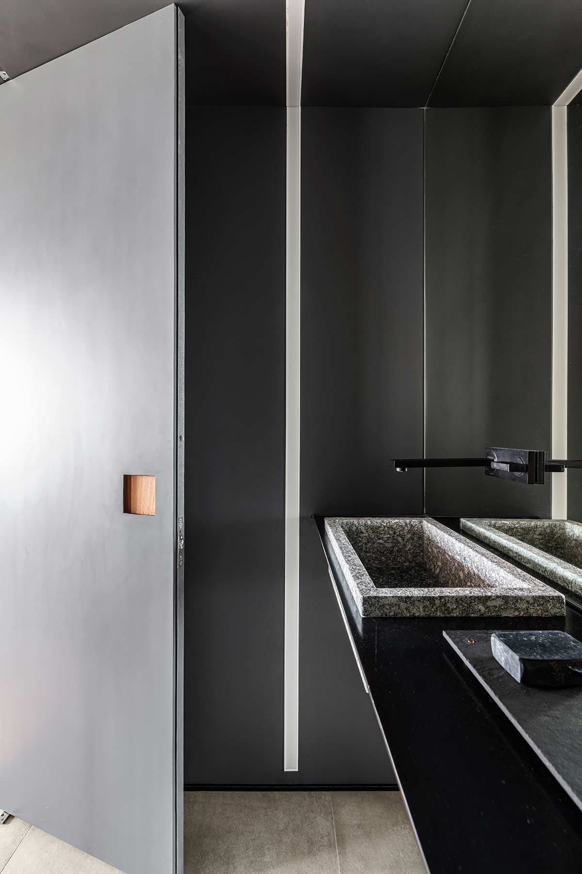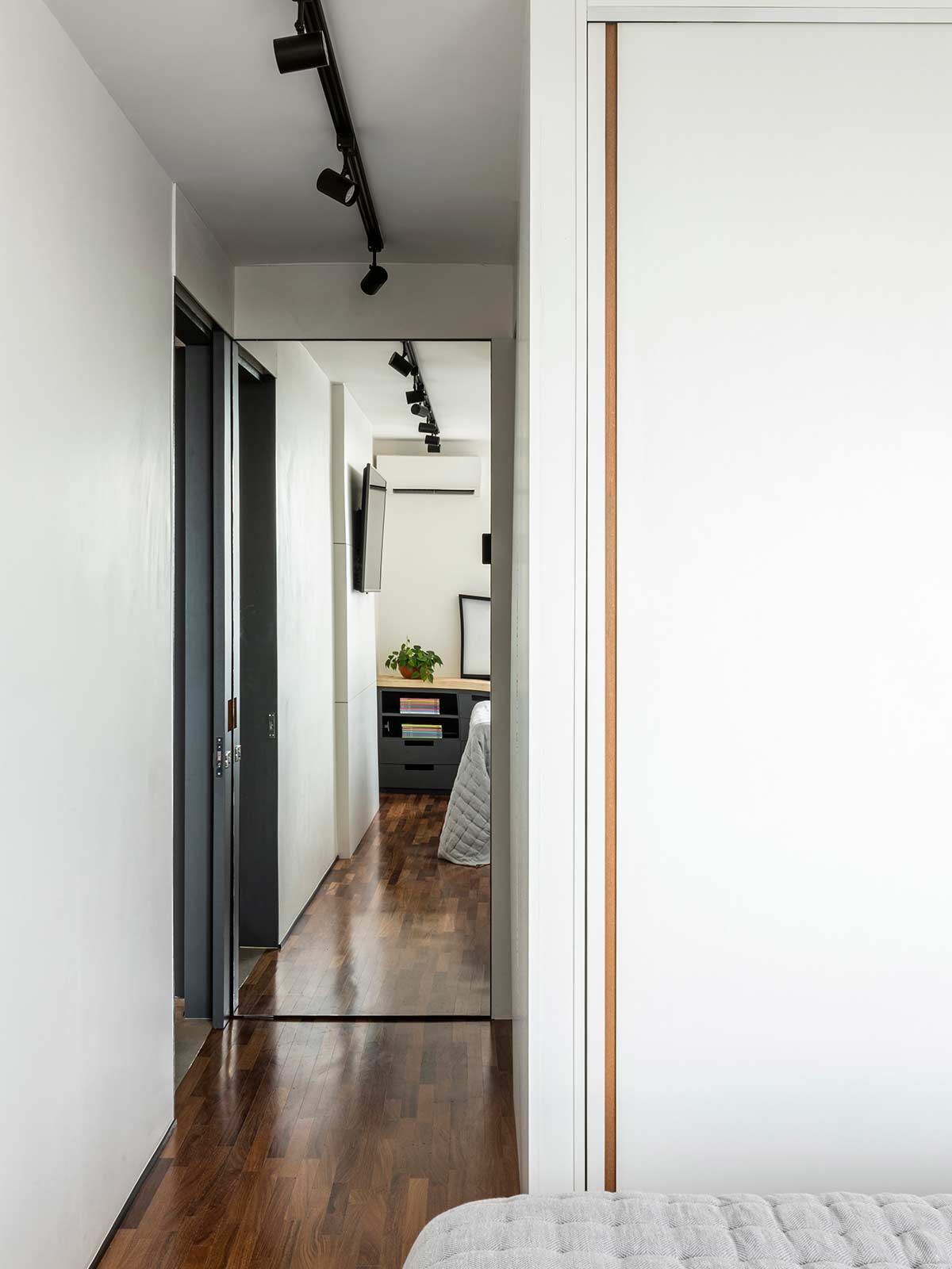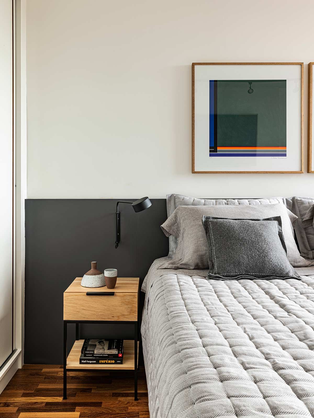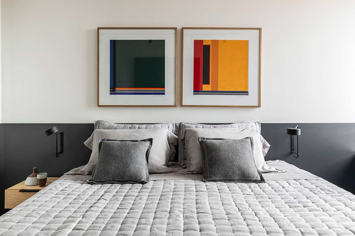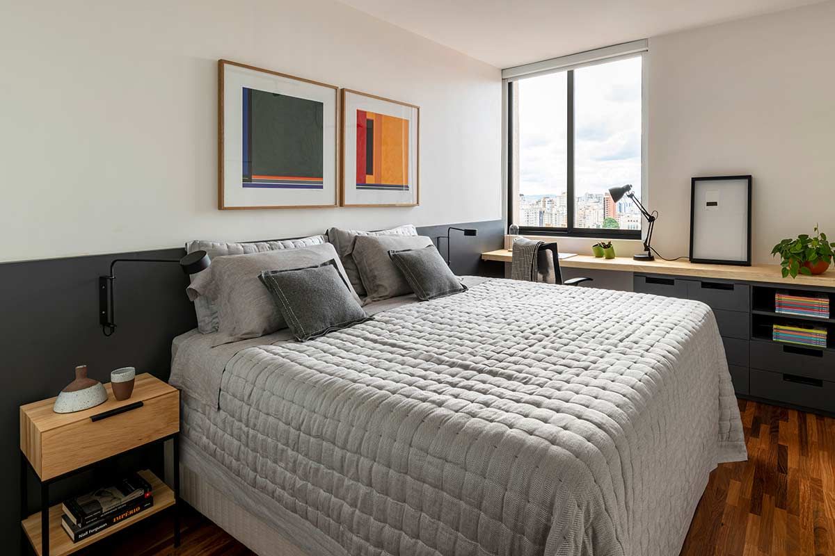 A paginação em fórmica da parede e forro acompanham as portas do hall e essa roupagem se estende até o lavabo, destacada por uma iluminação linear. Na suíte, desenvolveu-se um pequeno closet escondido atrás do espelho e a paleta cinza, expressiva também nos outros ambientes, faz-se presente na marcenaria, peças têxteis e objetos de décor.