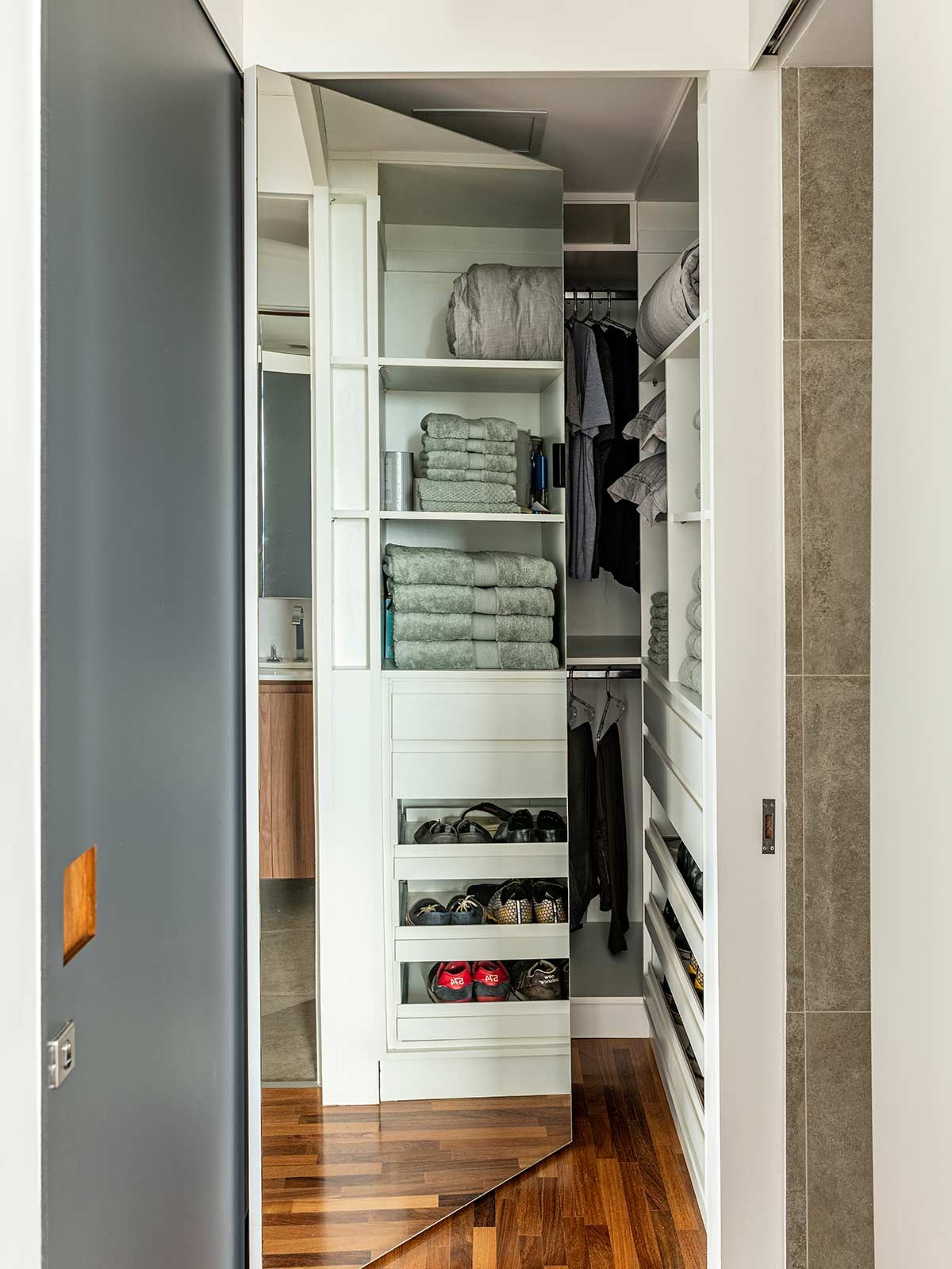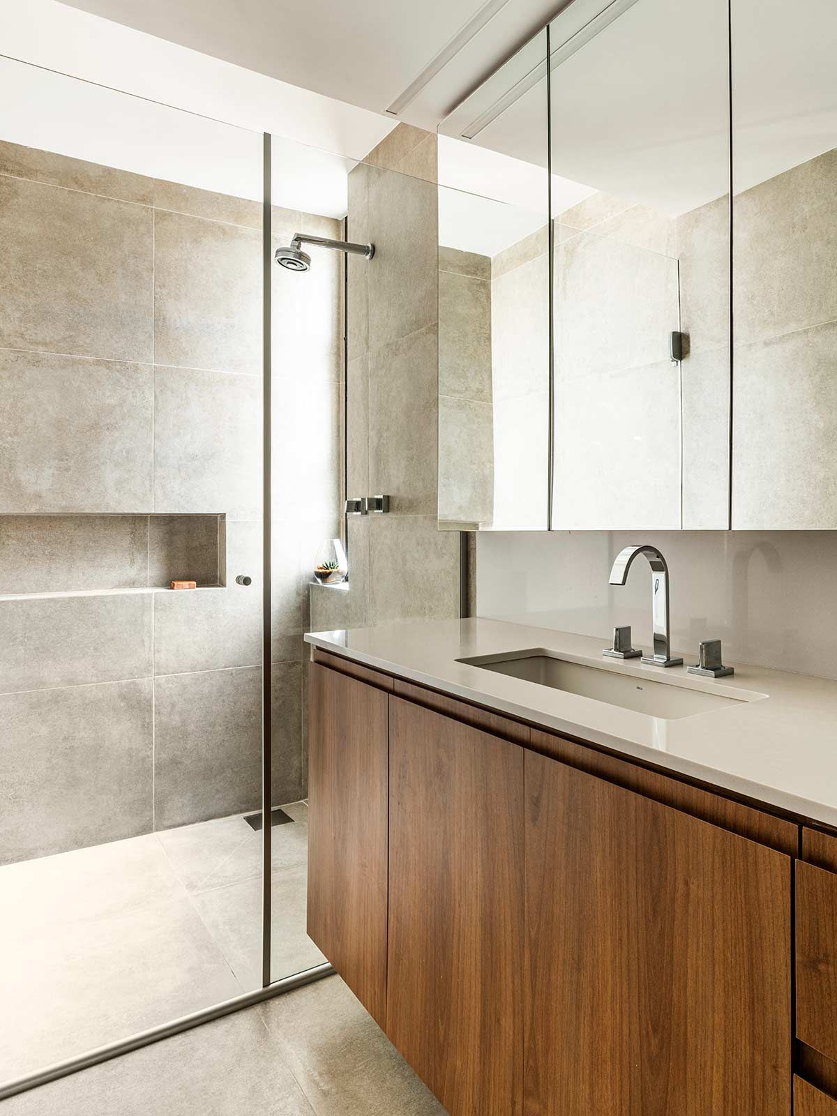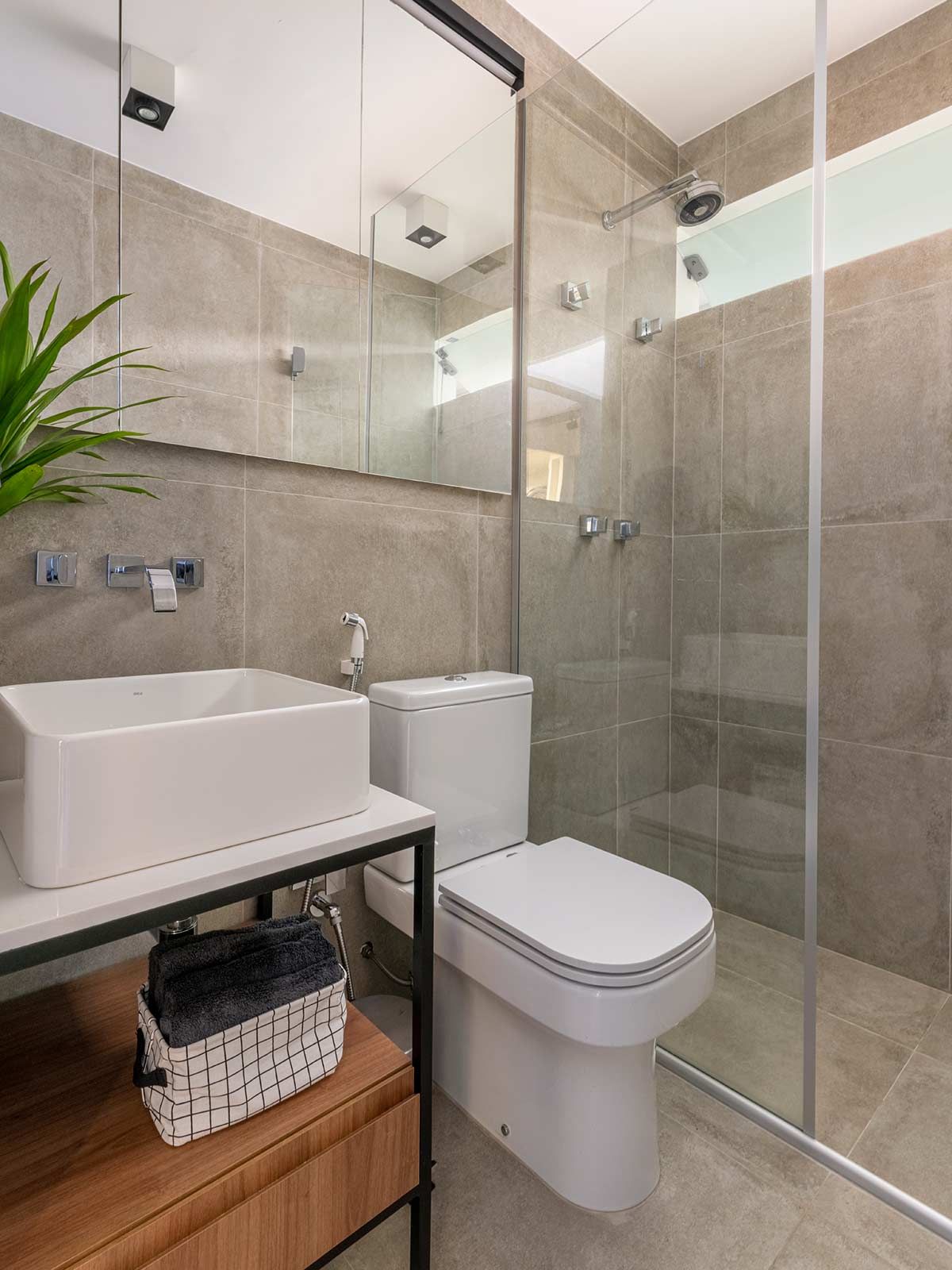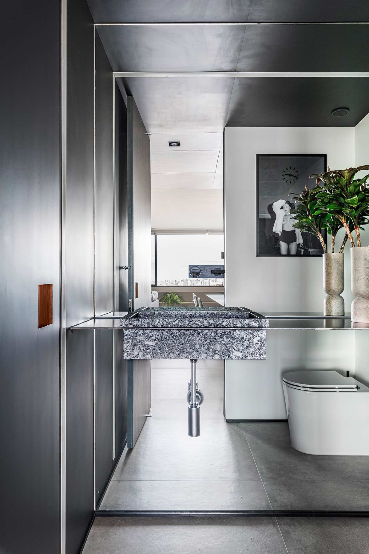 A paginação em fórmica da parede e forro acompanham as portas do hall e essa roupagem se estende até o lavabo, destacada por uma iluminação linear. Na suíte, desenvolveu-se um pequeno closet escondido atrás do espelho e a paleta cinza, expressiva também nos outros ambientes, faz-se presente na marcenaria, peças têxteis e objetos de décor.