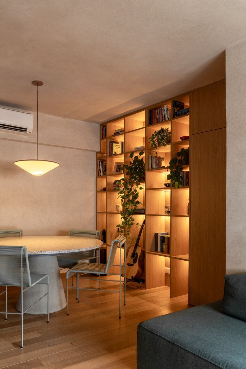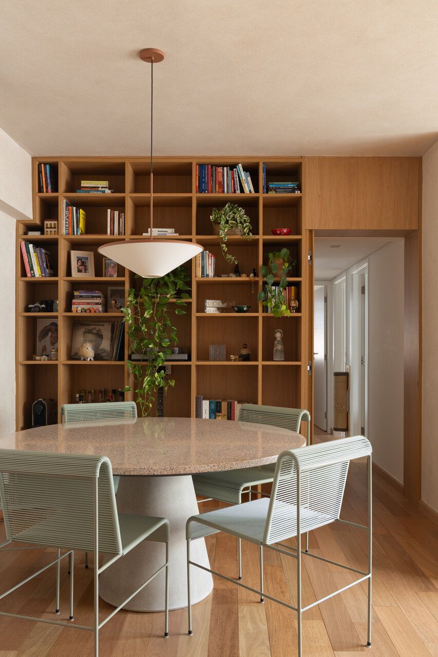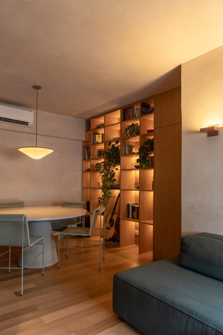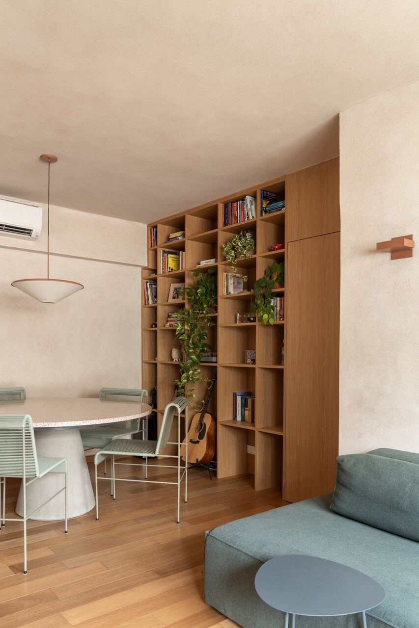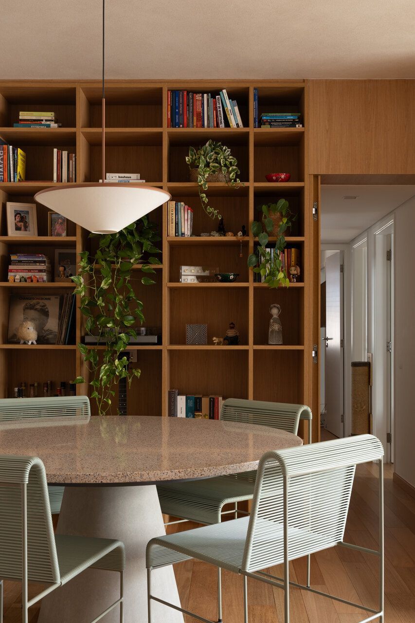Na distribuição dos ambientes, o projeto equilibra funcionalidade e flexibilidade. São três dormitórios, sendo uma suíte, além de living, jantar e cozinha totalmente integrados, lavabo, área de serviço separada e quarto de despejo. A suíte se destaca pelo planejamento minucioso dos armários e pelo banheiro com bancada em quartzito e metais de design. O lavabo assume papel cênico, com iluminação teatral e revestimento marcante. Já a estante do jantar, desenhada sob medida, abriga livros, discos de vinil, plantas e objetos de viagem, traduzindo a personalidade das moradoras.