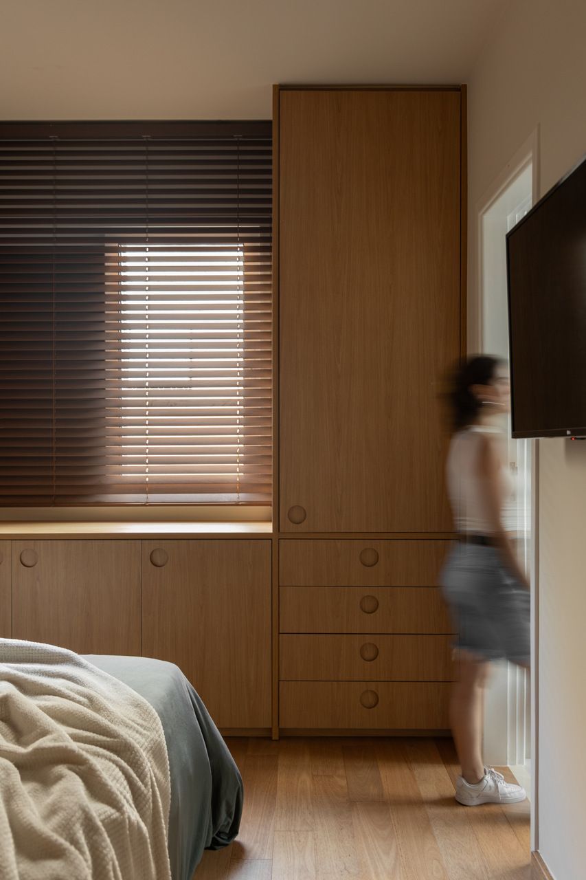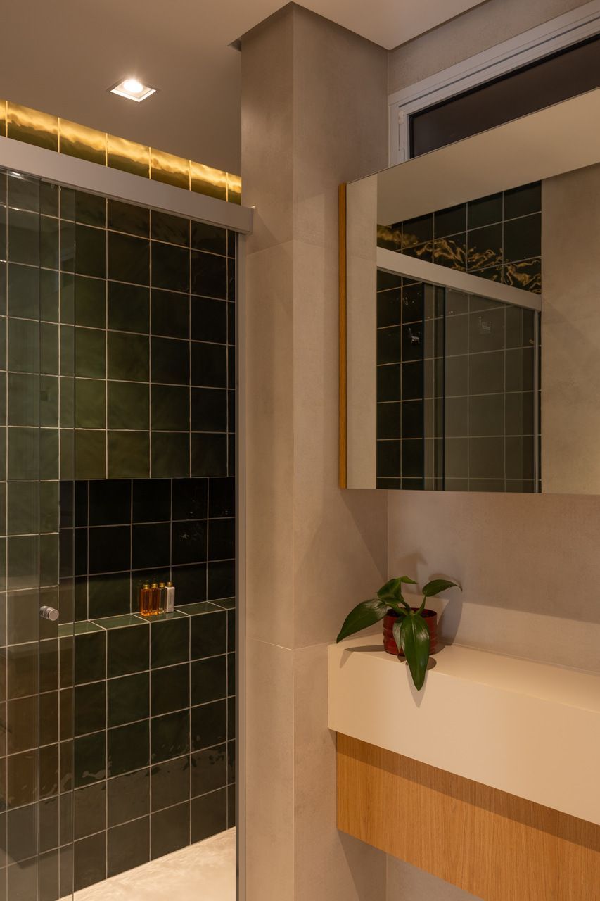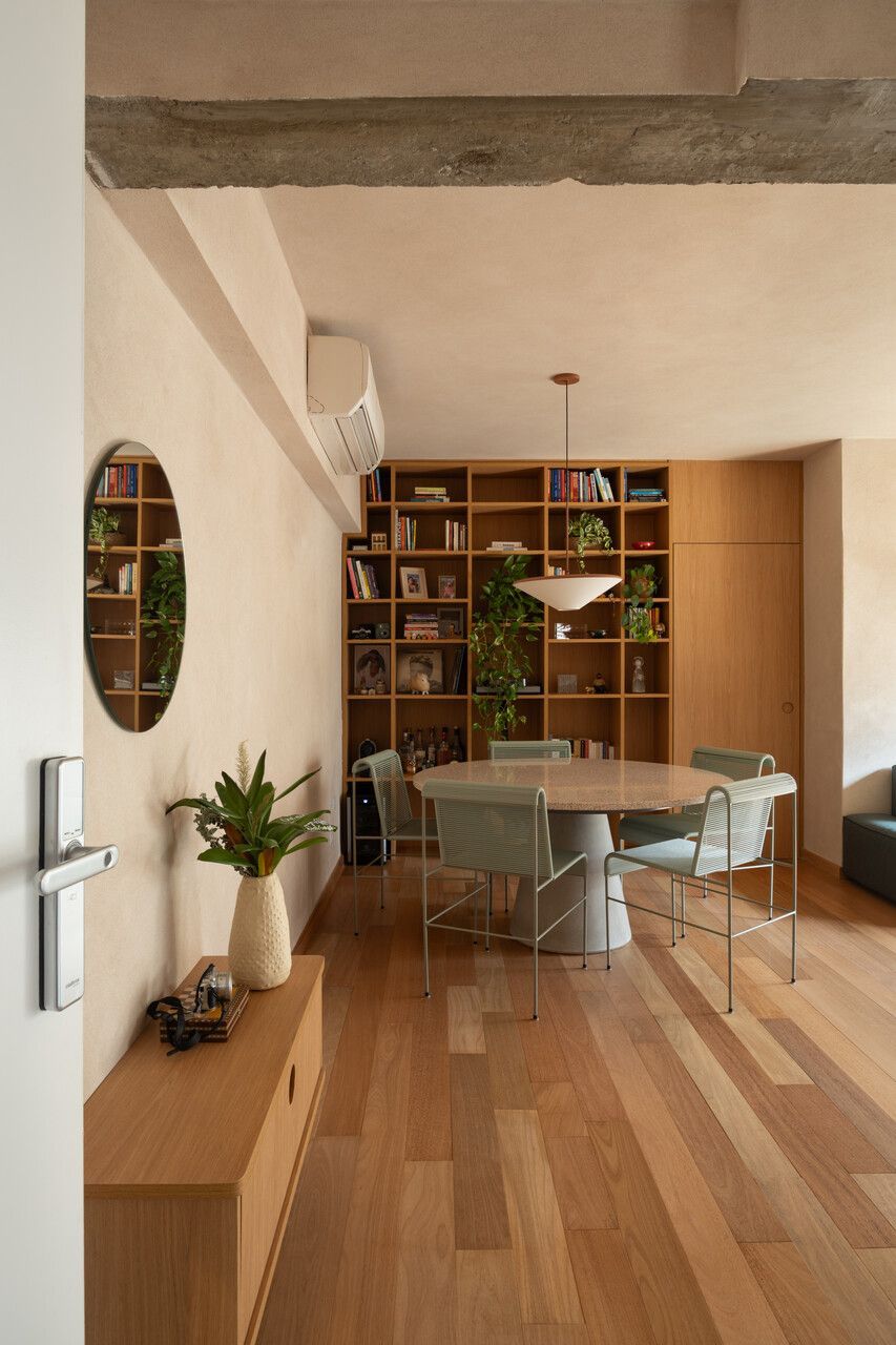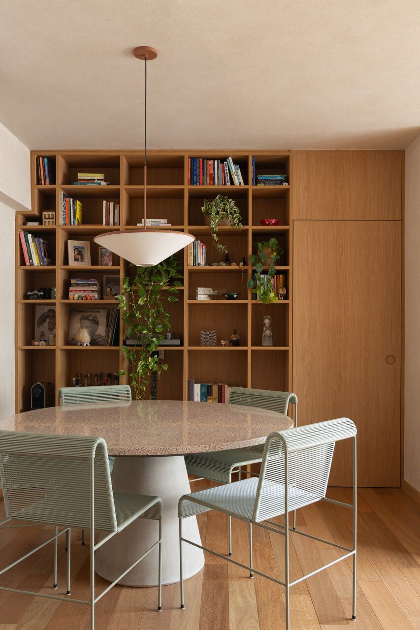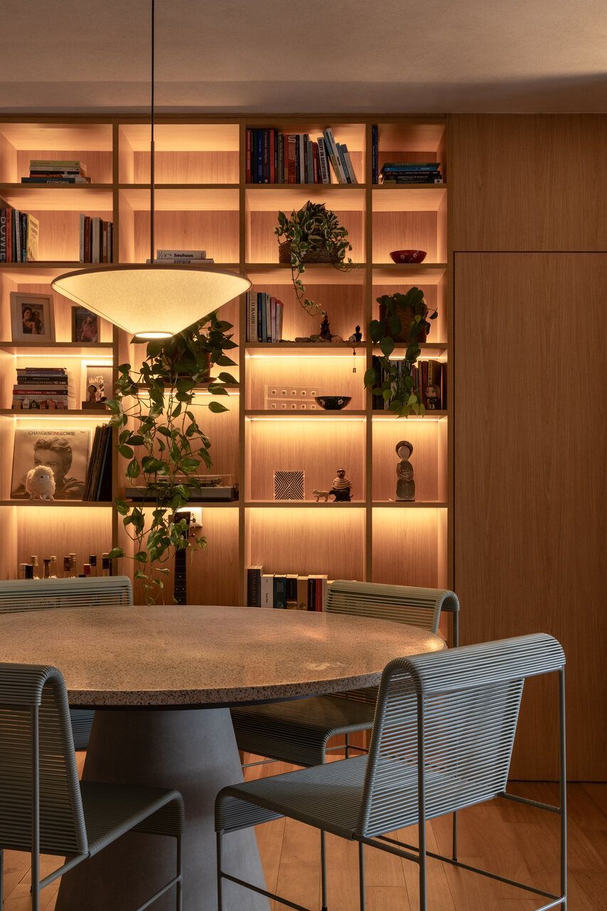 Na distribuição dos ambientes, o projeto equilibra funcionalidade e flexibilidade. São três dormitórios, sendo uma suíte, além de living, jantar e cozinha totalmente integrados, lavabo, área de serviço separada e quarto de despejo. A suíte se destaca pelo planejamento minucioso dos armários e pelo banheiro com bancada em quartzito e metais de design. O lavabo assume papel cênico, com iluminação teatral e revestimento marcante. Já a estante do jantar, desenhada sob medida, abriga livros, discos de vinil, plantas e objetos de viagem, traduzindo a personalidade das moradoras.