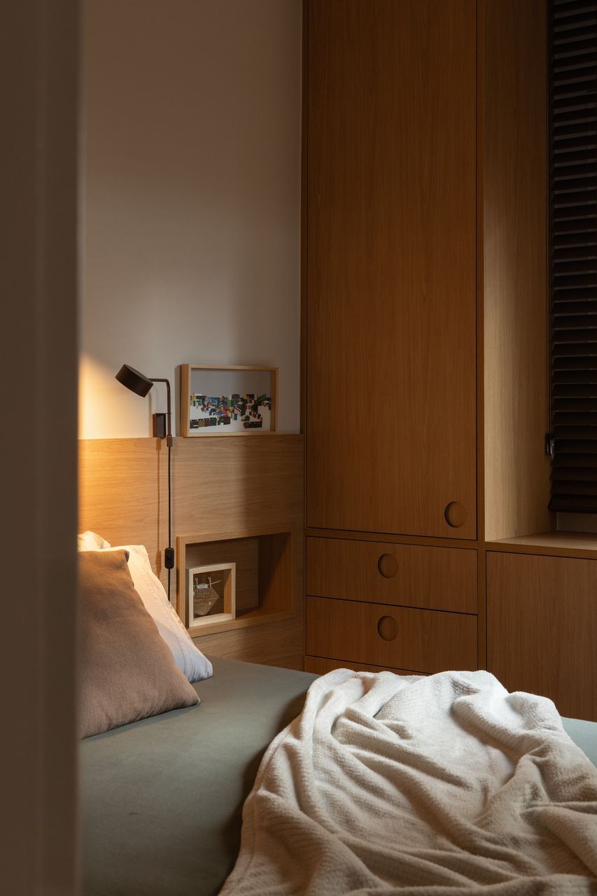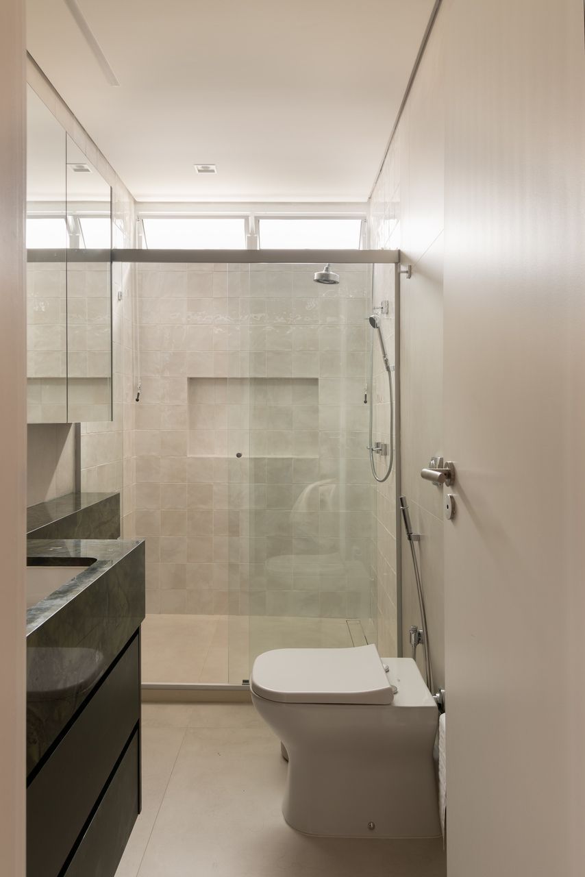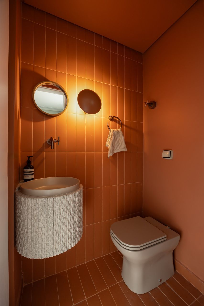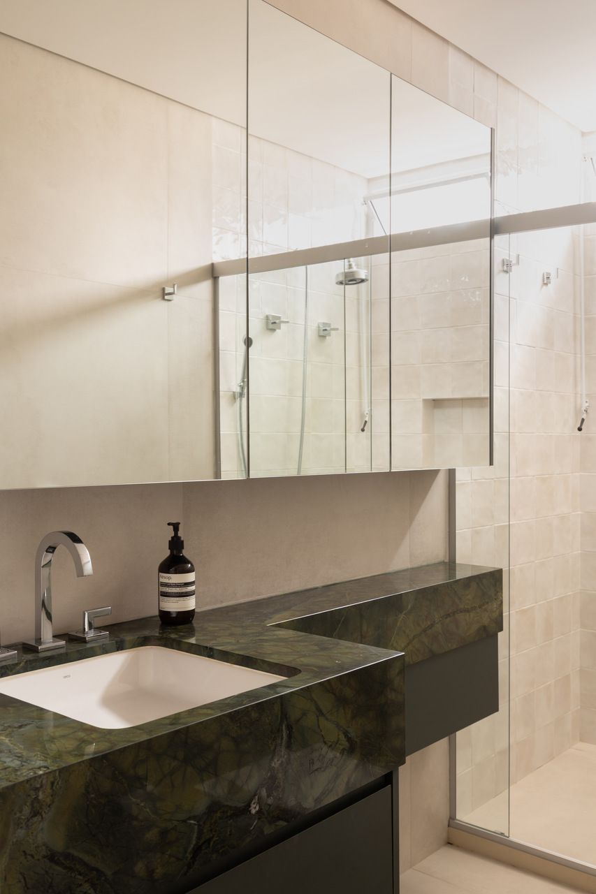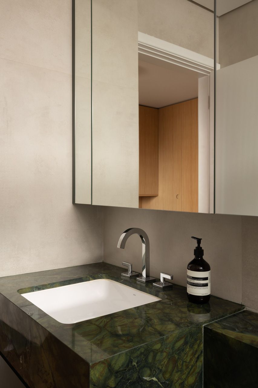 Na distribuição dos ambientes, o projeto equilibra funcionalidade e flexibilidade. São três dormitórios, sendo uma suíte, além de living, jantar e cozinha totalmente integrados, lavabo, área de serviço separada e quarto de despejo. A suíte se destaca pelo planejamento minucioso dos armários e pelo banheiro com bancada em quartzito e metais de design. O lavabo assume papel cênico, com iluminação teatral e revestimento marcante. Já a estante do jantar, desenhada sob medida, abriga livros, discos de vinil, plantas e objetos de viagem, traduzindo a personalidade das moradoras.