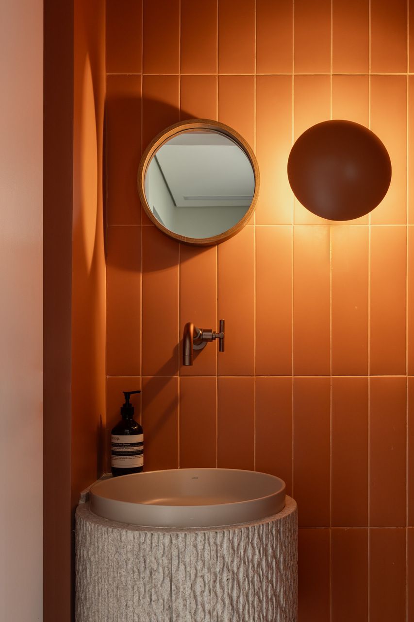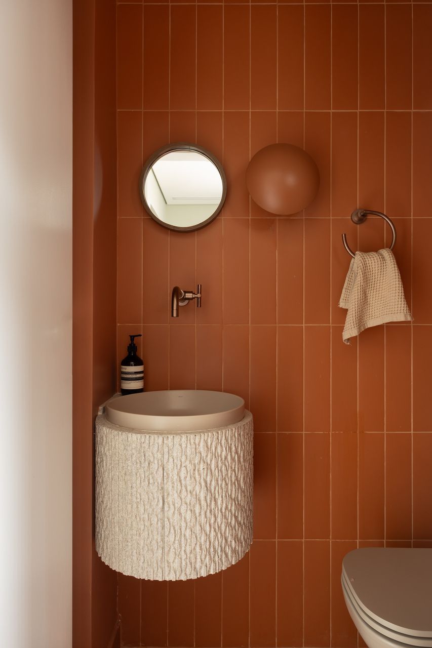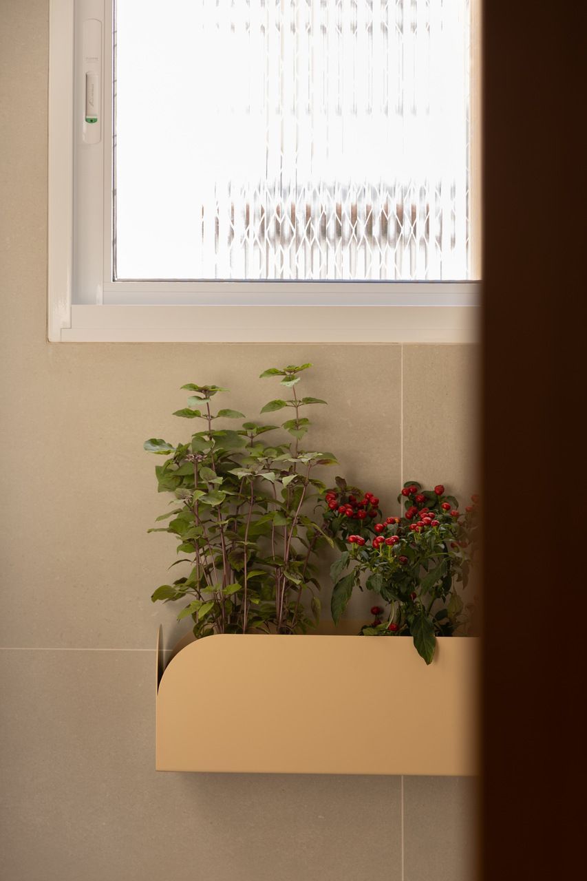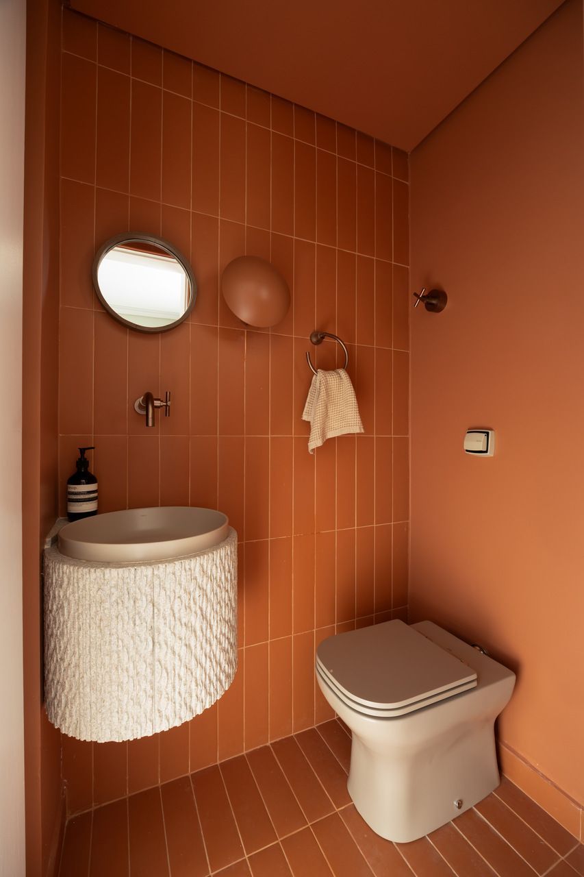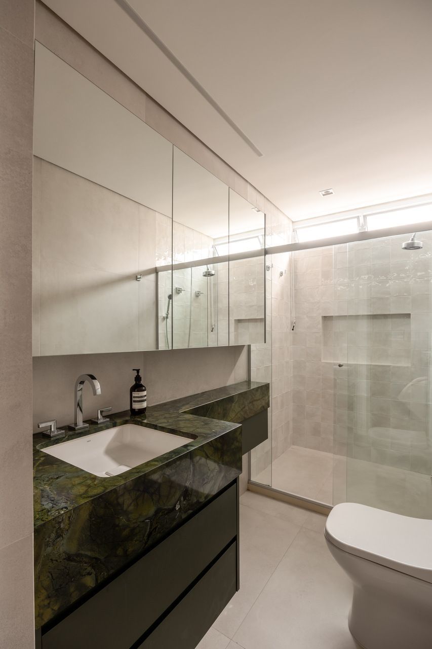Na distribuição dos ambientes, o projeto equilibra funcionalidade e flexibilidade. São três dormitórios, sendo uma suíte, além de living, jantar e cozinha totalmente integrados, lavabo, área de serviço separada e quarto de despejo. A suíte se destaca pelo planejamento minucioso dos armários e pelo banheiro com bancada em quartzito e metais de design. O lavabo assume papel cênico, com iluminação teatral e revestimento marcante. Já a estante do jantar, desenhada sob medida, abriga livros, discos de vinil, plantas e objetos de viagem, traduzindo a personalidade das moradoras.