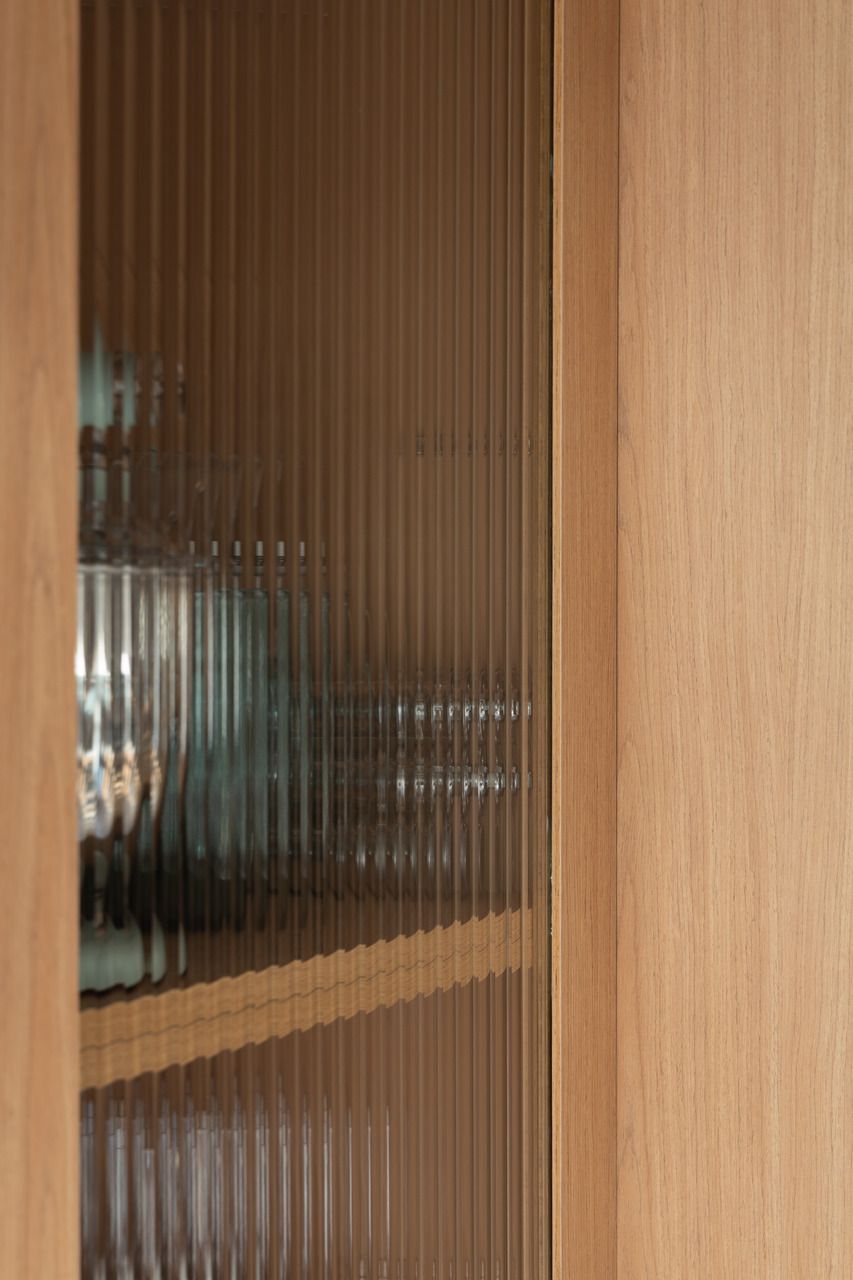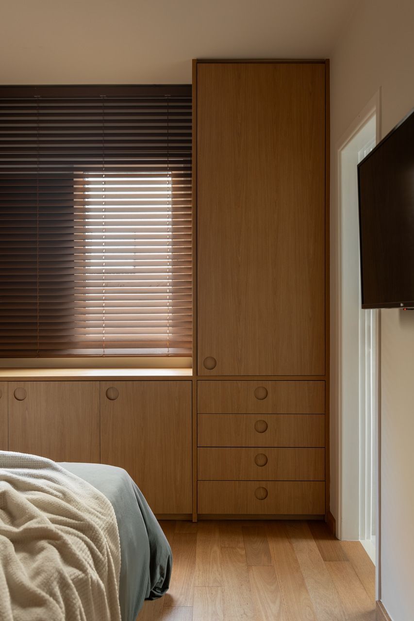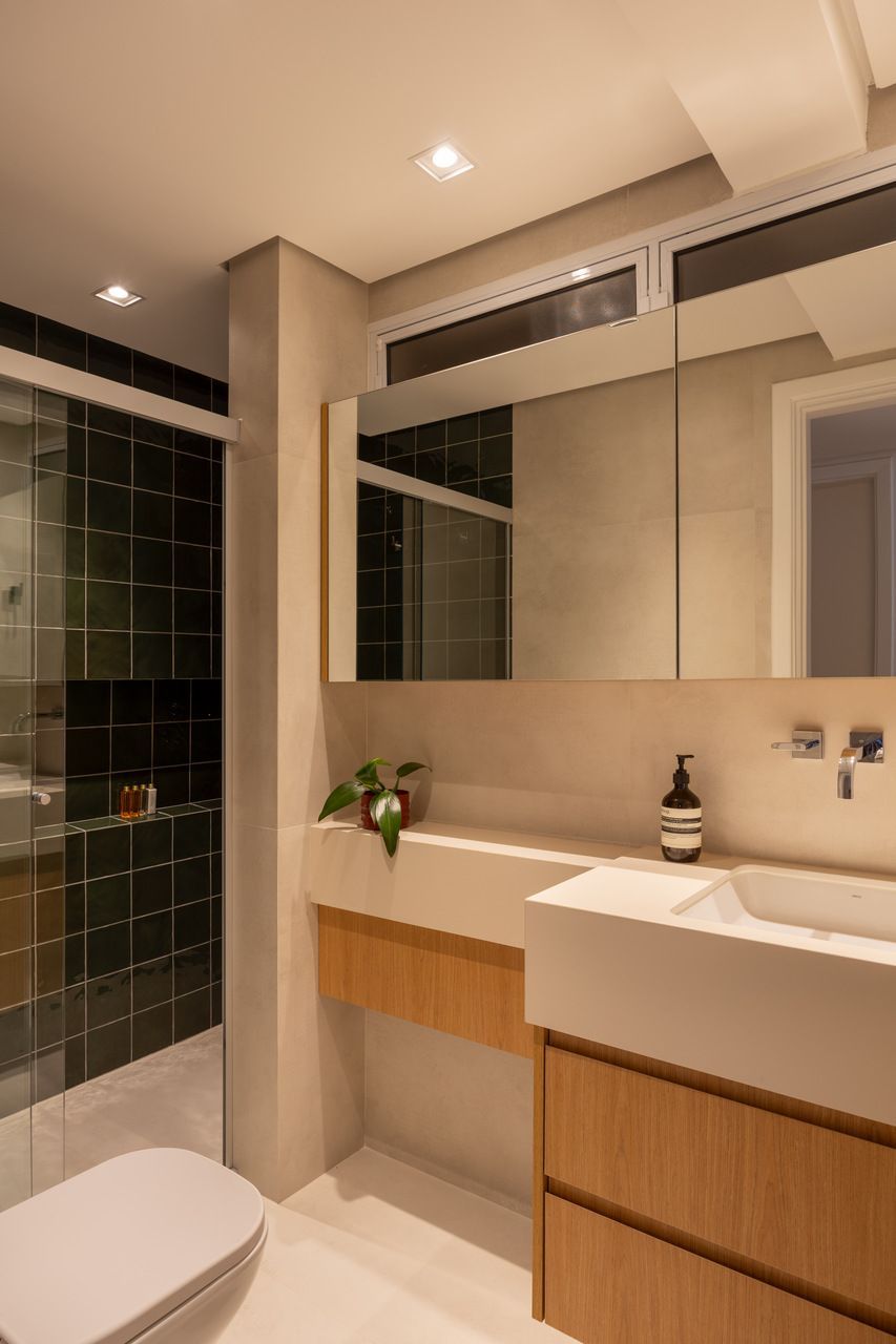 A reforma exigiu decisões estruturais importantes. Cozinha e living foram totalmente integrados, o banheiro de serviço deu lugar a um lavabo, todas as áreas molhadas foram refeitas e as infraestruturas elétrica, hidráulica e de ar-condicionado passaram por atualização completa. A troca das esquadrias por modelos acústicos foi essencial para garantir conforto em um apartamento de esquina, exposto ao intenso movimento urbano, sem abrir mão da generosa entrada de luz natural.