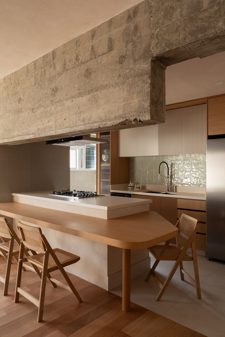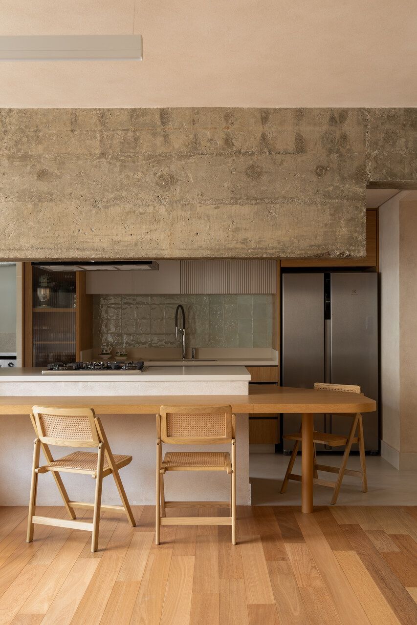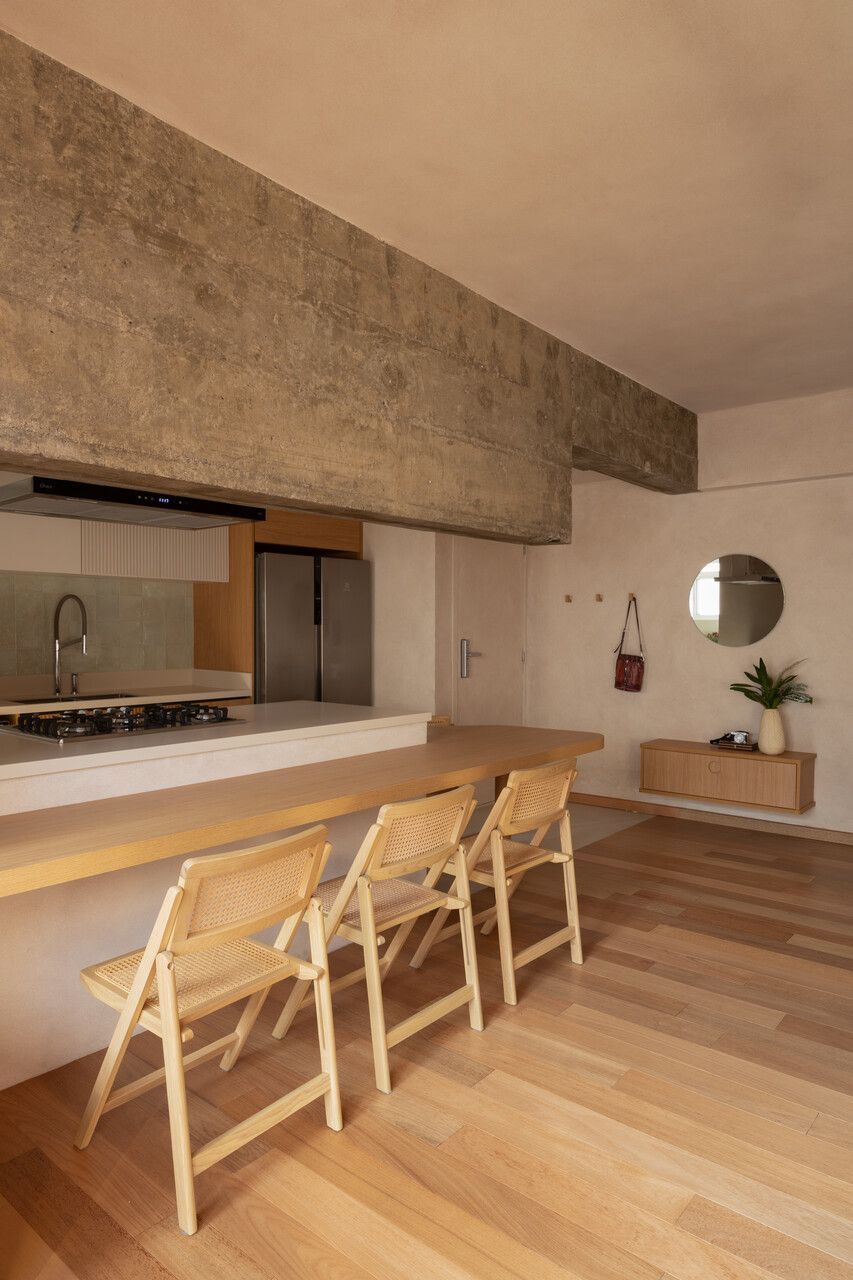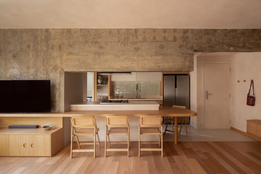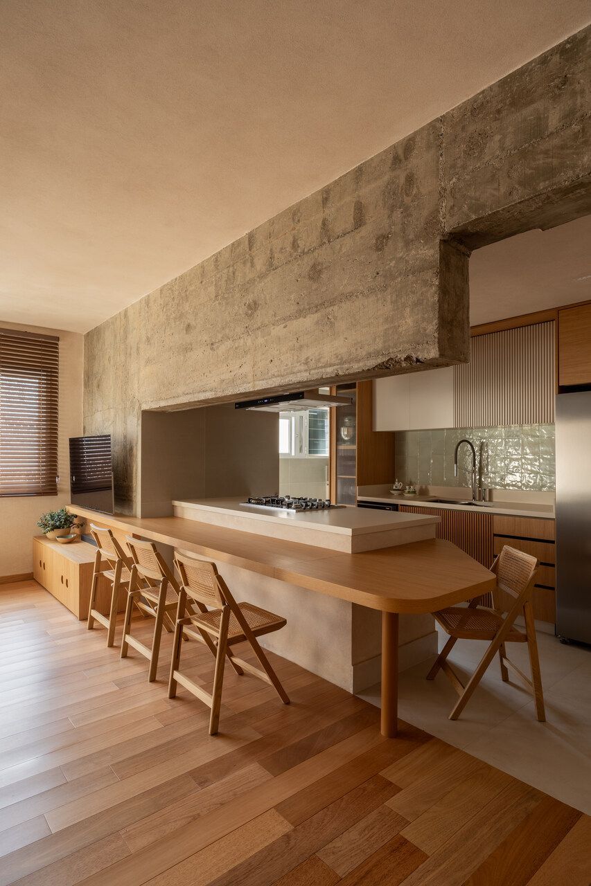 Durante as demolições, um desafio inesperado redefiniu o projeto: a descoberta de uma viga estrutural robusta e baixa, justamente na área onde se previa a ilha da cozinha. Em vez de ocultá-la, o MSAC Arquitetura optou por evidenciá-la, transformando-a no elemento mais emblemático da área social. Uma extensa bancada orgânica foi desenhada para contornar o desnível e conectar cozinha, jantar e estar, assumindo inclusive parte dos vergalhões aparentes. A viga deixou de ser obstáculo para se tornar o grande gesto arquitetônico do apartamento.