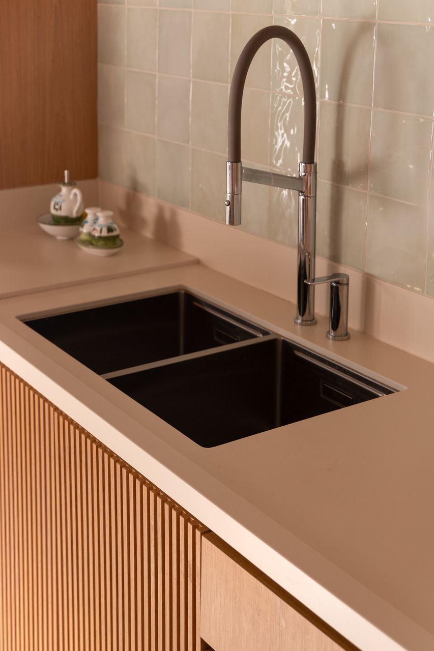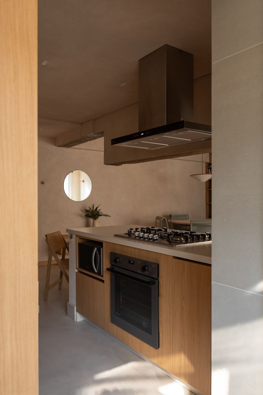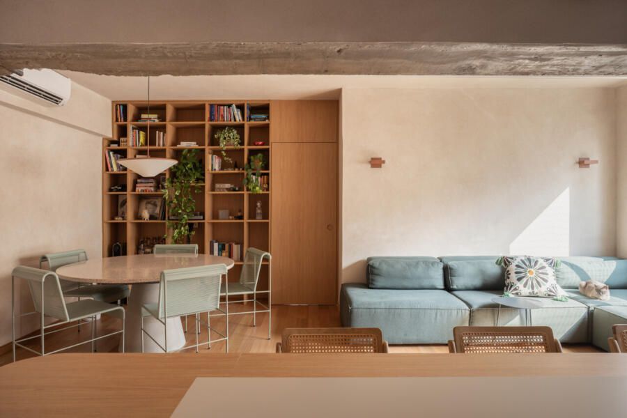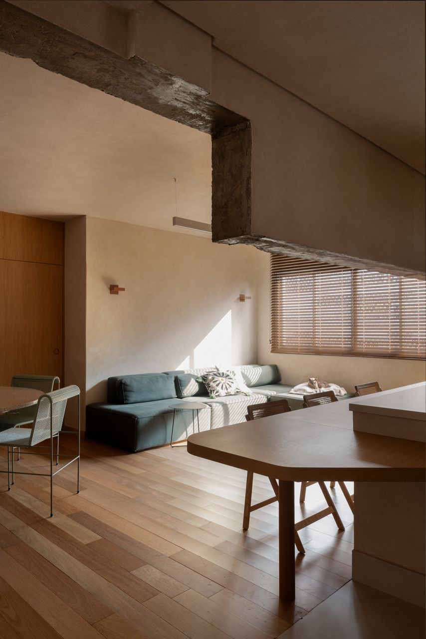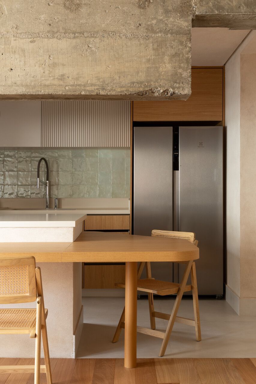 Durante as demolições, um desafio inesperado redefiniu o projeto: a descoberta de uma viga estrutural robusta e baixa, justamente na área onde se previa a ilha da cozinha. Em vez de ocultá-la, o MSAC Arquitetura optou por evidenciá-la, transformando-a no elemento mais emblemático da área social. Uma extensa bancada orgânica foi desenhada para contornar o desnível e conectar cozinha, jantar e estar, assumindo inclusive parte dos vergalhões aparentes. A viga deixou de ser obstáculo para se tornar o grande gesto arquitetônico do apartamento.