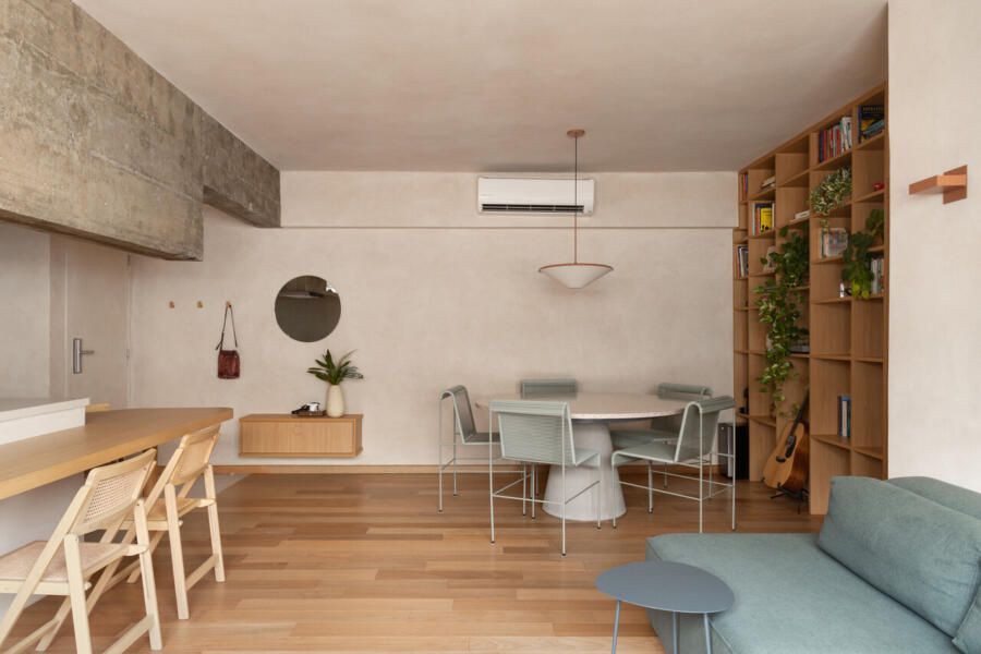 Apê com texturas naturais e integração entre ambientes