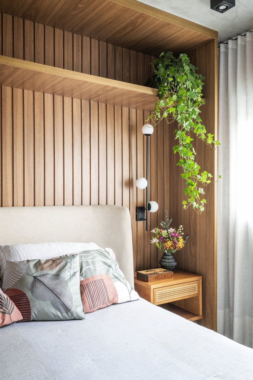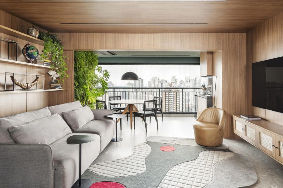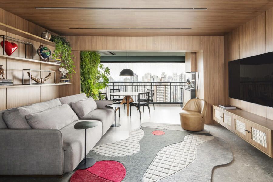 Um projeto que se destaca pela integração dos espaços, pela ousadia cromática equilibrada, pela personalidade e pelo paisagismo com plantas naturais — elemento que, inclusive, despertou um novo hobby nos moradores e tornou o apartamento ainda mais vivo.
