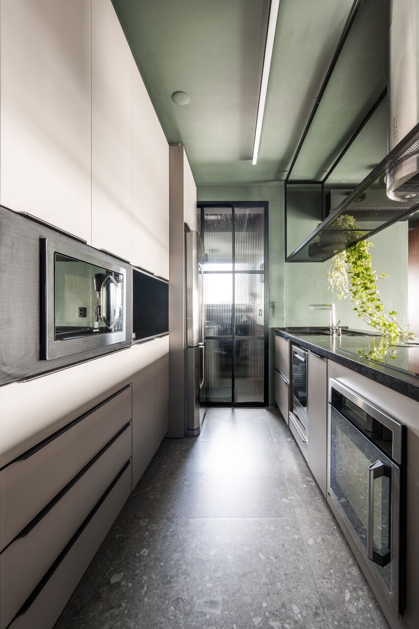 A paleta de cores é um dos grandes protagonistas deste projeto com personalidade. O verde Roda Gigante, da Suvinil, impera na sala e na cozinha, contrastando com preto, cinza, madeira em tom de mel e pontos precisos de vermelho, como a luminária e o tapete. O uso do mesmo porcelanato em todo o apartamento, inclusive nas paredes do banheiro, garante unidade visual e amplia a percepção de espaço. Na cozinha e na varanda, o granito preto São Gabriel escovado reforça o caráter contemporâneo e sofisticado.