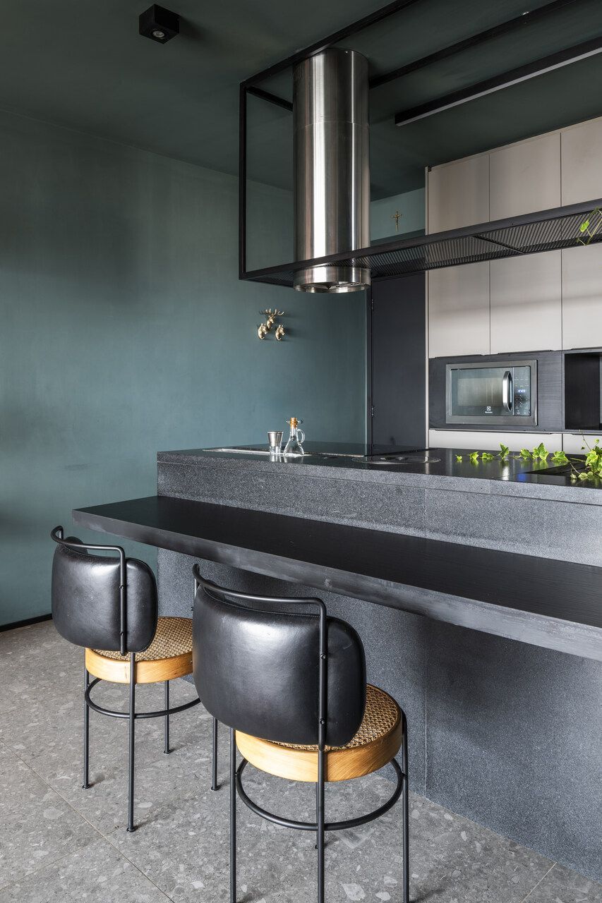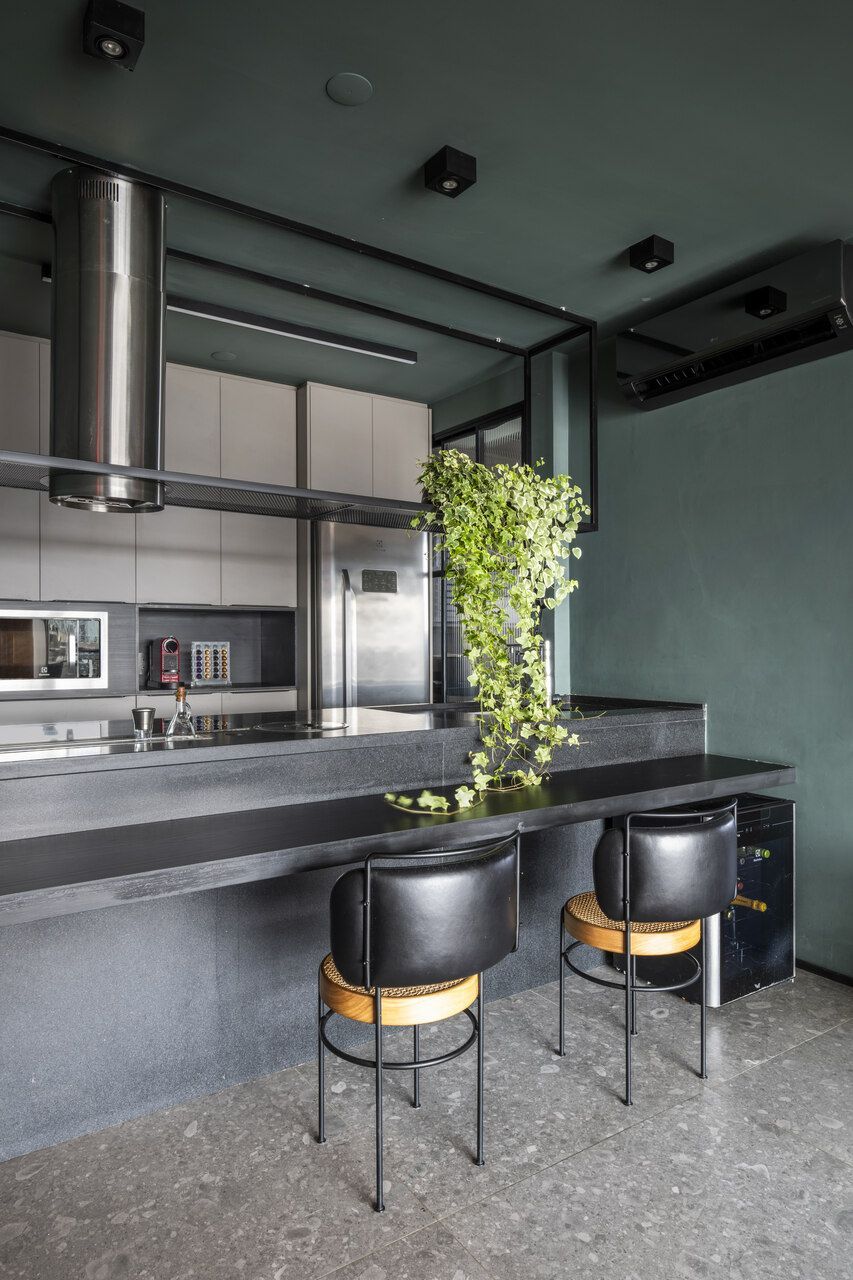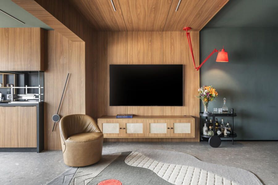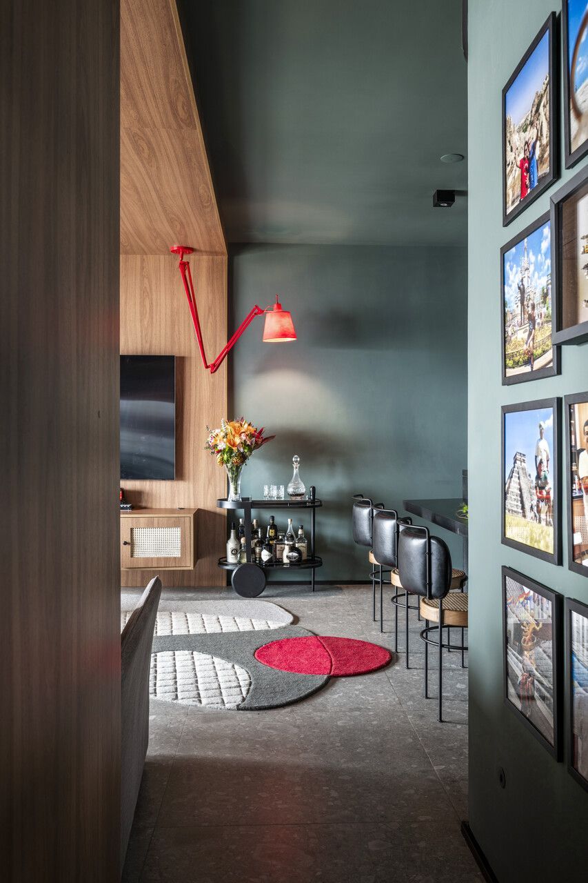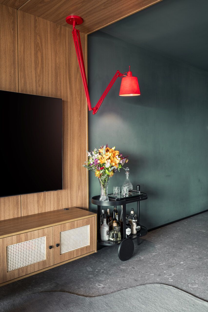 A paleta de cores é um dos grandes protagonistas deste projeto com personalidade. O verde Roda Gigante, da Suvinil, impera na sala e na cozinha, contrastando com preto, cinza, madeira em tom de mel e pontos precisos de vermelho, como a luminária e o tapete. O uso do mesmo porcelanato em todo o apartamento, inclusive nas paredes do banheiro, garante unidade visual e amplia a percepção de espaço. Na cozinha e na varanda, o granito preto São Gabriel escovado reforça o caráter contemporâneo e sofisticado.