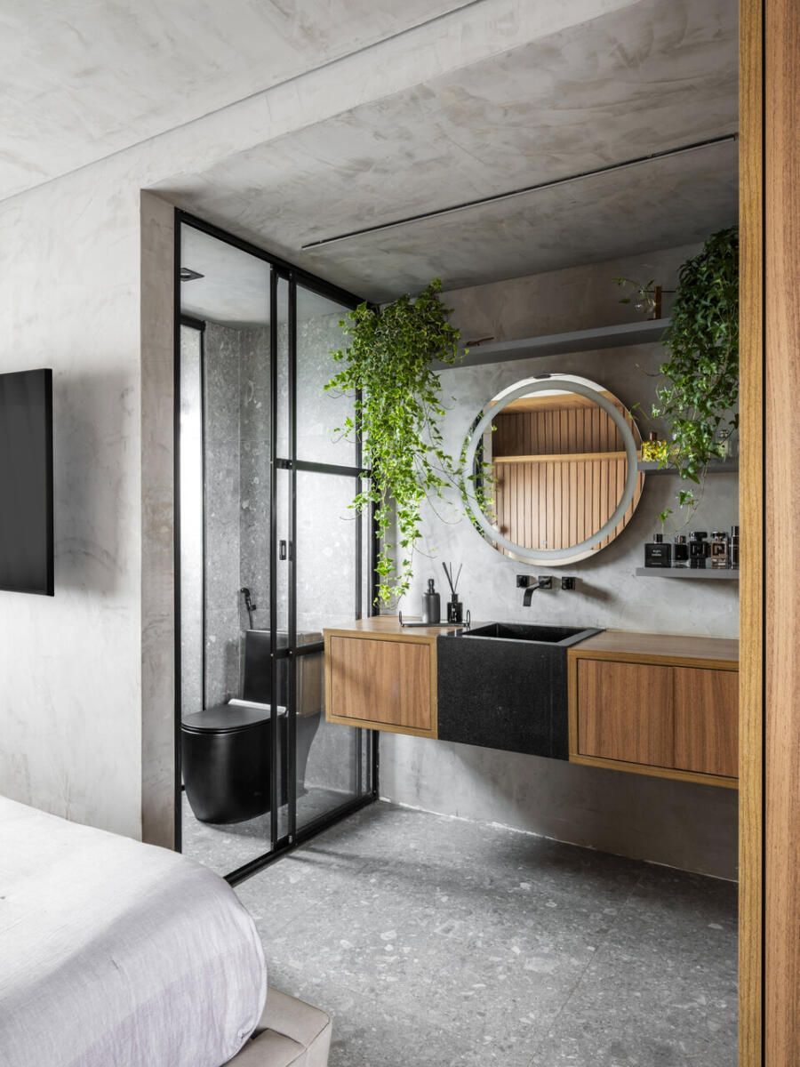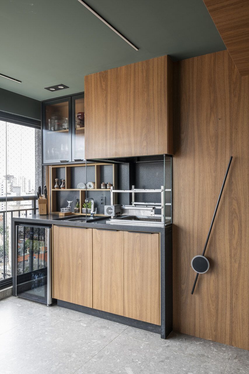 Cada ambiente revela escolhas pensadas nos mínimos detalhes. A cozinha aposta em MDF cinza chumbo, serralheria suspensa e uma ilha com quatro banquetas para refeições rápidas. Na sala, o conforto dita o ritmo: sofá profundo, circulação generosa, estante de apoio com tomadas e um baú discreto atrás do encosto. A sacada abriga um jardim vertical natural com irrigação automática, churrasqueira e cervejeira, enquanto o quarto de casal surpreende pela integração do banheiro, pelo roupeiro bem resolvido e pelo office incorporado ao antigo segundo dormitório.