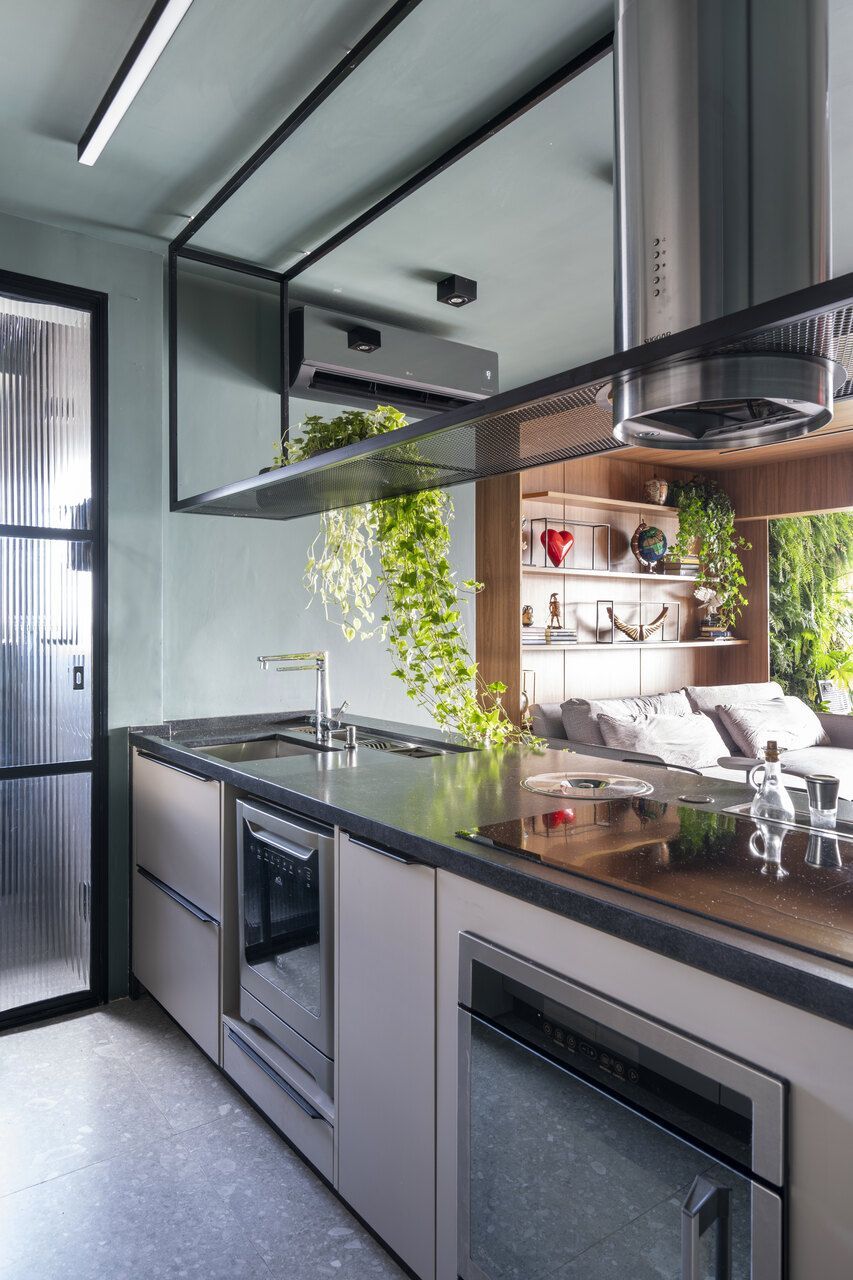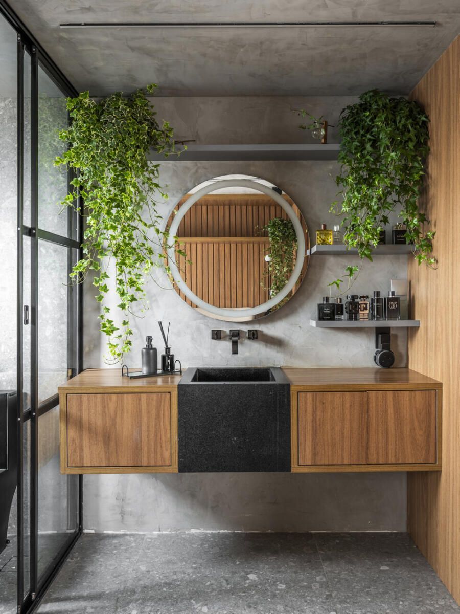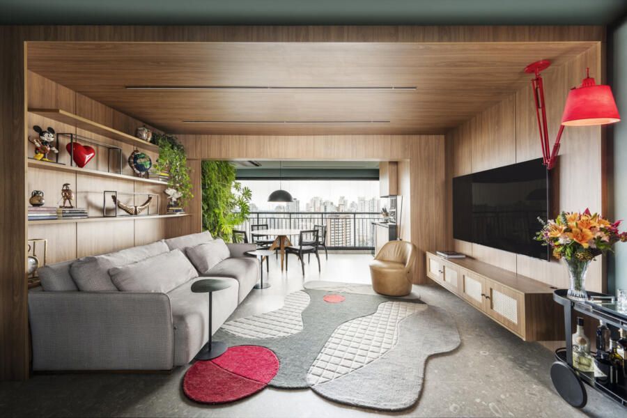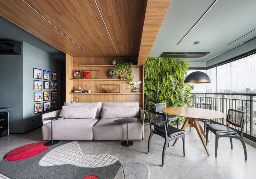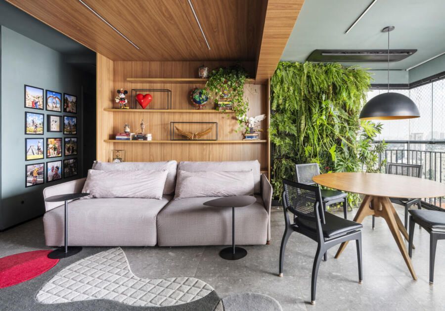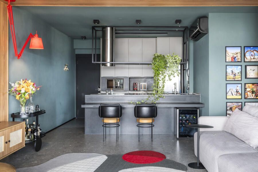 Um projeto que se destaca pela integração dos espaços, pela ousadia cromática equilibrada, pela personalidade e pelo paisagismo com plantas naturais — elemento que, inclusive, despertou um novo hobby nos moradores e tornou o apartamento ainda mais vivo.
