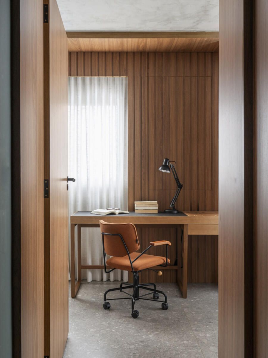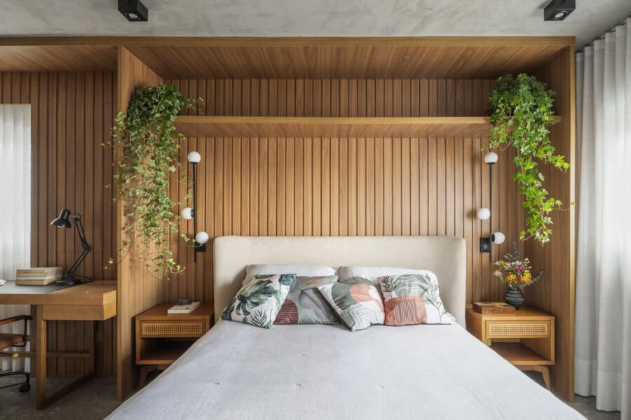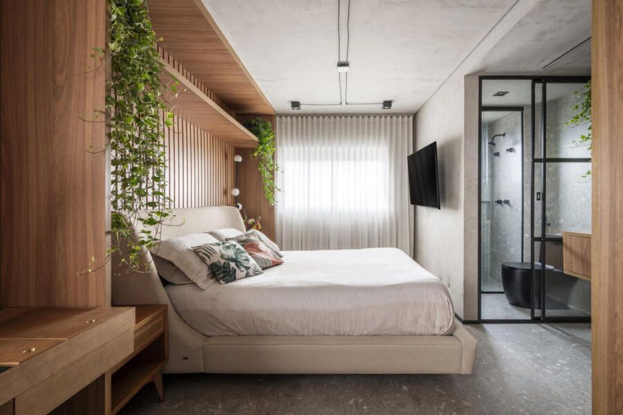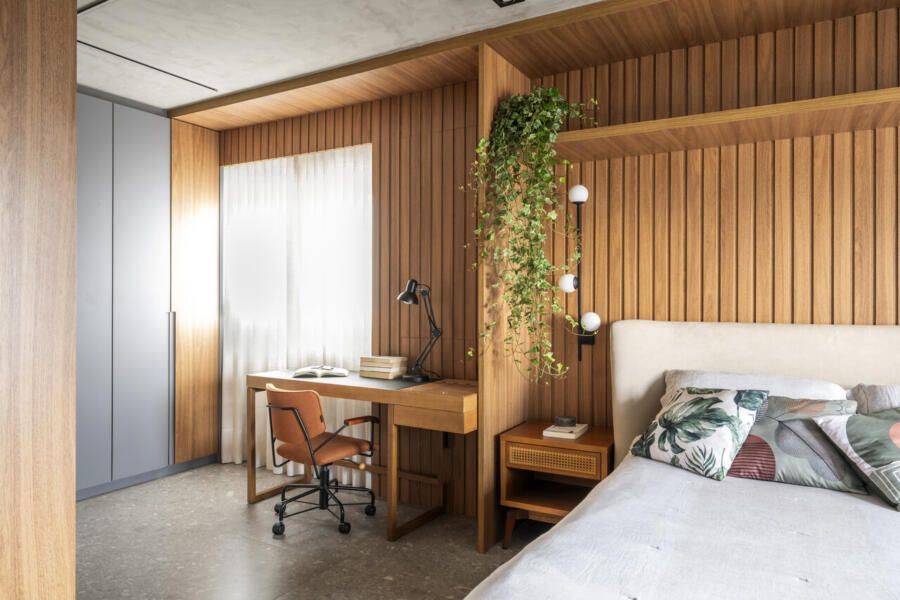 O desafio principal foi equilibrar funcionalidade e expressão estética. A solução veio por meio de uma marcenaria desenhada sob medida, com linhas retas e MDF em tom caramelo, além de um home office integrado ao quarto, com painel para livros em pouca profundidade, mas extremamente eficiente. A integração do banheiro ao dormitório possibilitou uma bancada maior e reforçou a sensação de fluidez entre os ambientes, algo essencial para o dia a dia do casal.