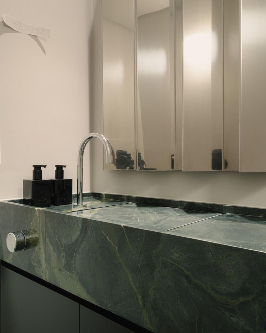 O apê contemporâneo exigiu escolhas ousadas desde o início. A planta apresentava a área de serviço no centro da sala, um desafio que poderia comprometer a fluidez e a leveza que o casal buscava. Para resolver o impasse, o arquiteto apostou em uma solução integrada, discreta e inteligente, que esconde equipamentos e funções sem criar barreiras visuais. O mesmo raciocínio guiou a cozinha, desenhada na área social sem recorrer a múltiplos revestimentos, garantindo unidade estética e protagonismo dos materiais naturais.