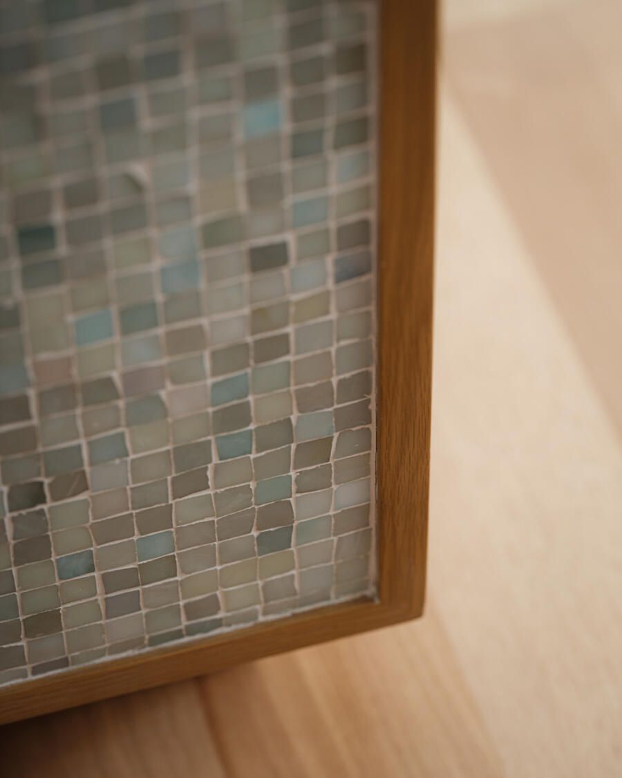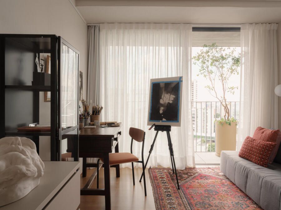 Como a moradora é artista, o pedido por uma galeria itinerante e um pequeno ateliê em casa tornou-se essencial. O estúdio pesquisou sistemas que evitassem danos às paredes e encontrou um suporte especial que permite alternar obras com facilidade, um recurso raro em projetos residenciais e que se tornou assinatura do apartamento. A personalização avançou também para os vitrais criados exclusivamente para o projeto, com desenhos e cores escolhidos pela moradora, inspirados no “germinar das sementes”. A luz que atravessa o vidro âmbar cria reflexos sutis e quase meditativos ao longo do dia.