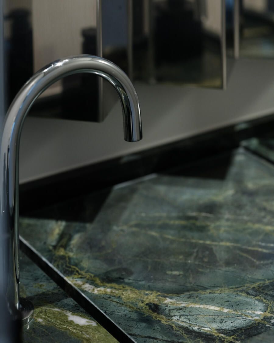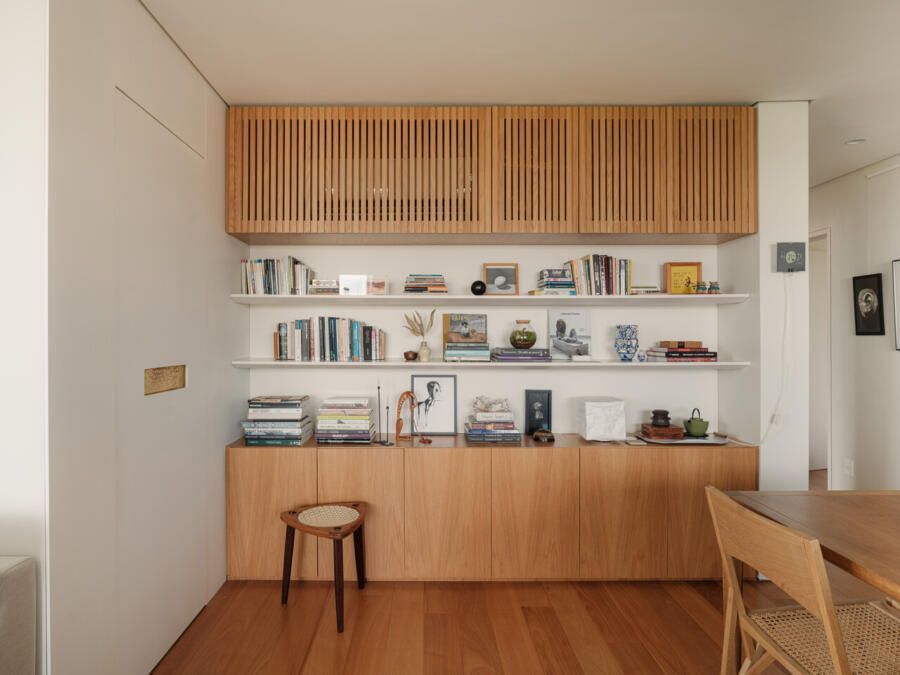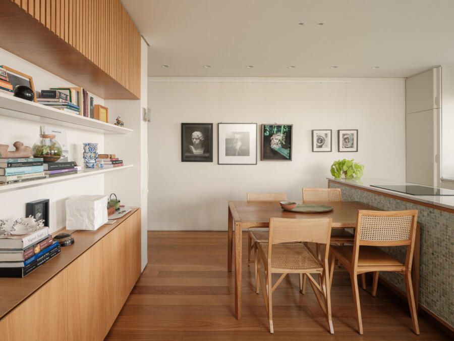 O apê contemporâneo exigiu escolhas ousadas desde o início. A planta apresentava a área de serviço no centro da sala, um desafio que poderia comprometer a fluidez e a leveza que o casal buscava. Para resolver o impasse, o arquiteto apostou em uma solução integrada, discreta e inteligente, que esconde equipamentos e funções sem criar barreiras visuais. O mesmo raciocínio guiou a cozinha, desenhada na área social sem recorrer a múltiplos revestimentos, garantindo unidade estética e protagonismo dos materiais naturais.