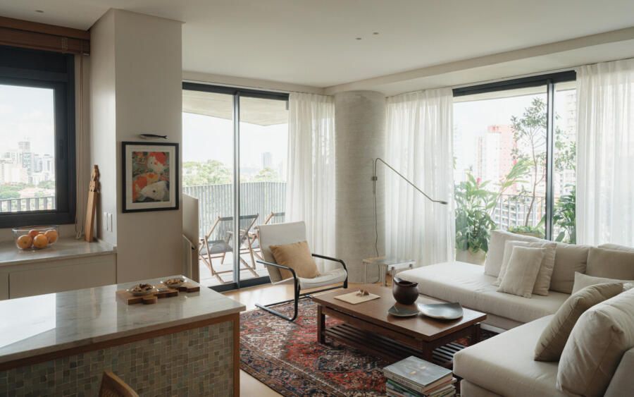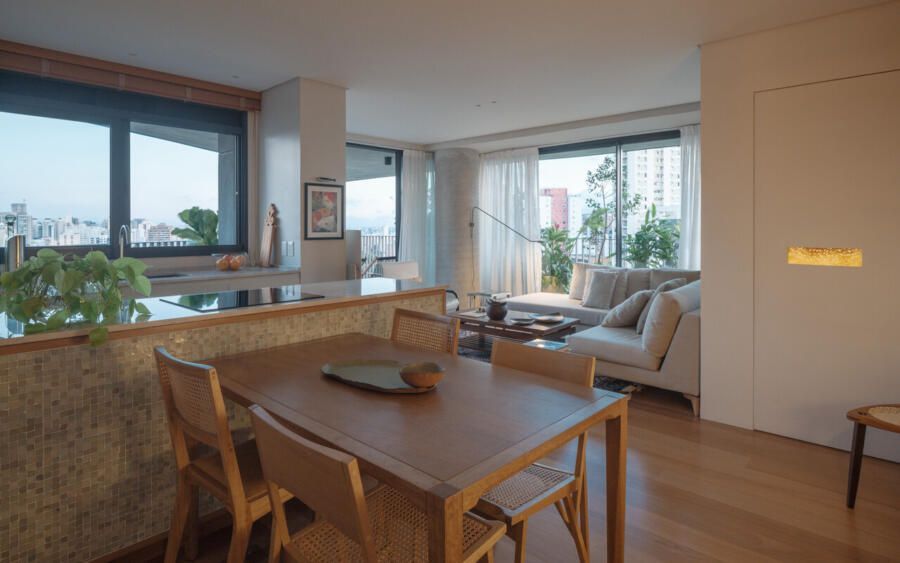 “Todos os dias percebemos o acerto do layout, pensado para enquadrar a vista com o horizonte da cidade. As janelas atuam como quadros vivos de uma forma muito natural. Ver o movimento da metrópole à distância nos traz uma calma inesperada, servindo de contraponto à tranquilidade que temos aqui. O horizonte se tornou um elemento da casa, um fundo para nosso dia a dia que expande a sensação de liberdade.”