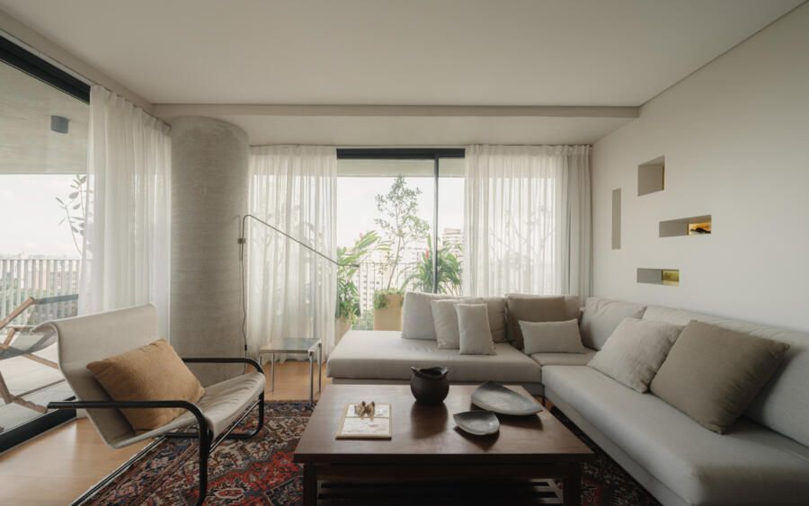 A presença do paisagista Bruno Moreno complementa a composição com texturas verdes, reforçando o caráter acolhedor e fluido da proposta. No conjunto, o apartamento se revela um espaço que respira e onde a arte muda de posição, a luz se transforma e o horizonte se torna parte do cotidiano. Um lar moldado para que a vida e a criatividade aconteçam com naturalidade.