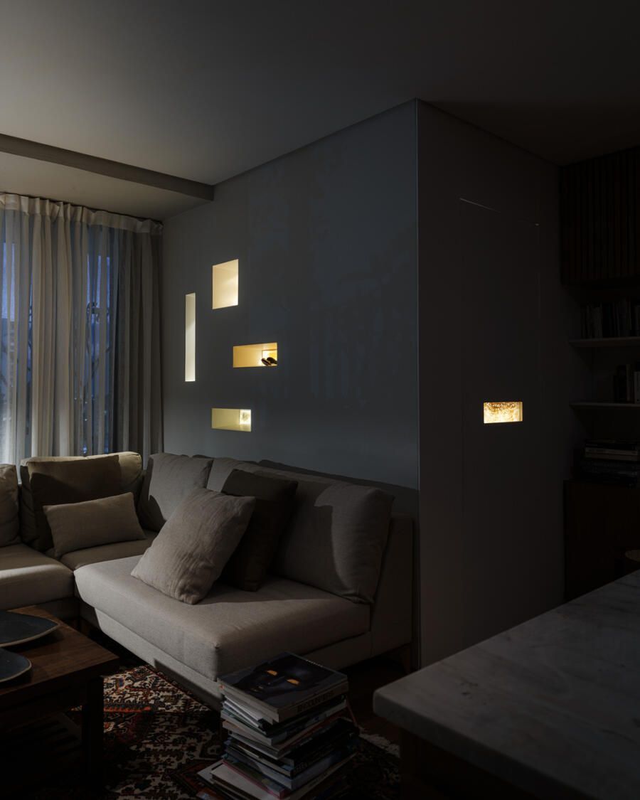 O aconchego, porém, não se apoia apenas na luz. A marcenaria feita sob medida organiza a vida e o ateliê, enquanto a iluminação — natural durante o dia e cenográfica à noite — permite com que os ambientes se adequem a cada momento. Seja para destacar uma obra nova, para trabalhar ou simplesmente para relaxar, a casa responde com suavidade.