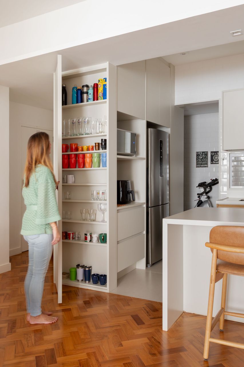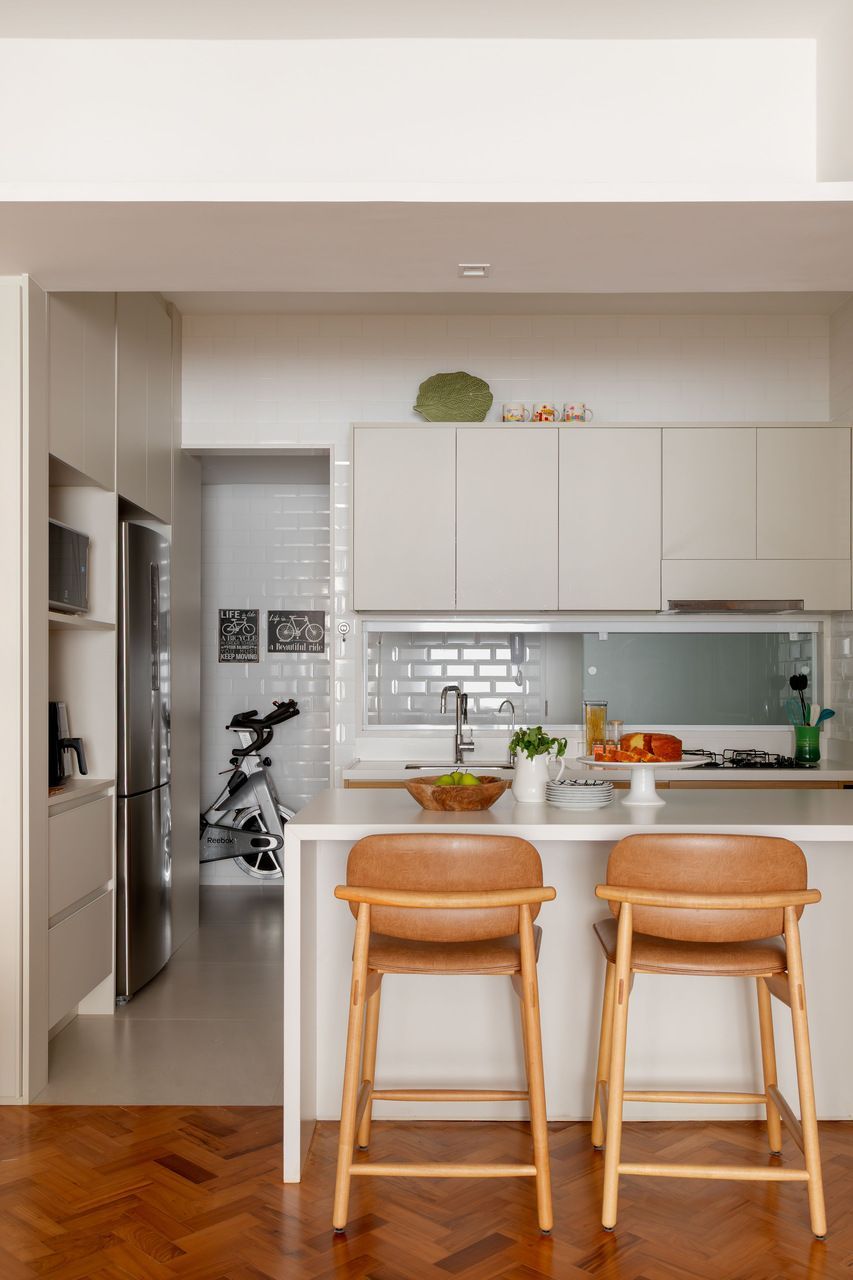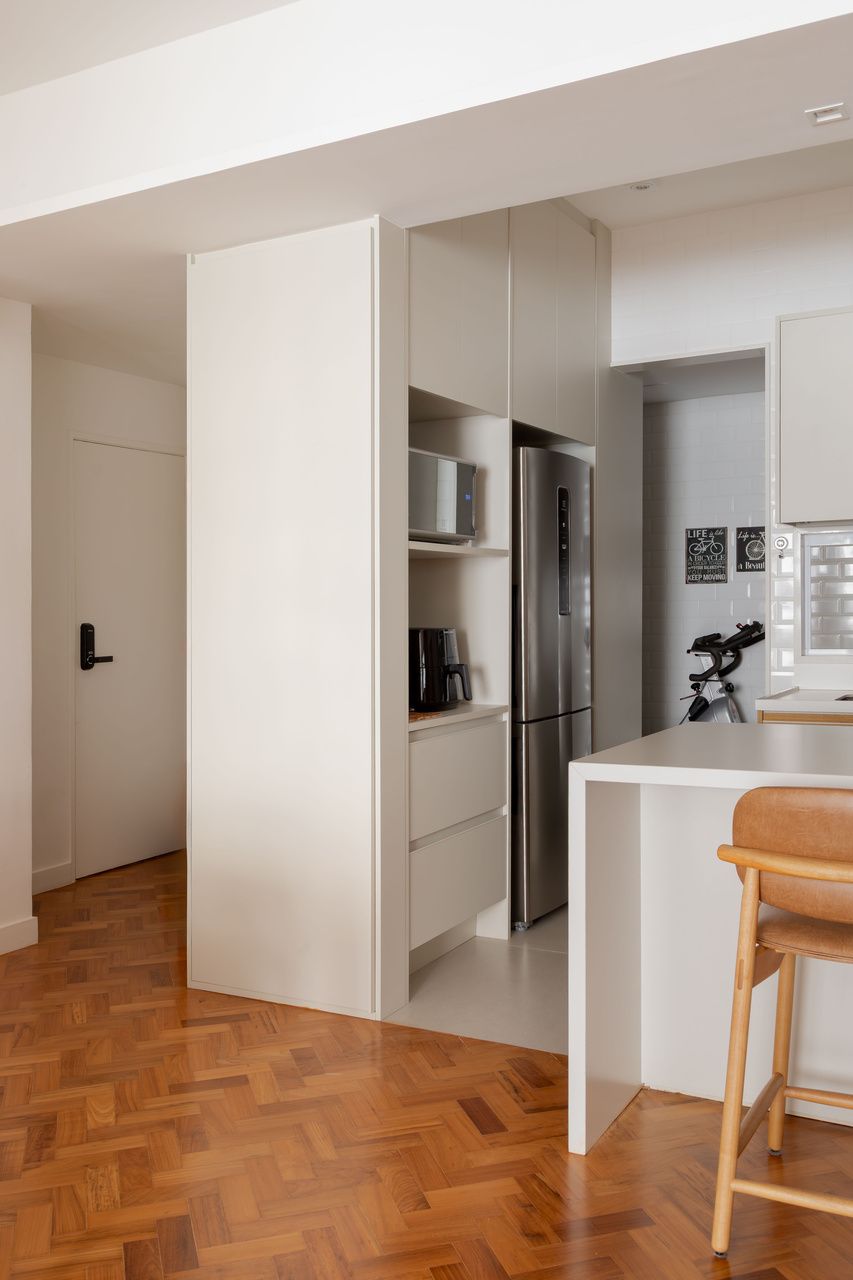 “Projetei a cozinha aberta para a sala, com bancada para refeições rápidas, e a área de serviço com ventilação cruzada por meio de visor de vidro, incluindo um espaço destinado ao treino de bike do morador. Além disso, criei uma cristaleira camuflada na lateral da marcenaria da cozinha, que funciona como apoio discreto para a mesa de jantar”