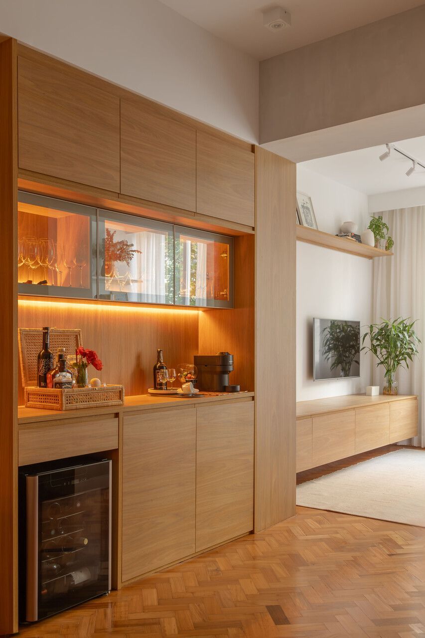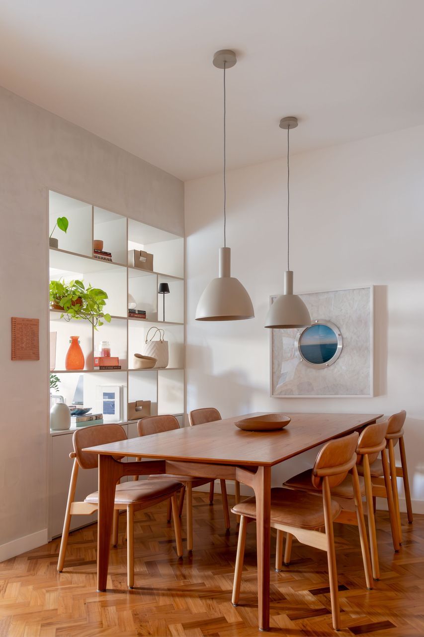 “O maior desafio deste projeto foi aproveitar o piso original em taco de peroba-do-campo. O trabalho exigiu cuidado e dedicação, mas valeu totalmente a pena, resultando em um acabamento estético impecável e conferindo identidade ao apartamento”