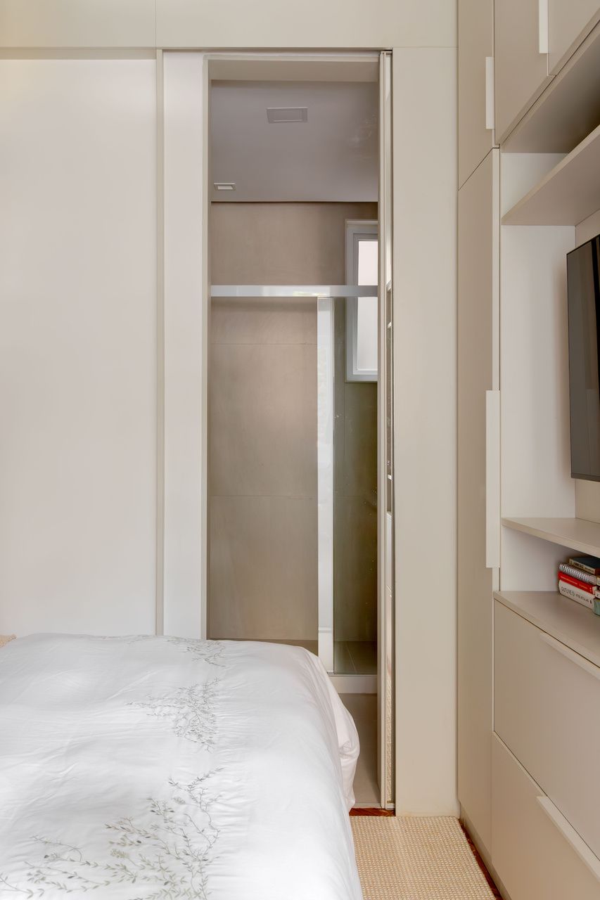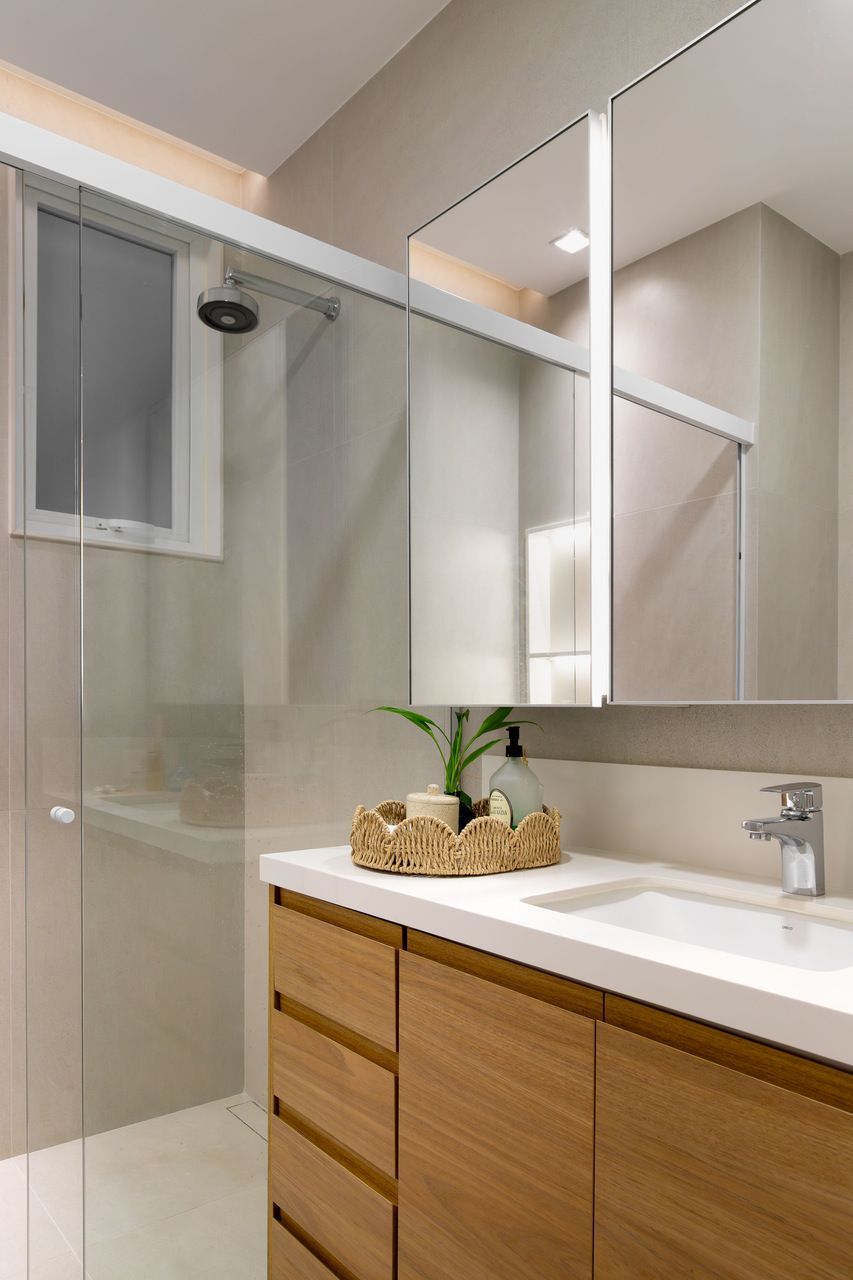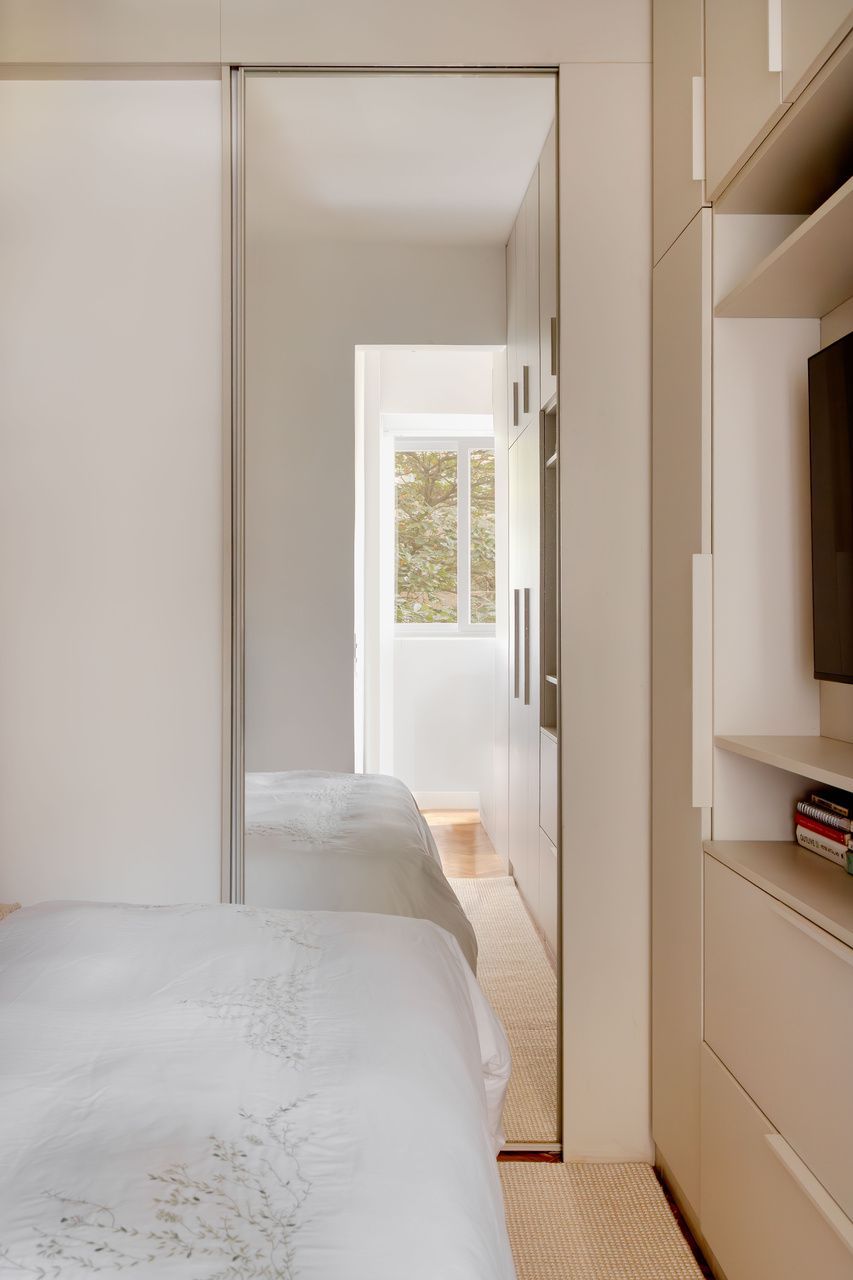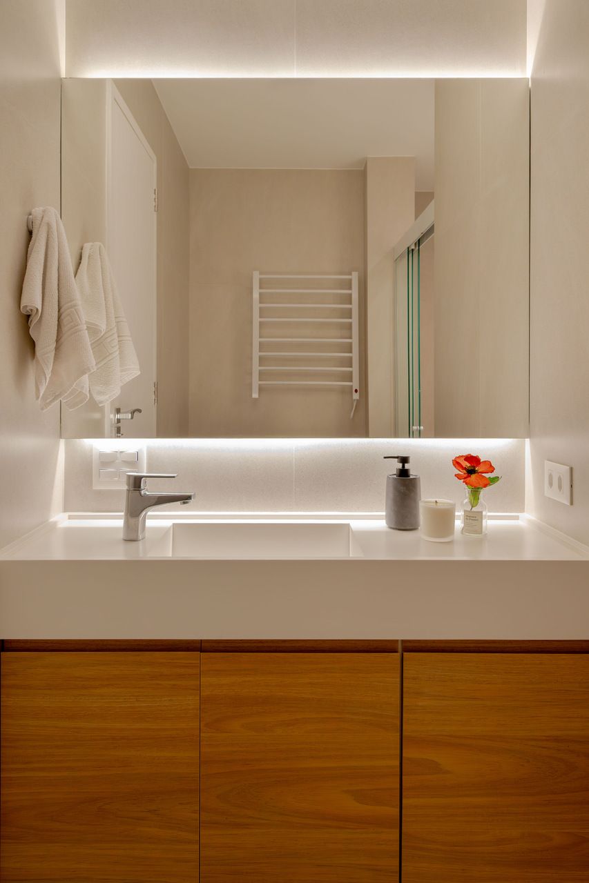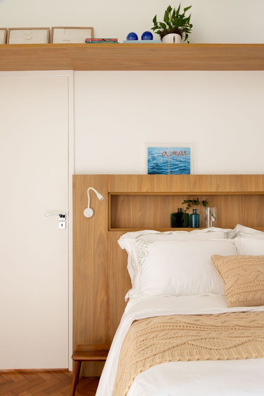 No quarto do casal, a funcionalidade se traduz em soluções discretas e bem desenhadas. Uma porta de correr revestida com espelho esconde o acesso ao banheiro, ampliando visualmente o ambiente, enquanto o painel de marcenaria funciona como cabeceira da cama. O conjunto inclui nicho superior para livros e objetos pessoais e luminárias laterais com hastes direcionáveis, pensadas para a leitura e o uso cotidiano.