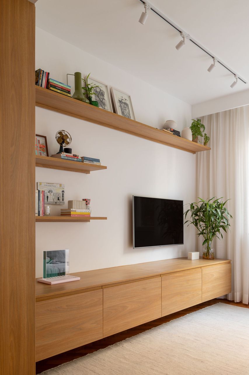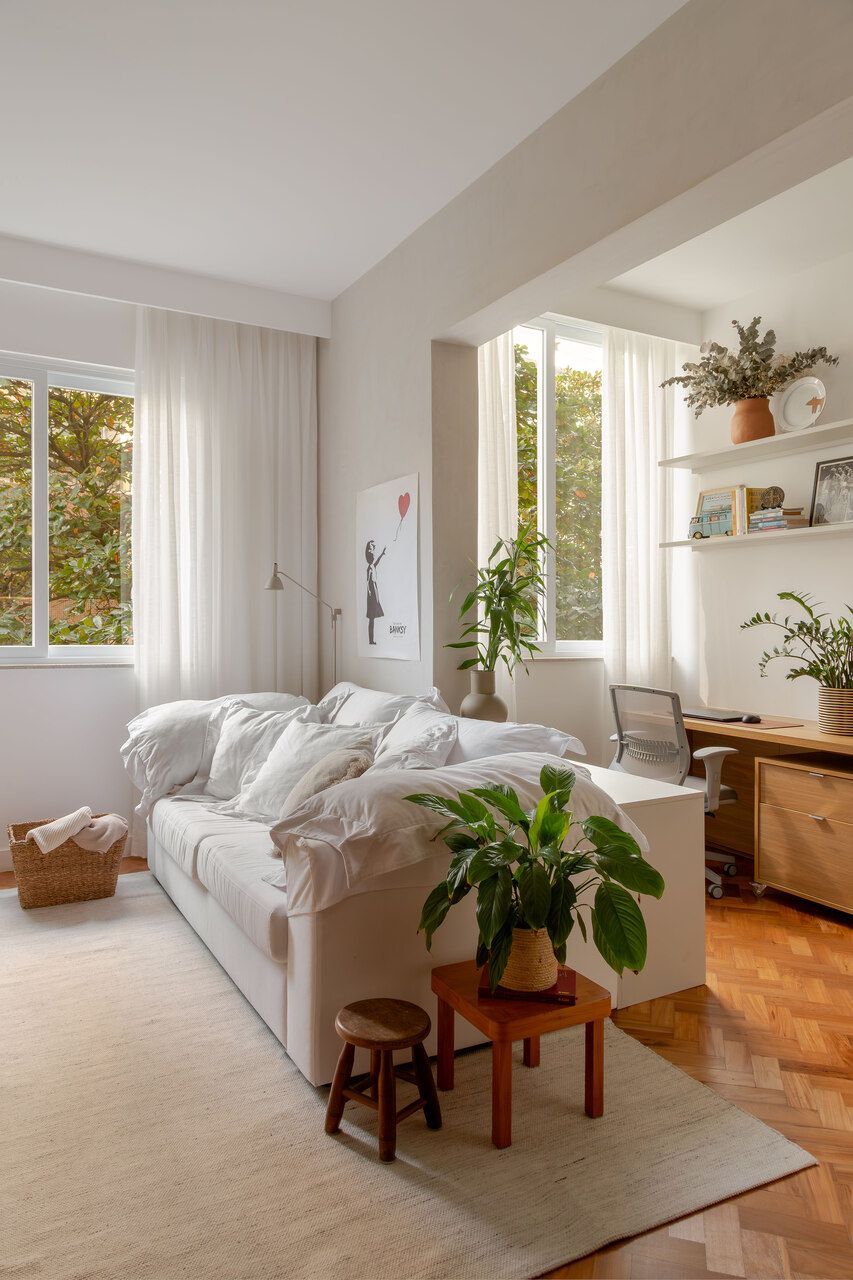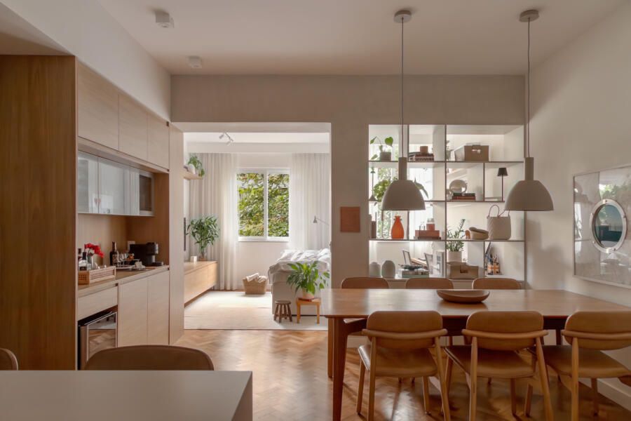 A decoração aposta em uma atmosfera leve e acolhedora, construída a partir de uma paleta neutra e clara. Tons de branco e off-white aparecem nas paredes, nos armários da cozinha, nos estofados, tapetes e cortinas, criando uma base serena e contínua. O calor visual vem das marcenarias em MDF amadeirado, dos estofamentos em couro caramelo e, principalmente, do piso original em taco de peroba-do-campo, que atravessa os ambientes como elemento de identidade.