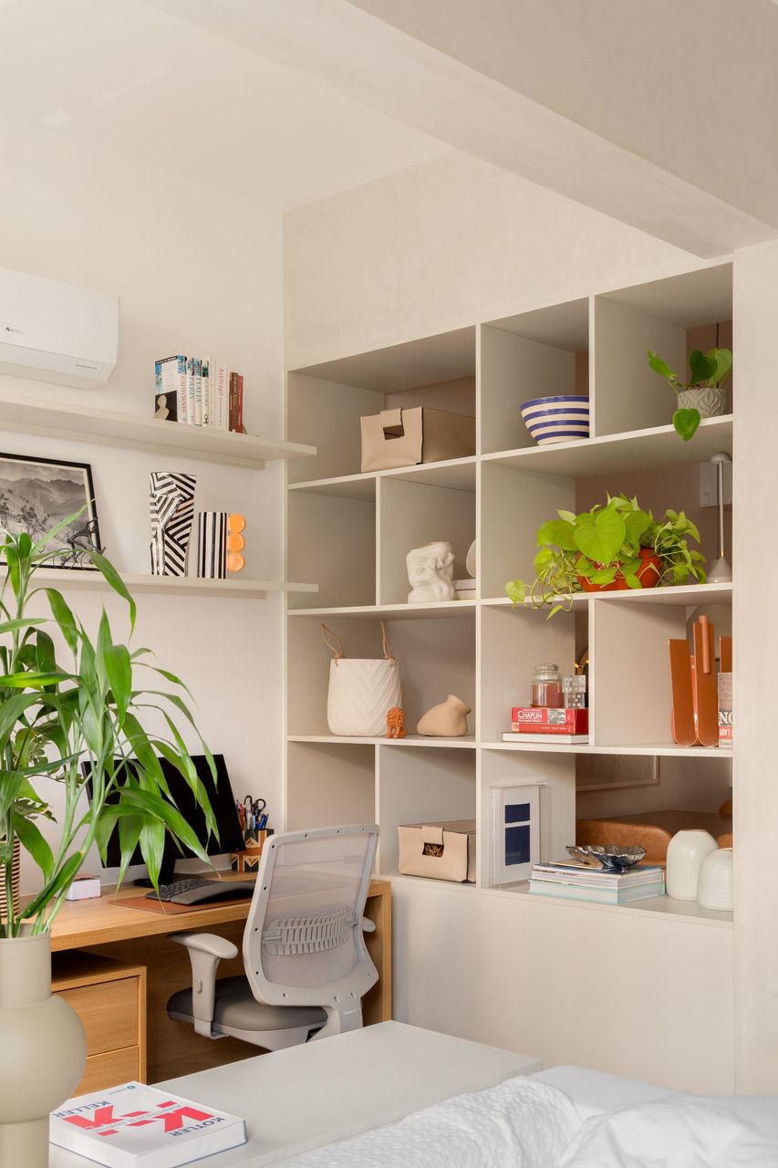 Outro destaque do projeto é o escritório, implantado de forma pouco óbvia, mas extremamente eficiente. Posicionado entre as costas do sofá e uma estante lateral vazada, o espaço de trabalho se conecta à área social sem comprometer a entrada de luz natural vinda da janela principal. A solução delimita funções, organiza a planta e reforça a sensação de amplitude, mesmo em um apartamento de 100m².