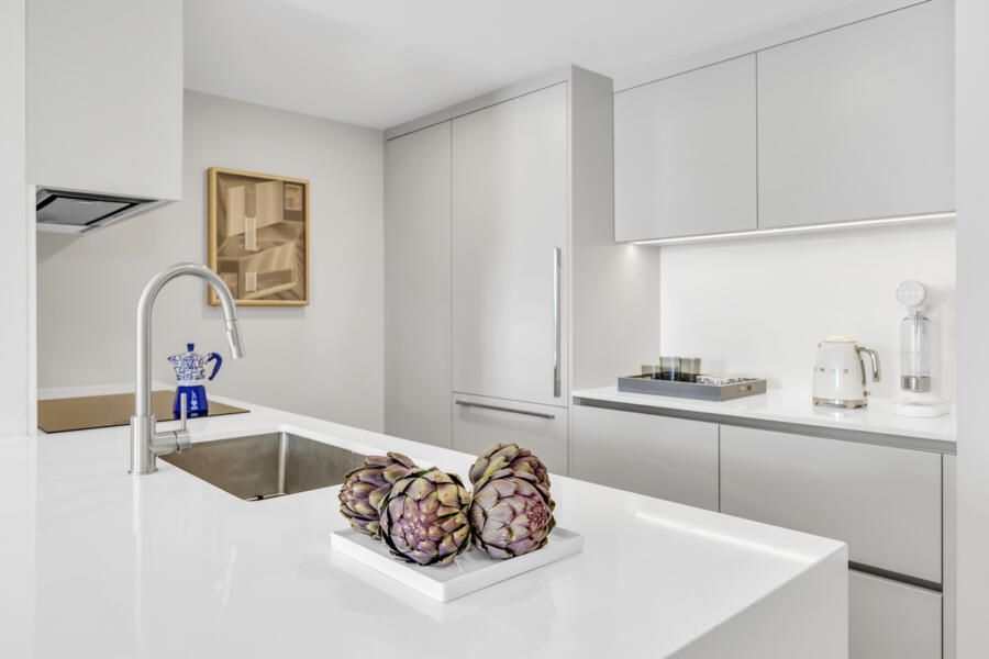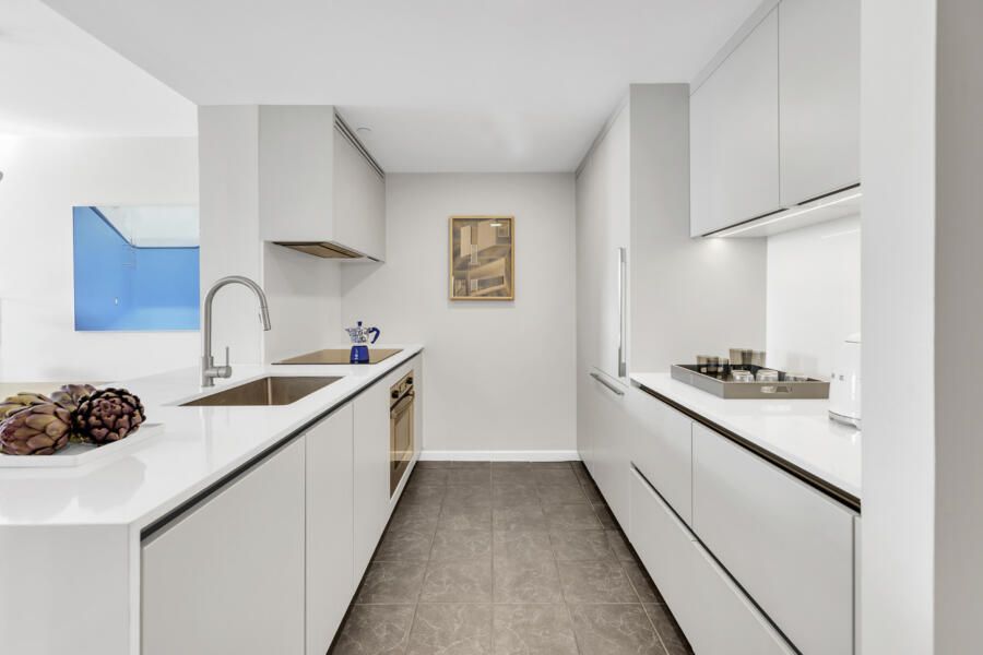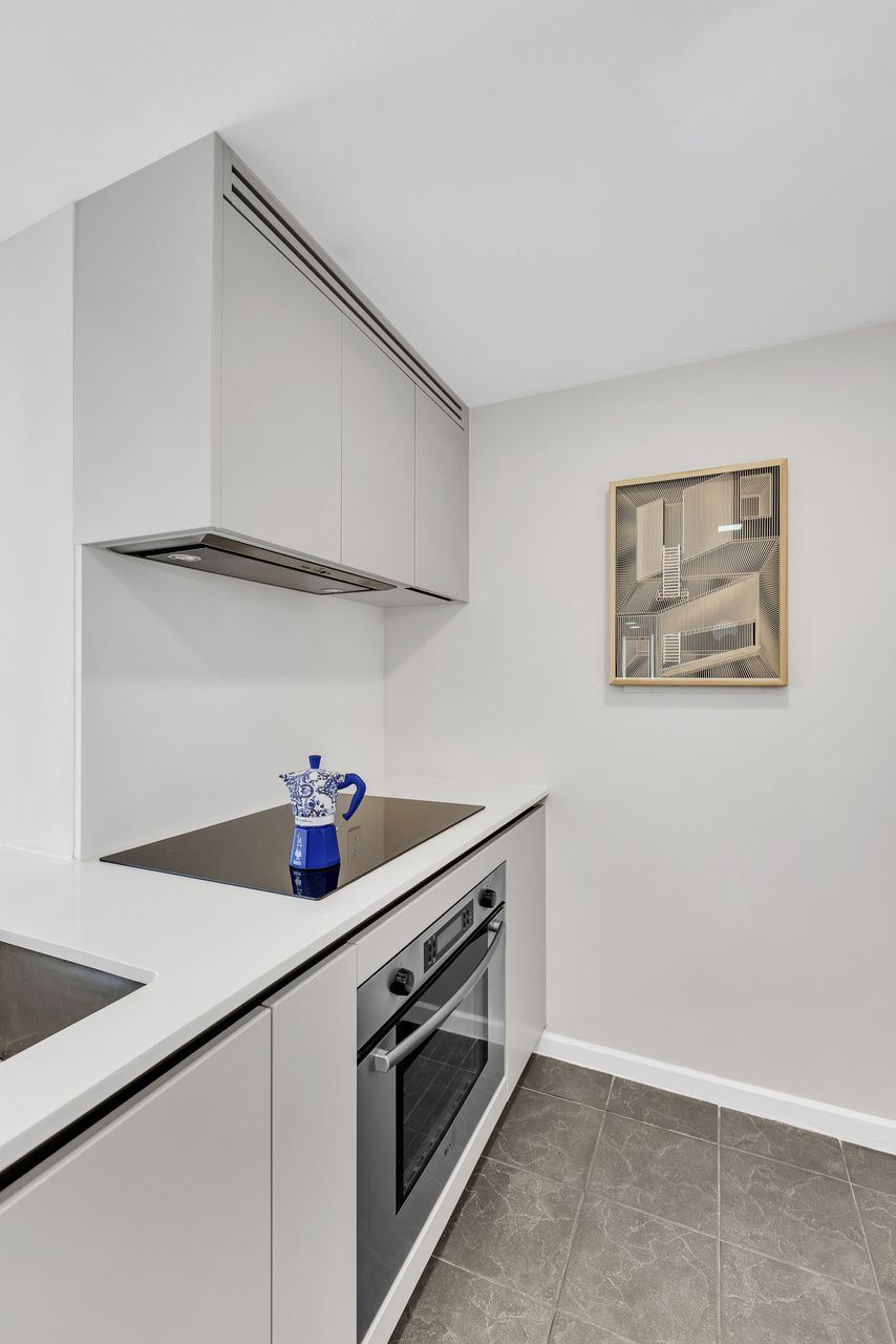 Em vez de ocultar ou competir com o piso escuro, o projeto o acolhe como ponto de partida, e esse contraste guiou escolhas que iluminam e ampliam o espaço. A cozinha e o banheiro foram completamente renovados, ganhando marcenaria sob medida e eletrodomésticos contemporâneos, enquanto uma bancada clara assume o protagonismo ao trazer leveza e transformar a cozinha em um núcleo luminoso e convidativo.