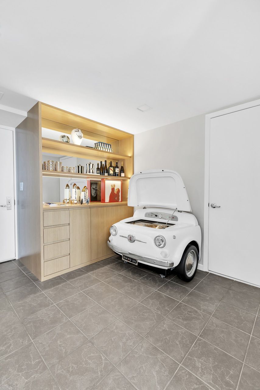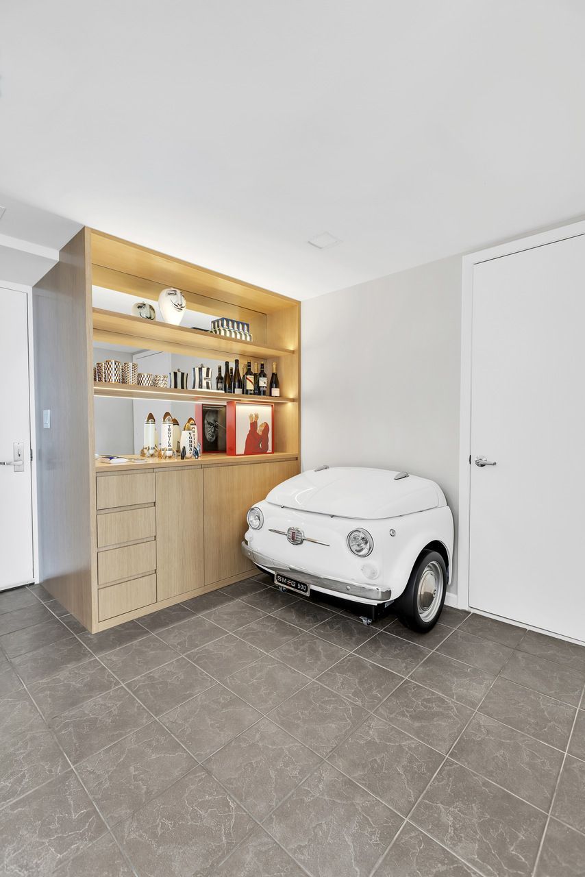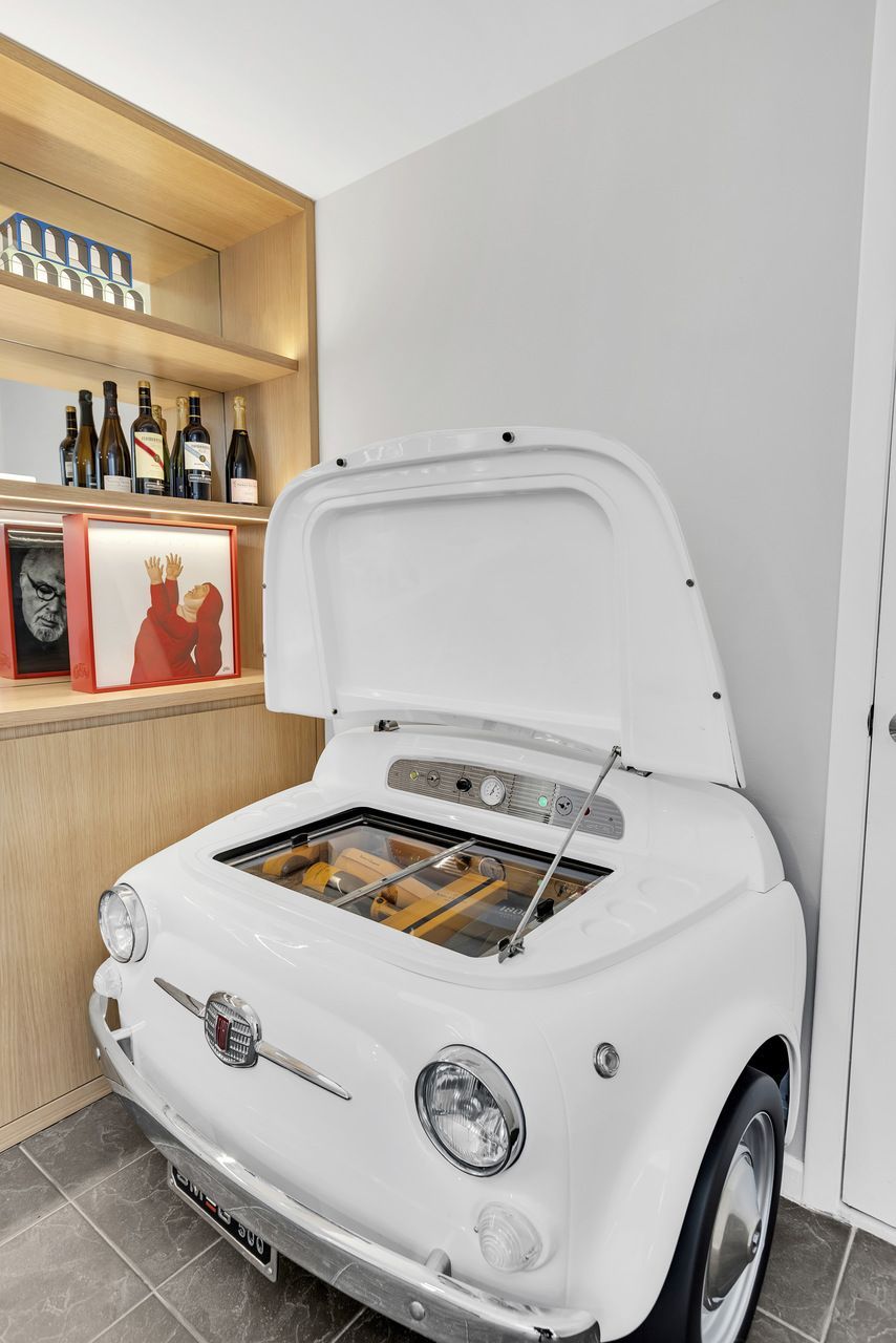 Entre os elementos mais marcantes, o espelho statement surge como síntese do conceito do projeto, abordando a ideia compartilhada entre arquiteto e cliente de que “Nós vemos o que queremos ver”. Ao lado de ícones do design italiano e de peças carregadas de memória afetiva, como a geladeira com inspiração retrô posicionada como bar, o apartamento se revela como uma composição íntima e sofisticada. Pequeno na metragem, mas expansivo na narrativa, o projeto transforma o cotidiano em experiência, onde arte, luz e design coexistem em perfeita harmonia.