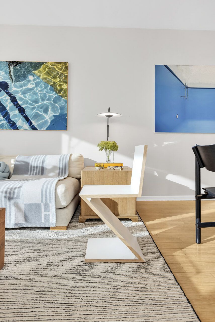 Na sala de estar e jantar, o desejo de criar um espaço pronto para receber ganha forma. As obras de Maritza Caneca introduzem uma vibração que remete ao imaginário de Miami, com tons de azul que evocam piscinas e trazem frescor ao ambiente. Já a peça do colombiano Christian Albarracín se destaca como um gesto lúdico e simbólico, capturando o olhar e instaurando um ponto de pausa na composição.