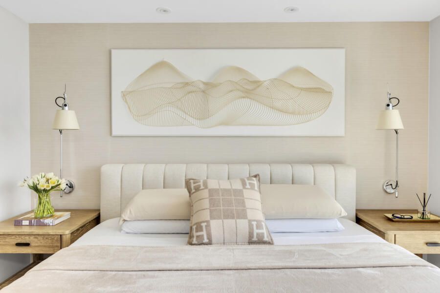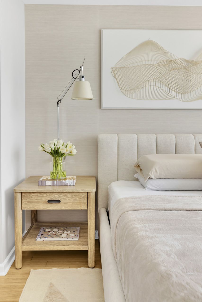 No quarto, a proposta se traduz em uma atmosfera sensorial, onde textura e luz se encontram. O papel de parede imprime profundidade, enquanto a iluminação escultural reforça o conceito de luz em camadas, um dos pilares do trabalho do Studio. A composição revela um equilíbrio delicado entre aconchego e expressão estética, criando um refúgio que dialoga com o restante do apartamento.