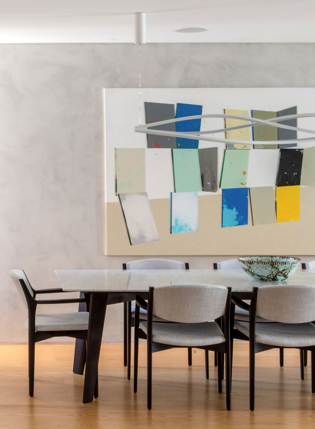 O layout da sala em formato quadrado foi o principal desafio, pois nela precisei organizar as áreas de jantar e estar, com seus diferentes tamanhos. Sendo assim, no espaço livre restante ao lado da mesa de jantar, aproveitei para criar um momento de leitura, com poltrona e tapete.