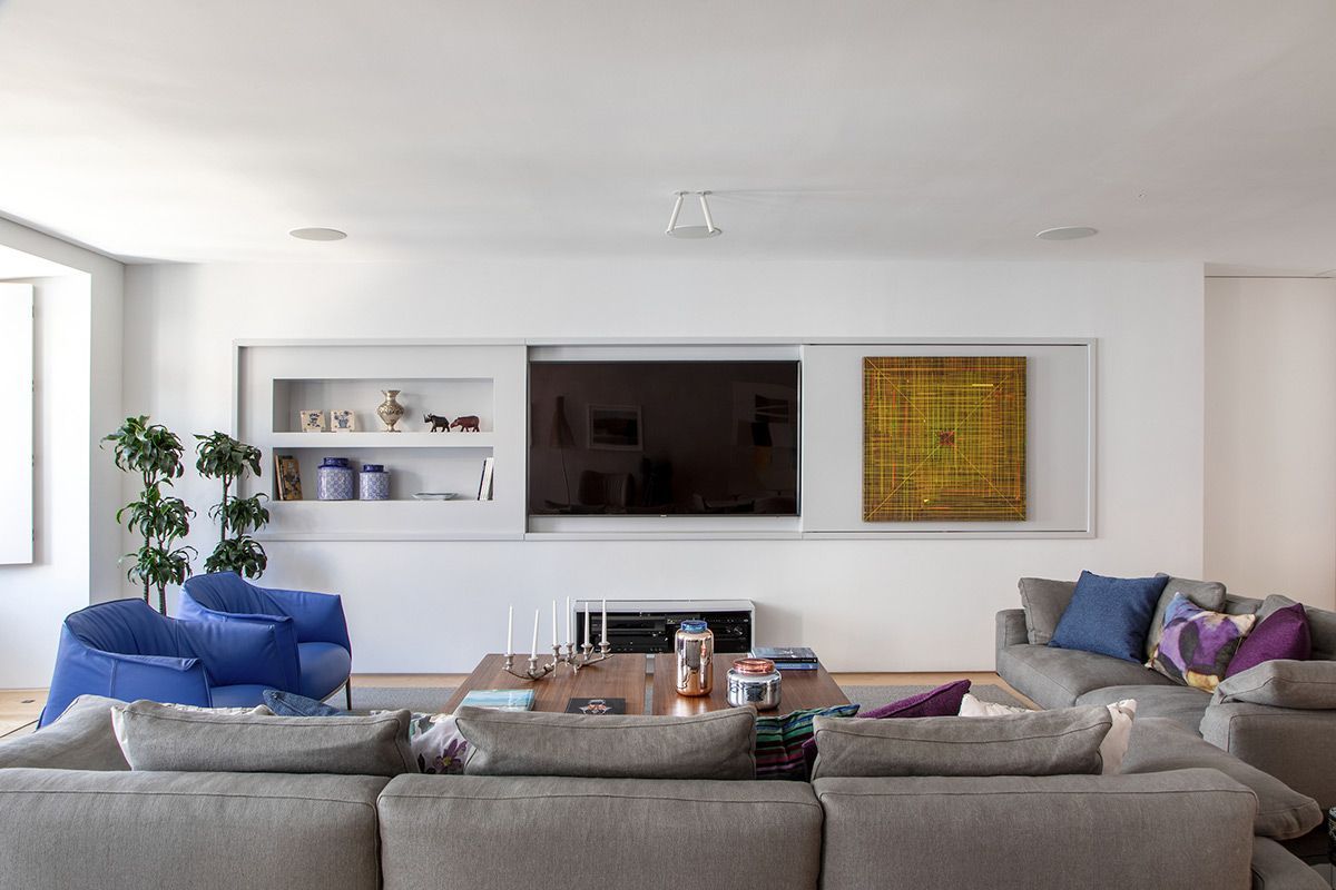 Esconder a TV enquanto essa não estivesse sendo usada, foi outro pedido dos clientes, que desejavam uma sala de estar livre da aparência de “home theater”. Para isso, um painel deslizante enquadrado por marcenaria suspensa foi desenhado, e ficou semi embutido em uma nova parede de gesso, com 20cm de profundidade, para suavizar o volume total.