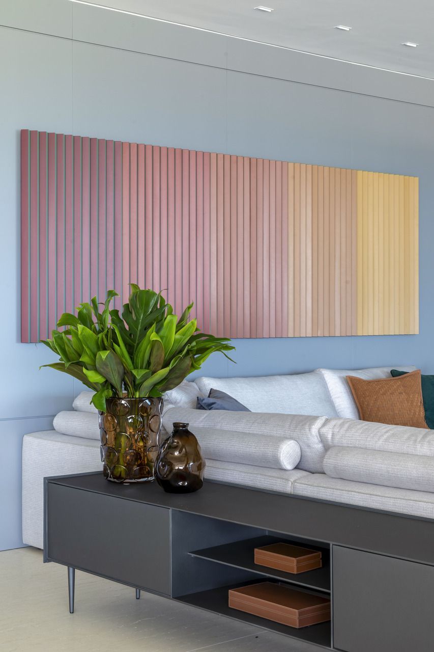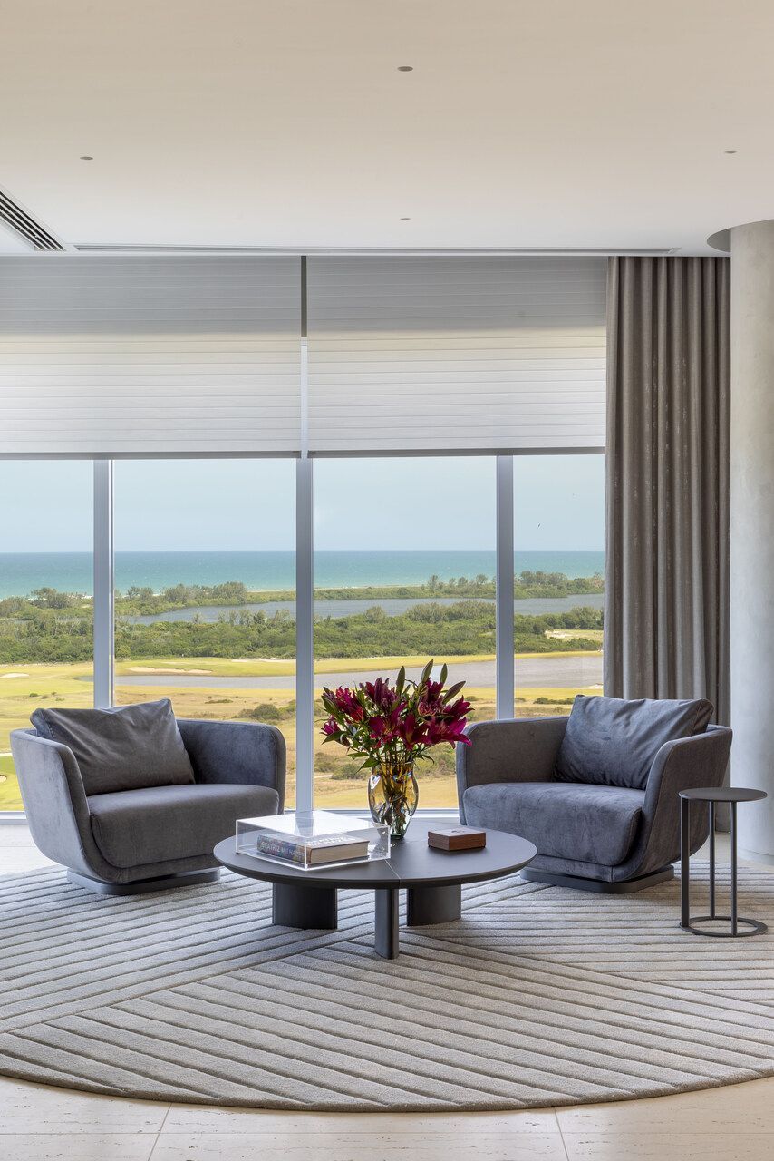 O conceito do projeto aposta na elegância atemporal, combinando materiais nobres como os quartzitos Sensa Macalan e Sensa Matira e o Dekton REM, todos da Cosentino, a uma paleta neutra que valoriza a grande obra do artista Solferini, encomendada durante o desenvolvimento do projeto. Os móveis da sala, todos novos, foram selecionados na Artefacto, incluindo peças assinadas por Patrícia Anastassiadis. Persianas, telas solares, rolôs blackout e toldo blackout são da Amorim, enquanto o piso em mármore travertino Navona, preservado do projeto original, percorre quase todo o apartamento, com exceção dos banheiros.